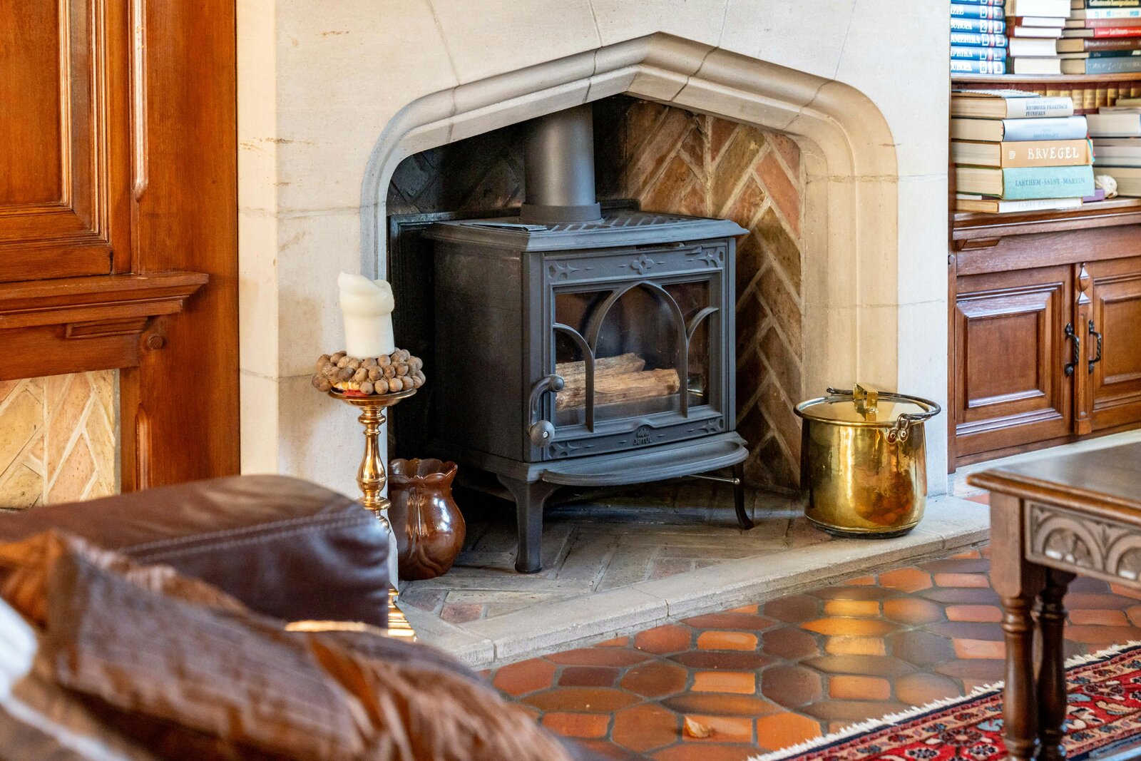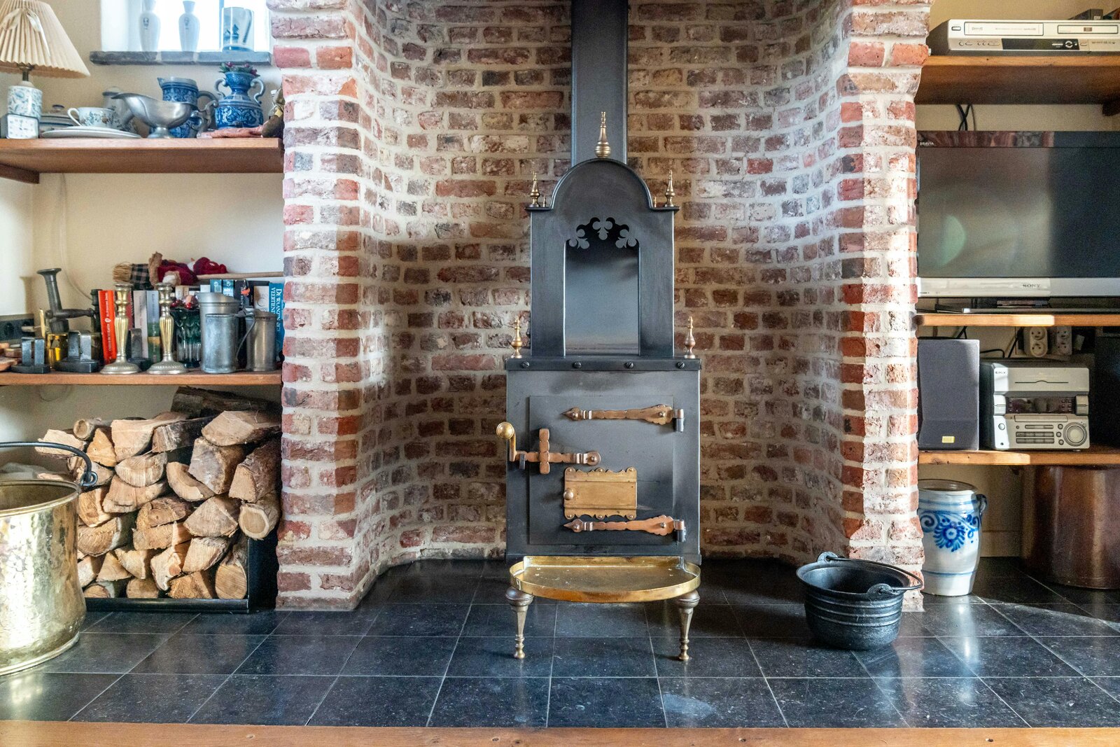 The interior exudes authenticity thanks to elements such as wooden ceiling beams, authentic tiled floors and attractive wood stoves. The house has two spacious living areas and a sun-drenched dining room, which are in direct contact with the park garden through large windows. On the first floor, there are four comfortable bedrooms and a functional bathroom.