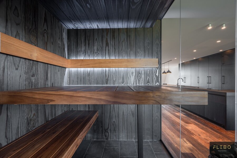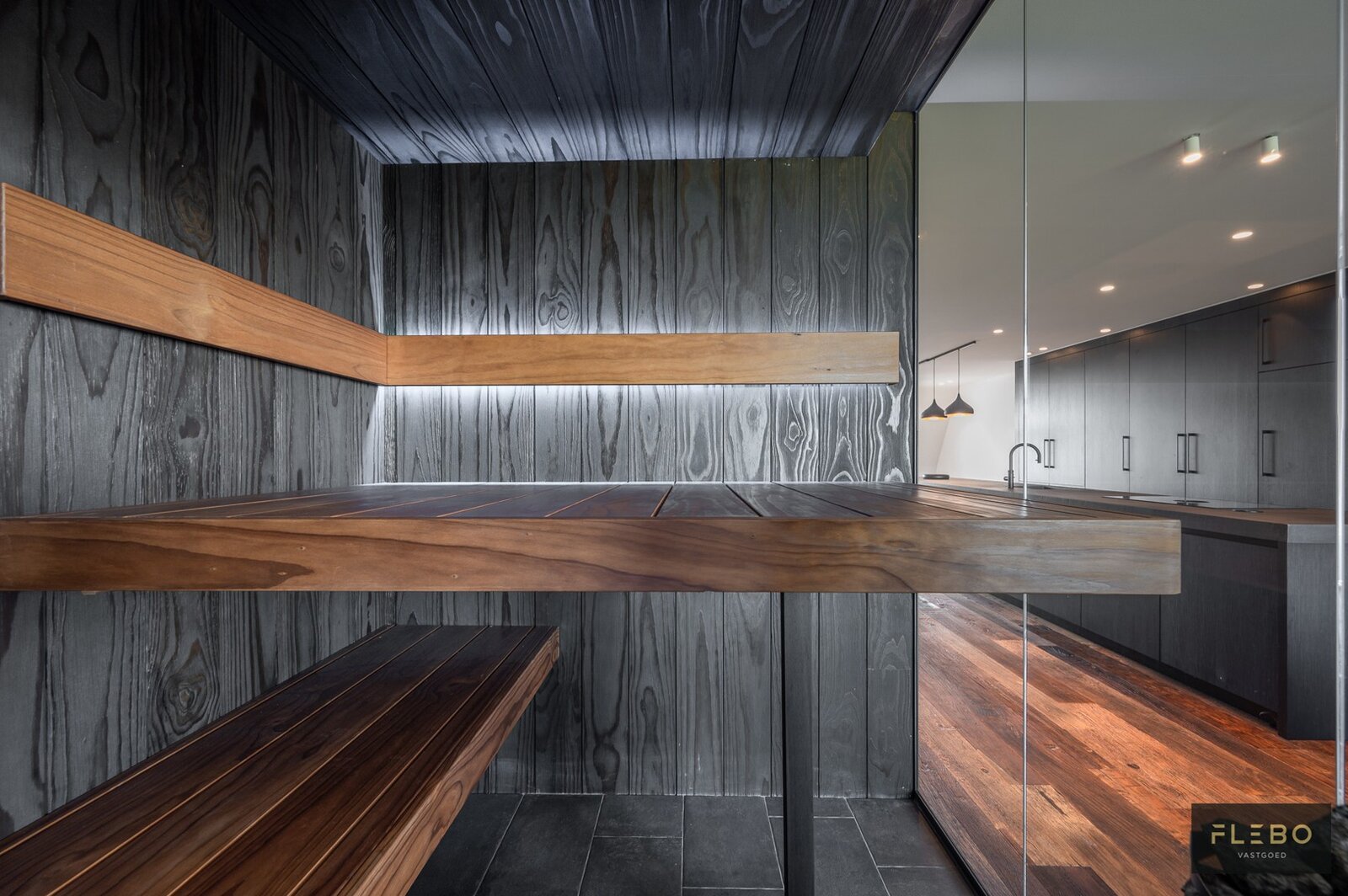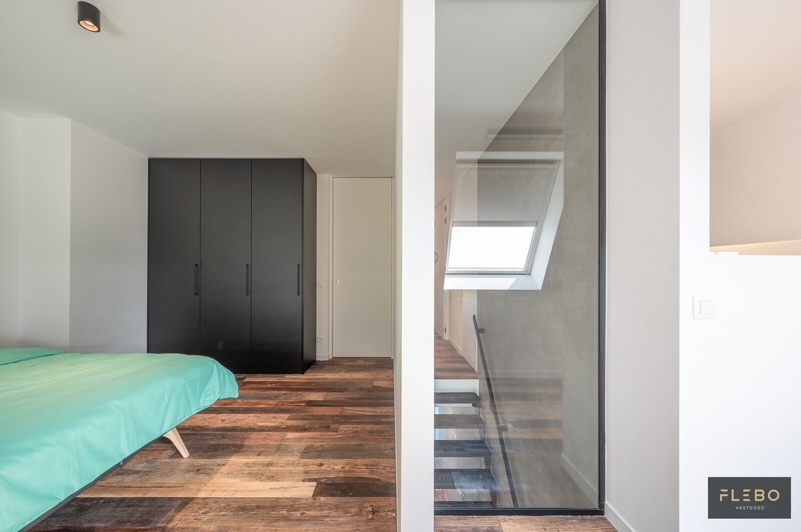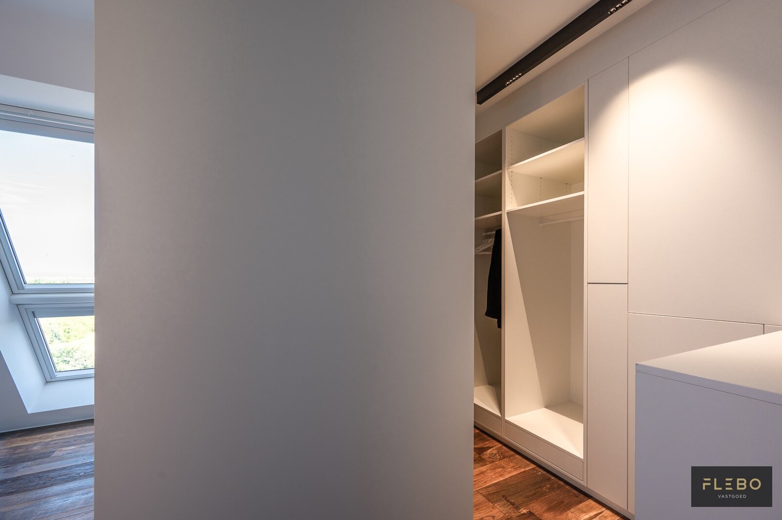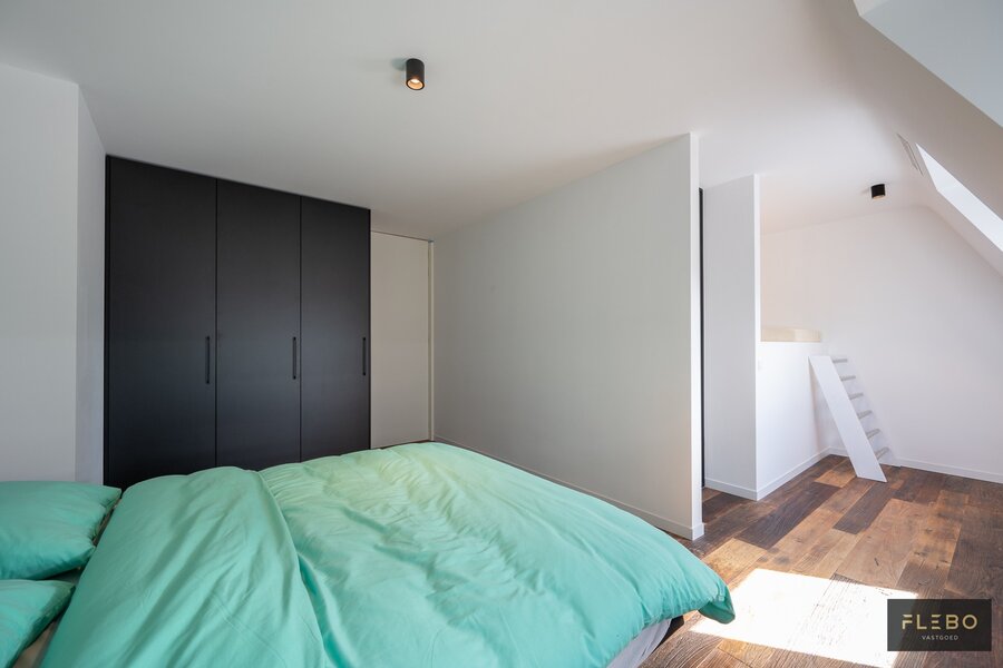 Op de tweede verdieping begeven we ons tot de ‘master bedroom’ met dressingruimte, badkamer met lavabomeubel en inloopdouche, tweede ruime slaapkamer, toilet en bureauruimte/derde slaapkamer. Alle lichten, velux’en, elektronica te bedienen via intelligent domoticasysteem.