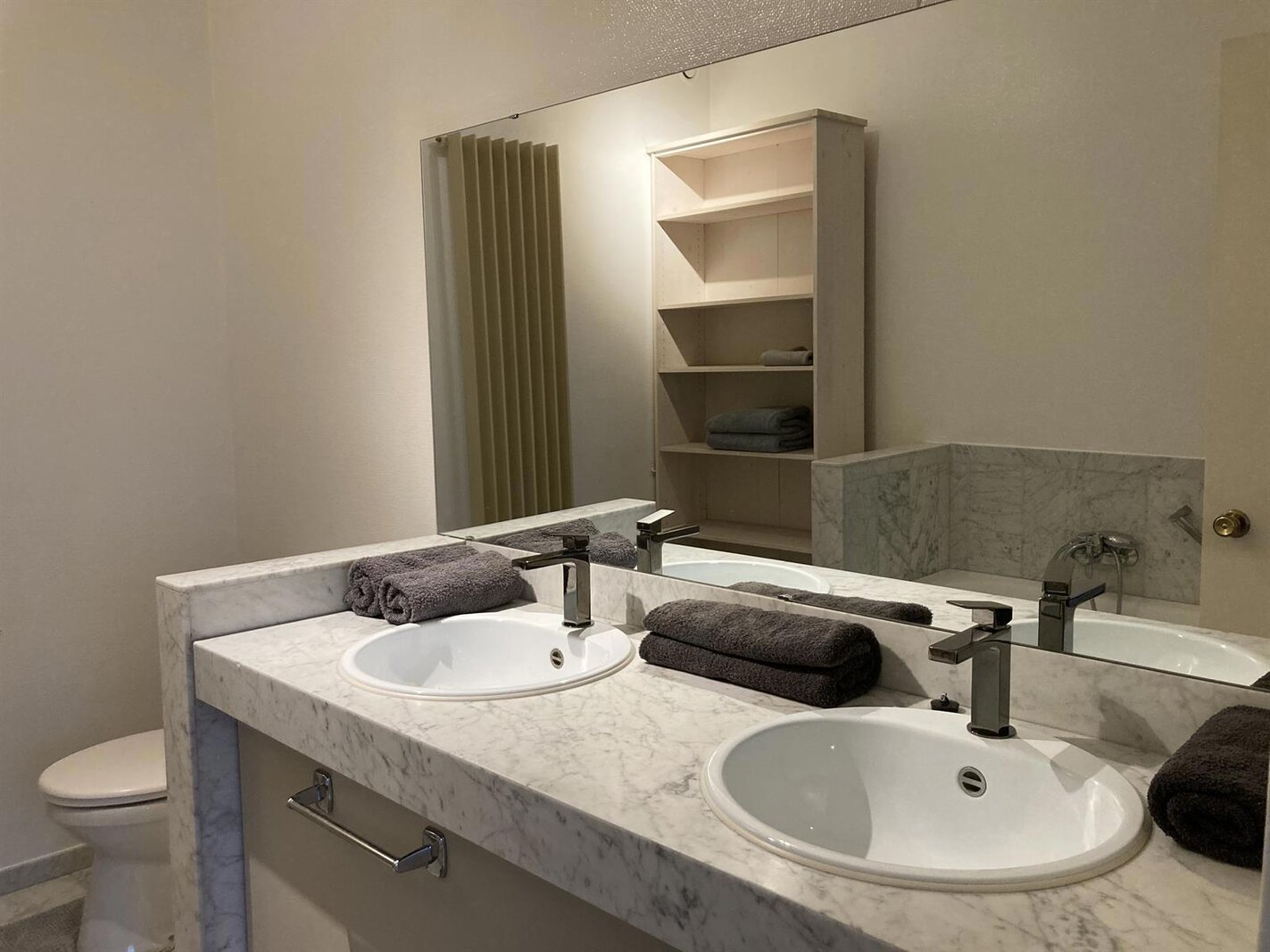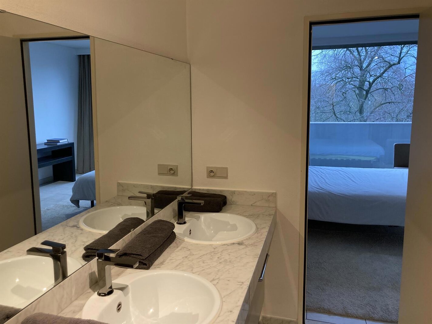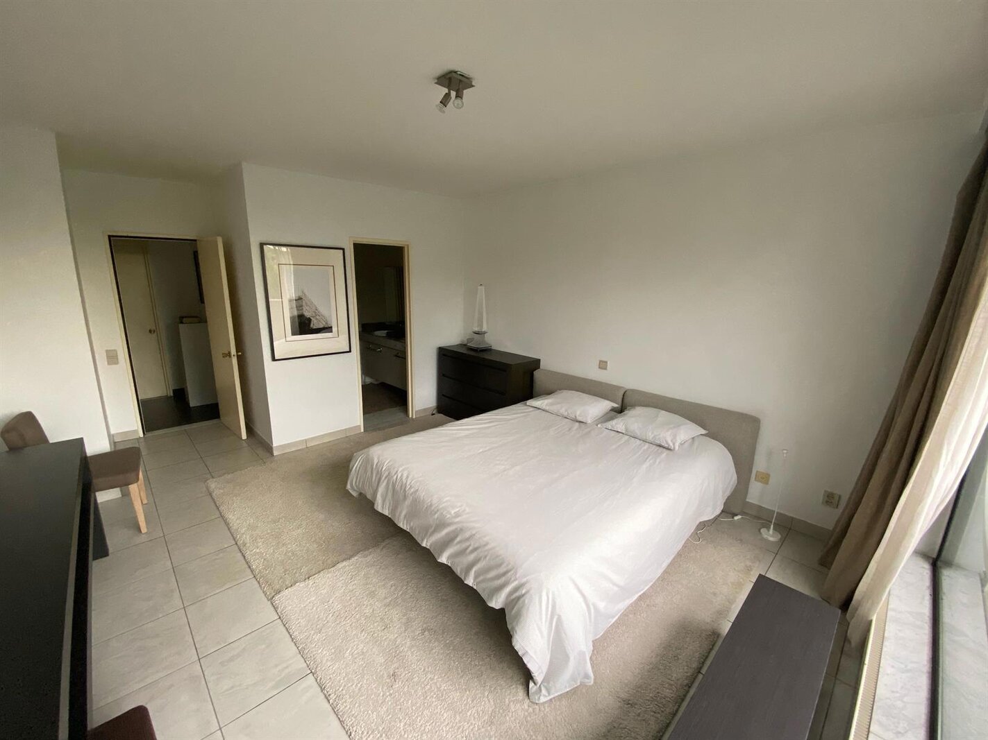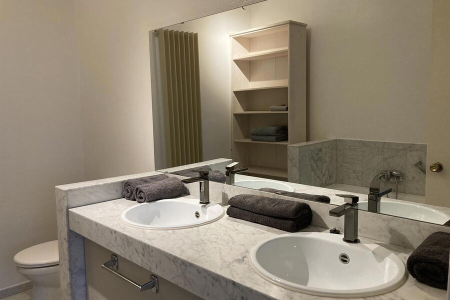 Master bedroom (16 m²) with ensuite bathroom (bath, double sink and toilet). 2nd bedroom (12 m²) with shower room (shower and washbasin).