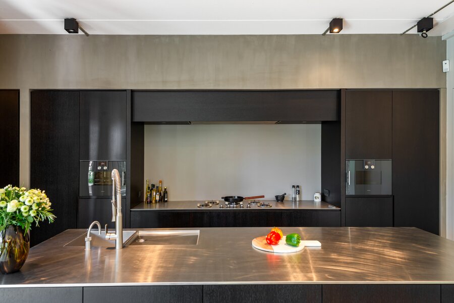 Het private terras met ruime berging grenst direct aan de keuken en eetruimte en is zowel vanuit de leefkeuken als de werkkeuken toegankelijk via grote schuiframen. Deze verbinding tussen binnen en buiten versterkt het open karakter van de loft.