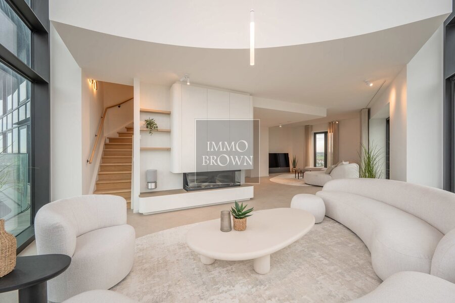Upon entering, you step into the main living room with large floor-to-ceiling windows and a gas fireplace that creates warmth and atmosphere. The modern kitchen with an extensive kitchen island connects seamlessly to the dining area, which features a second gas fireplace and offers views over the greenery of Knokke and the sea – perfect for entertaining guests.