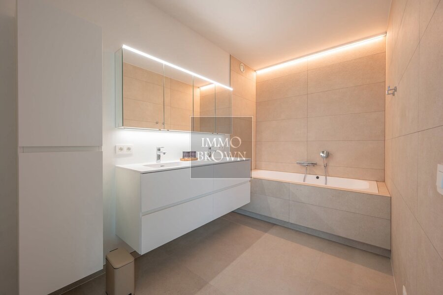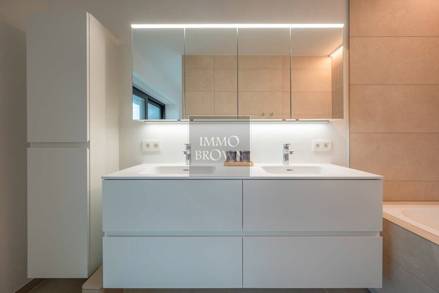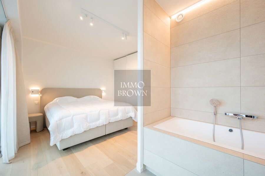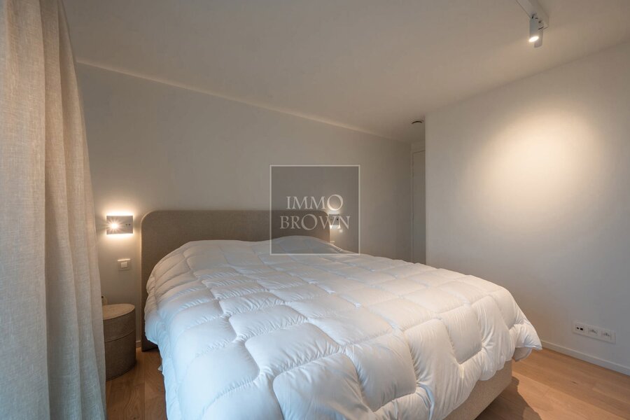 The apartment also includes a second lounge and a flexible room that can be arranged as an office, library, sauna, … On the upper floor there are four spacious bedrooms, each with its own en-suite bathroom, as well as a practical laundry room.