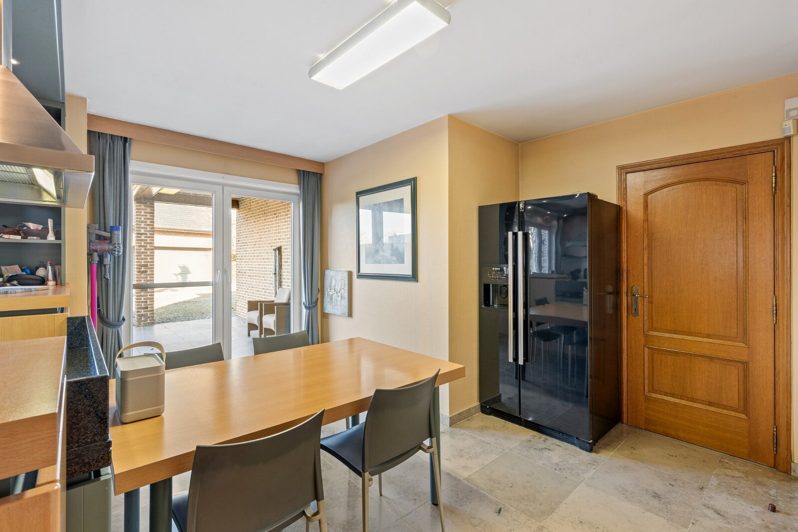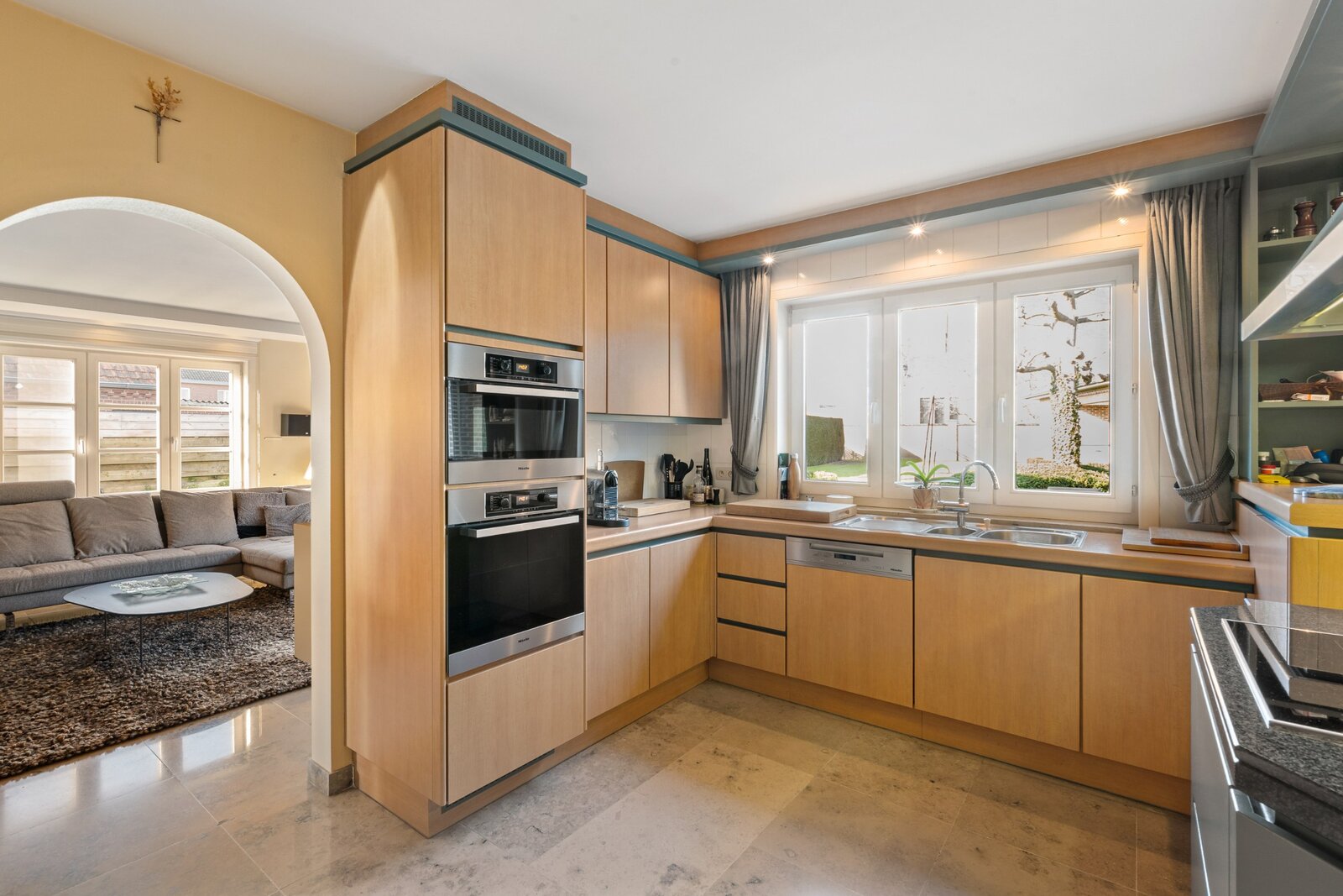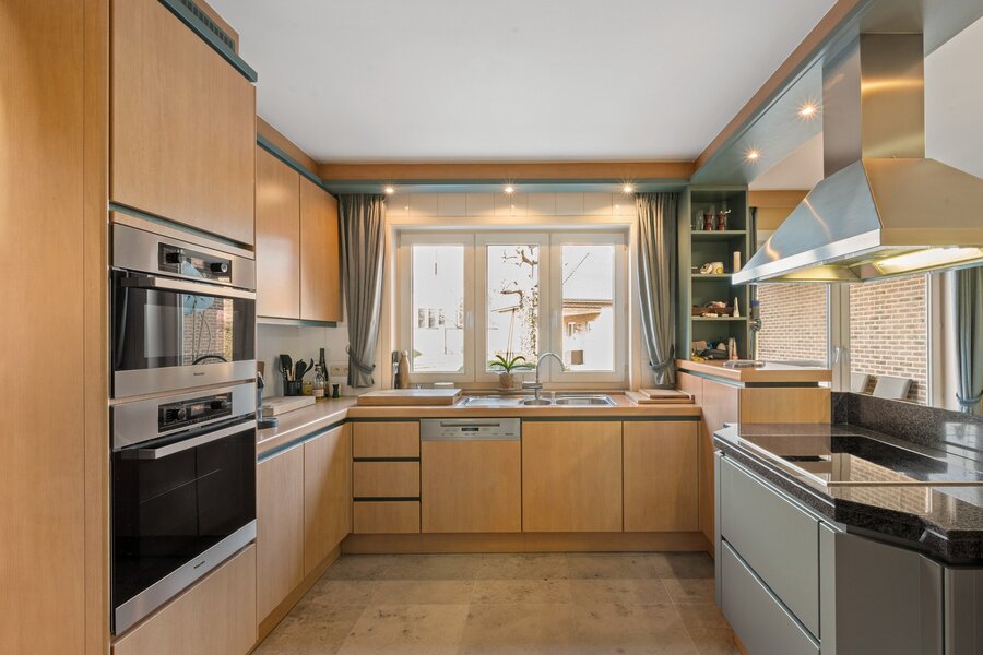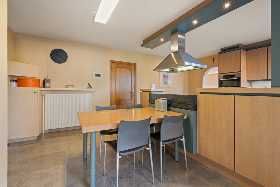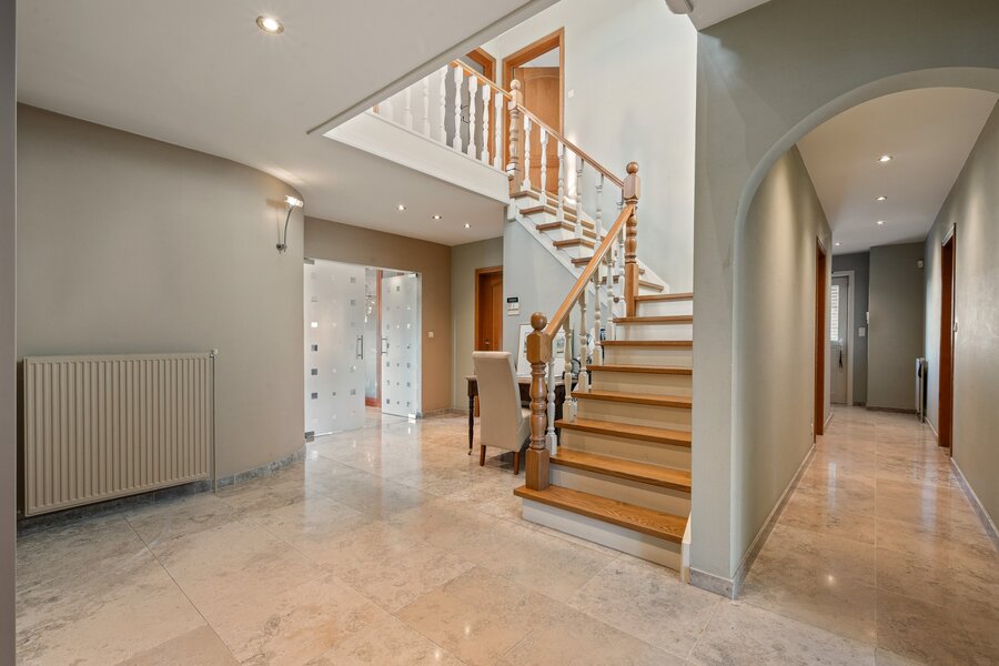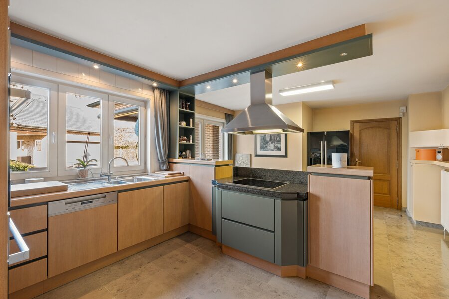 De royale inkomhal verwelkomt u in een lichtrijke leefruimte waar gezelligheid en ruimte centraal staan. Aansluitend bevindt zich de volledig uitgeruste keuken met zicht op de tuin – ideaal voor wie houdt van contact tussen binnen en buiten.
