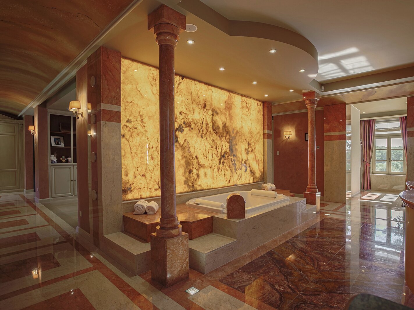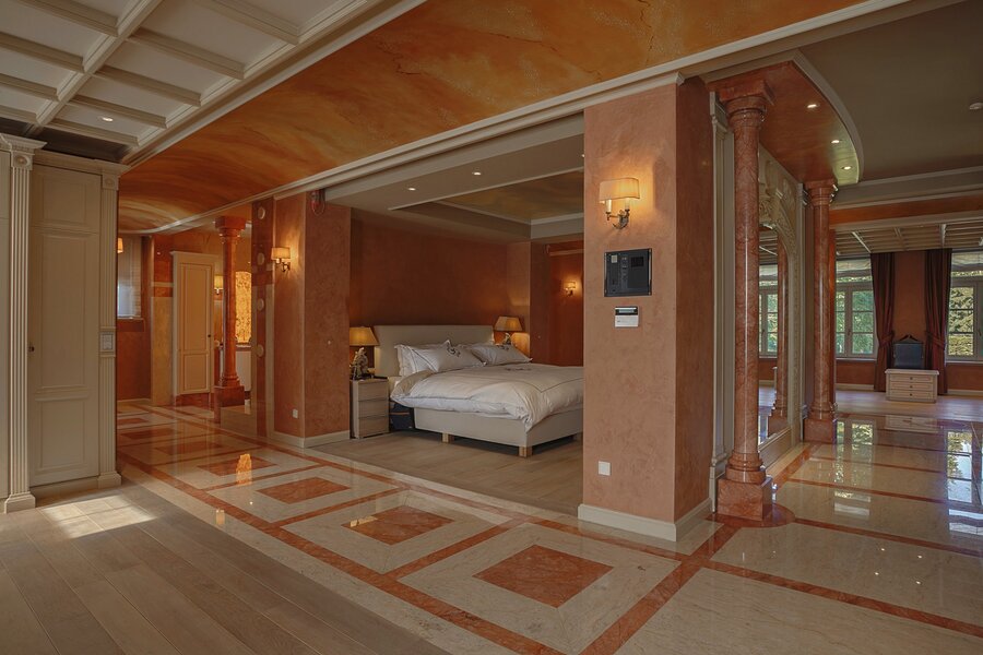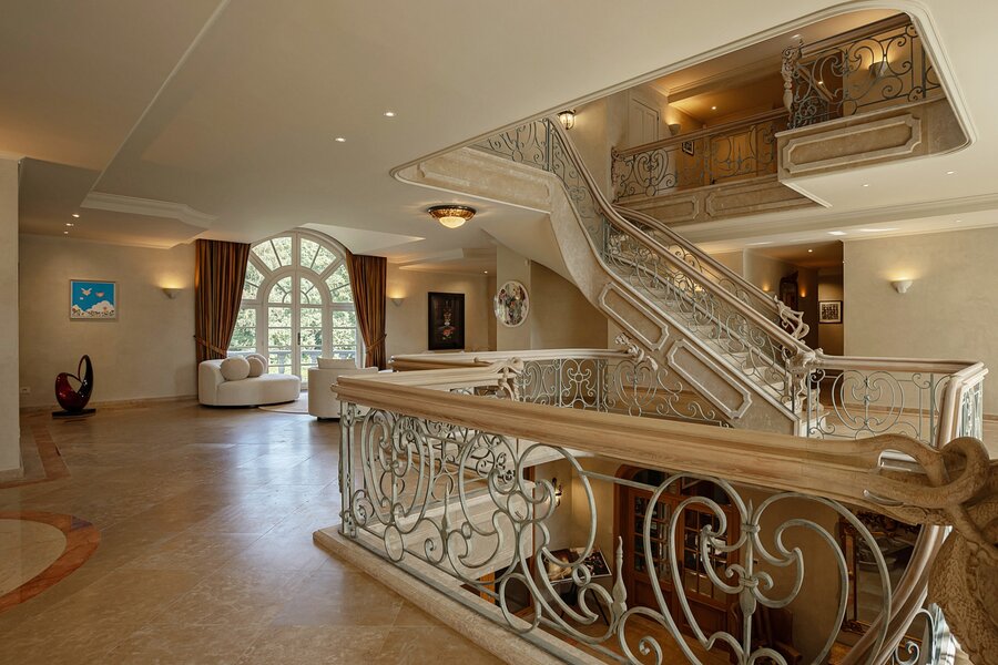 Upon entering, the eye is drawn to the spacious reception hall, which provides access to several living areas, including a lounge, dining room, breakfast area, fully equipped kitchen with utility room, cloakroom, separate entrance hall with lift and office space. On the first floor, there is a hall with a sitting area and access to several terraces, a master suite with two dressing rooms and a bathroom, three bedrooms, three bathrooms, and a kitchenette. The second floor has three bedrooms, each with its own bathroom. The third floor comprises relaxation areas and technical rooms.