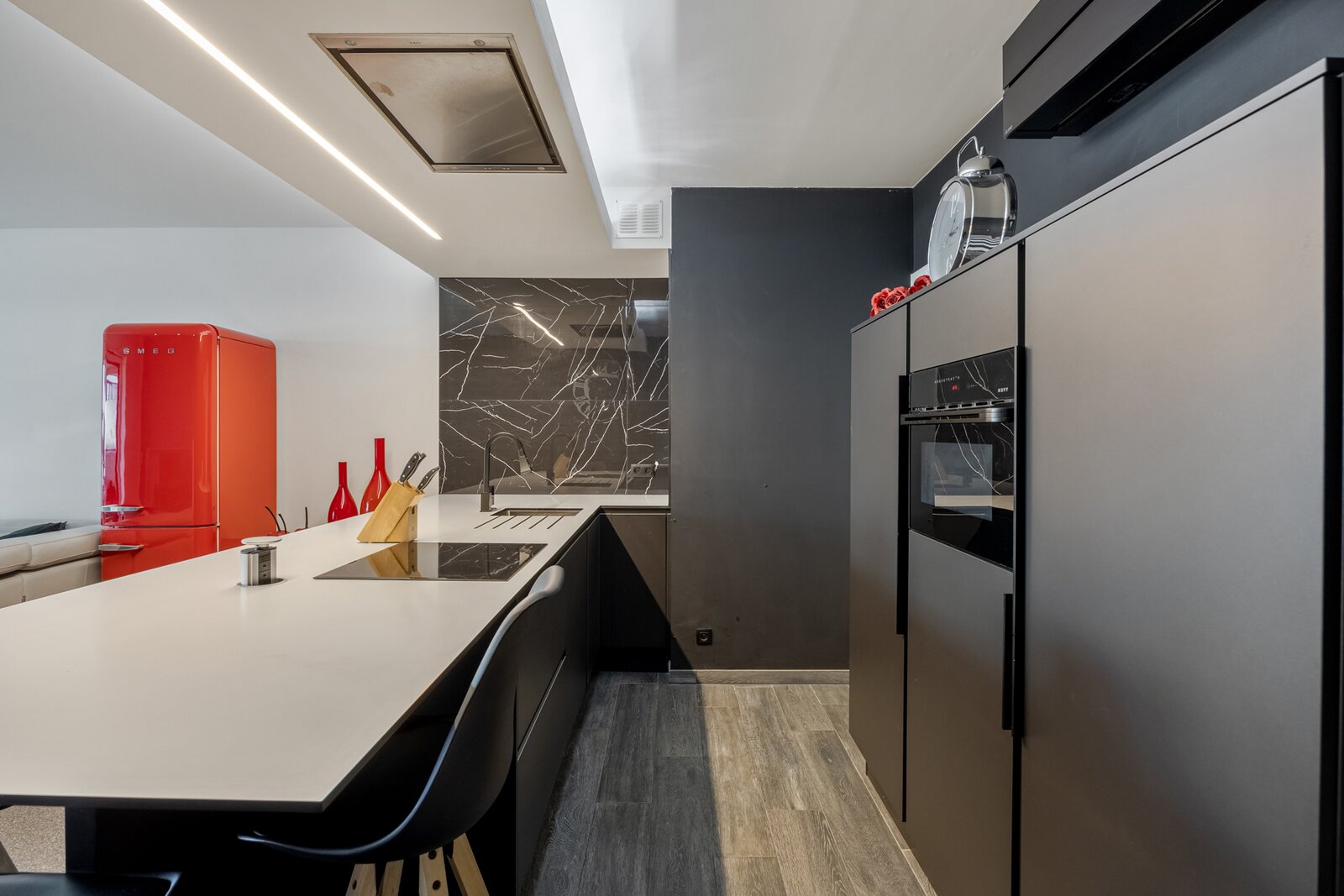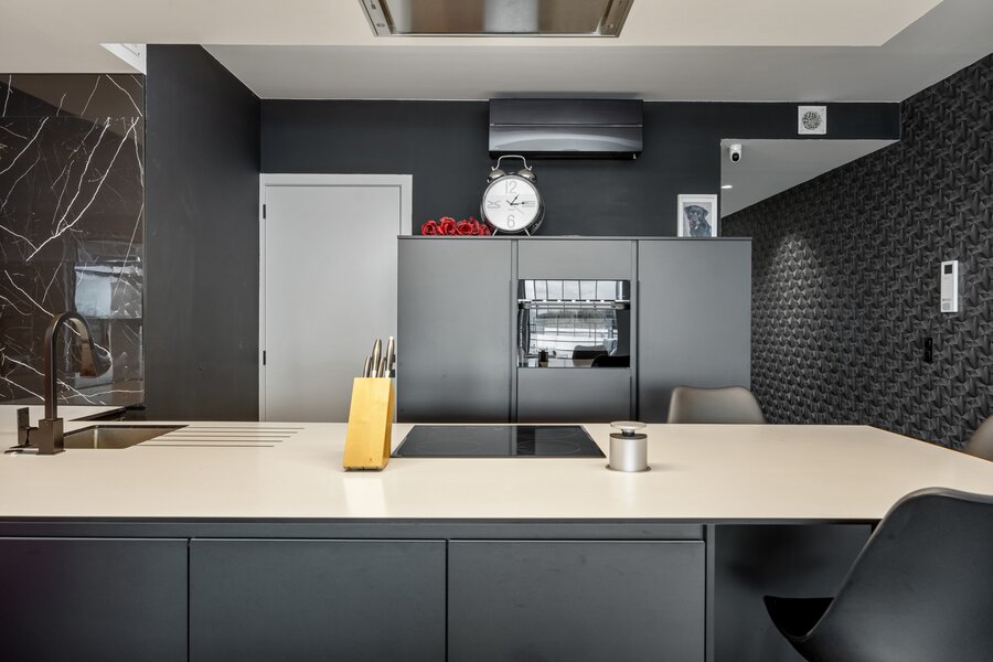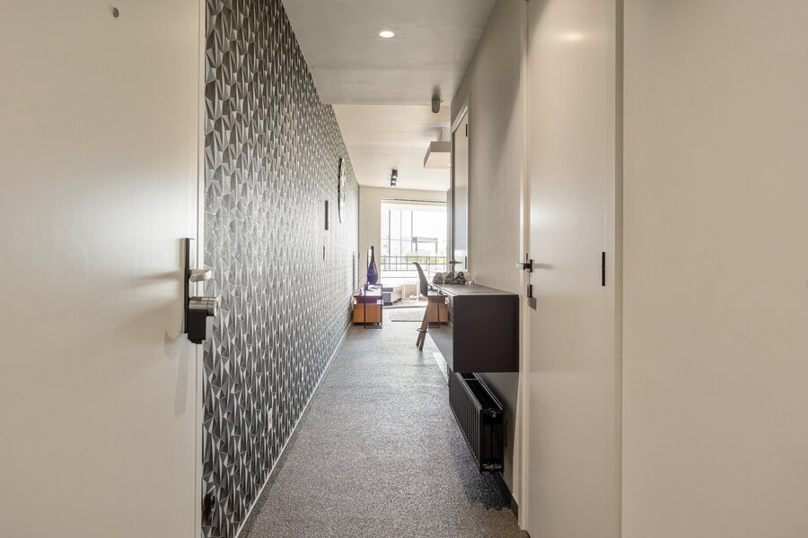 Je bereikt dit appartement via de lift of trap en stapt binnen in de diepe inkomhal met aan de linkerzijde eerst het gastentoilet. Daarna betreed je de woonkamer met open keuken en ingerichte berging. De open keuken bestaat uit een ruim kookeiland met inductie-kookvuur, ingebouwde afzuigkap, afwasmachine, combi-oven en vaste geïntegreerde ontbijthoek. Opberg- en werkruimte is hier voldoende aanwezig. Daarnaast zorgt de volledig ingerichte berging voor extra ruimte voor provisie en huishoudproducten.