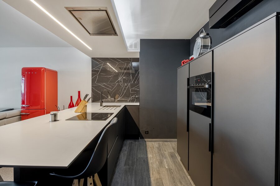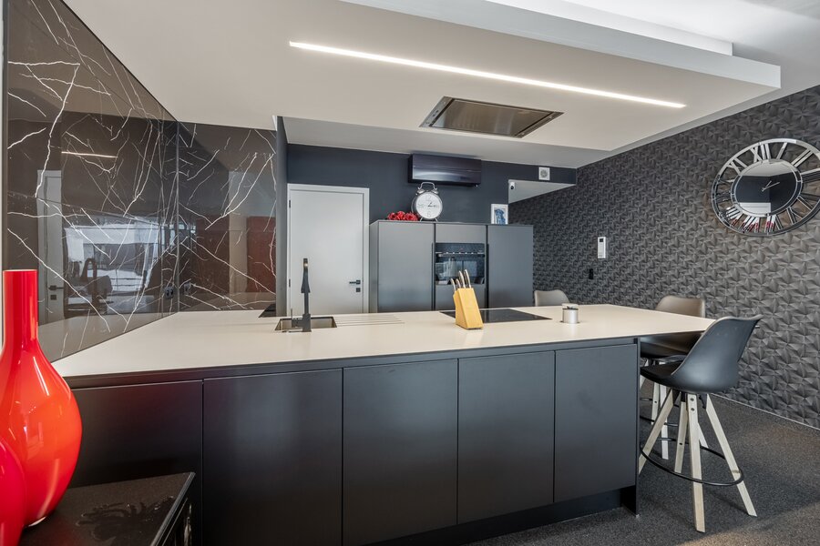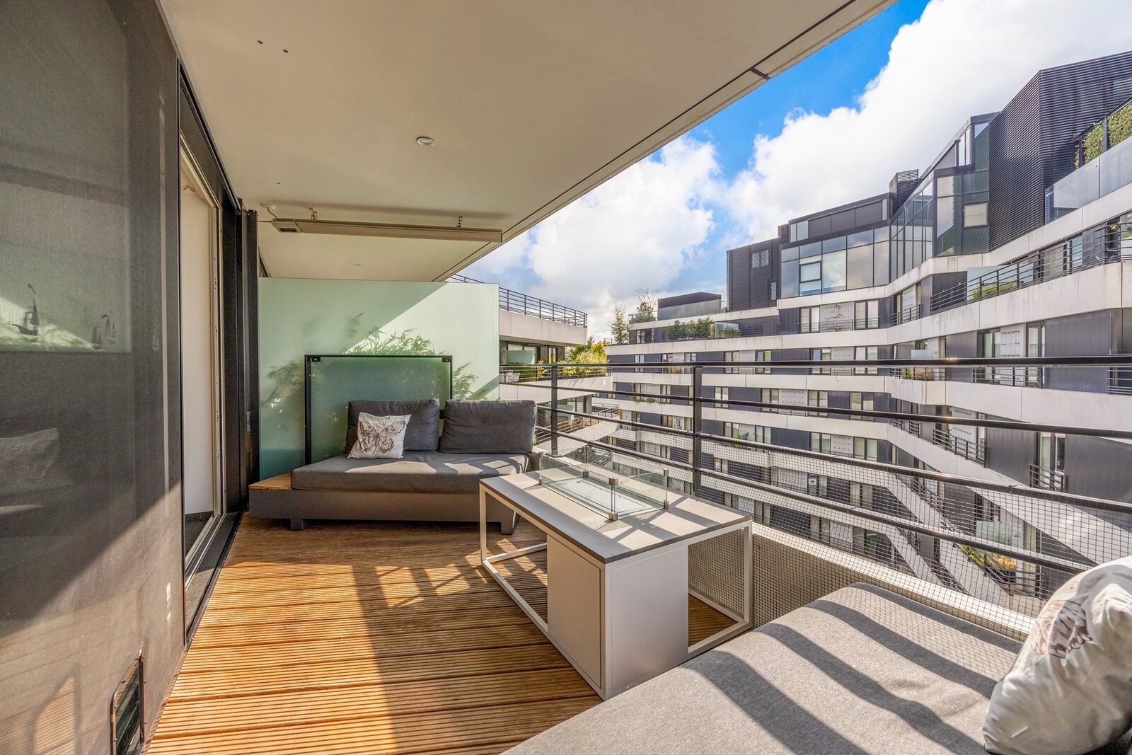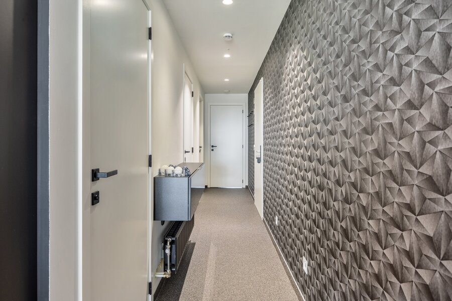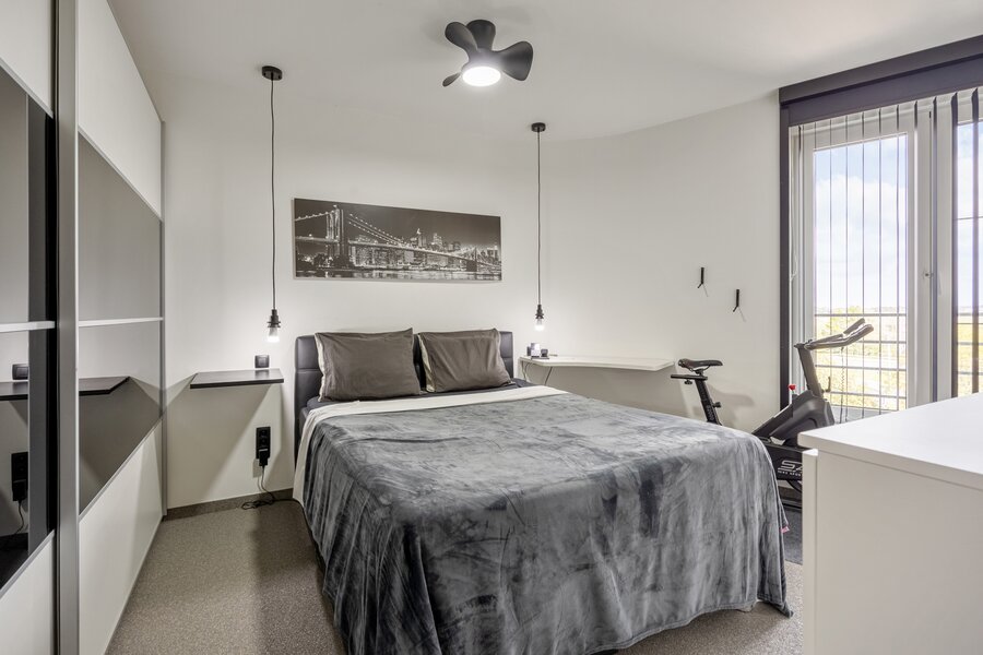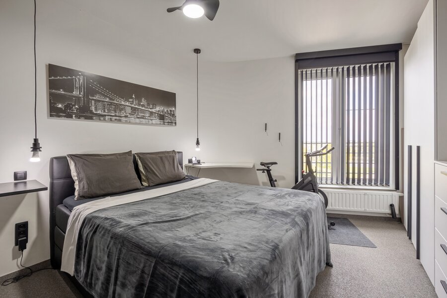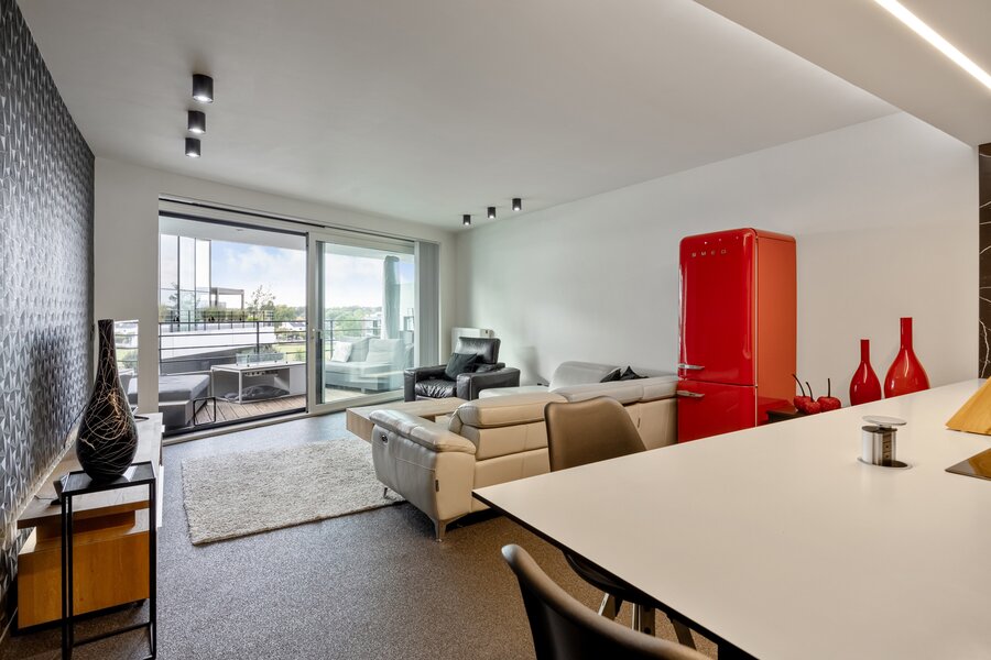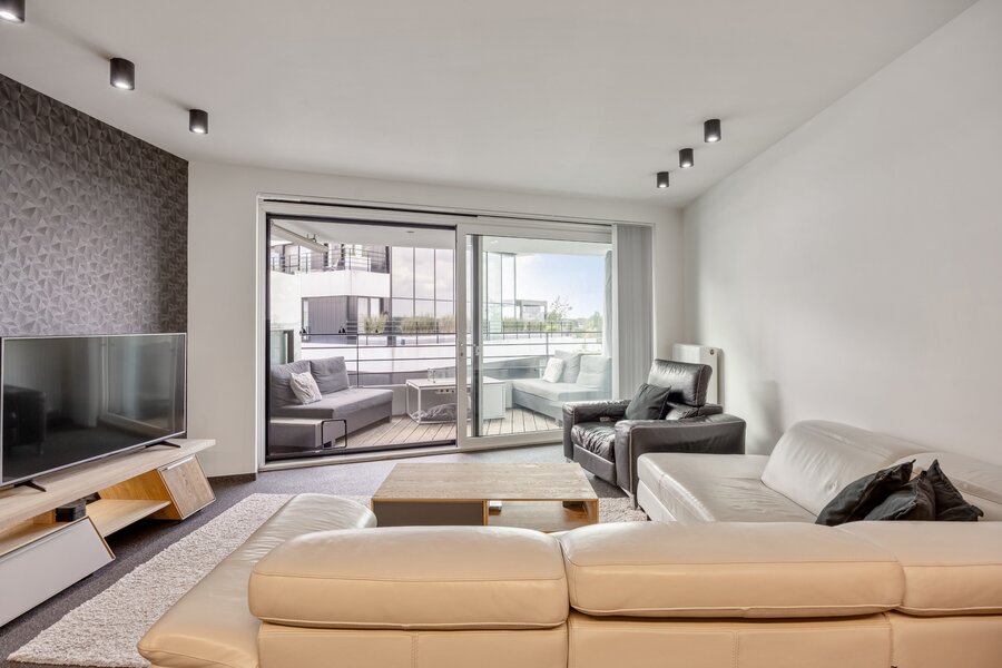 Dit appartement werd ingericht in strakke stijl. De doorgetrokken steentapijt leidt verder naar het zuidelijk georiënteerd, met bankiraï bekleed terras van 12m2. Voor de zonnige dagen is deze kant van het appartement voorzien van elektrische gordijnen aan de binnenzijde en airconditioning (eveneens in de master bedroom). Voor de koudere dagen, hangt de terrasverwarming reeds klaar.
