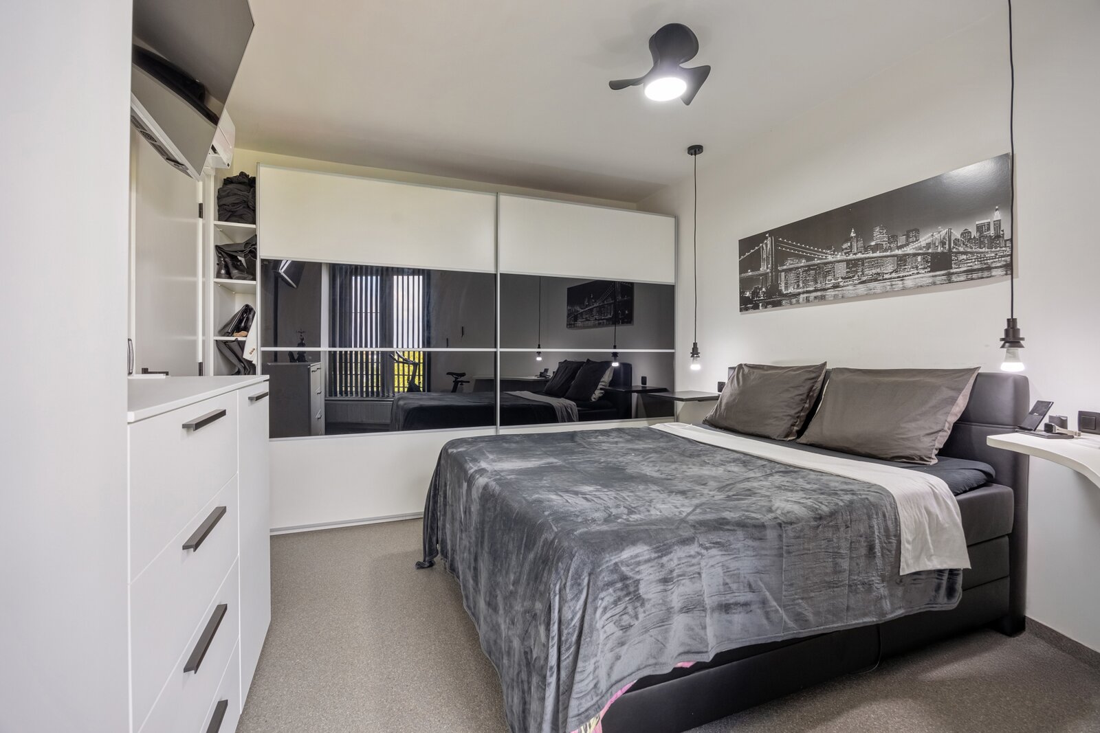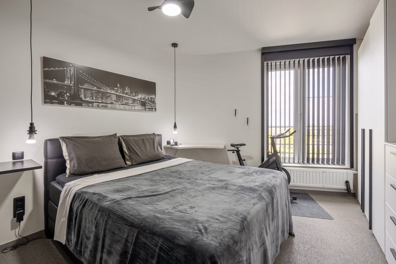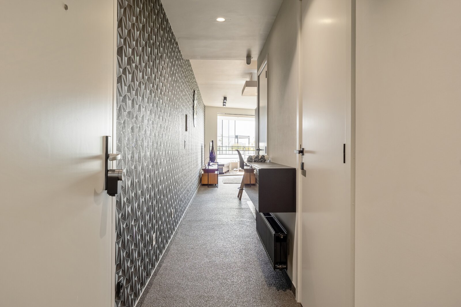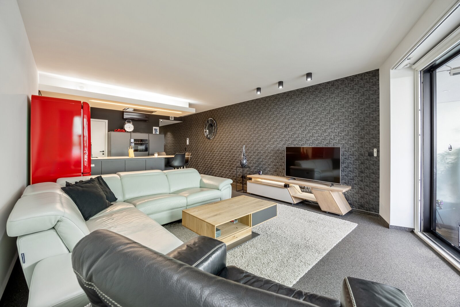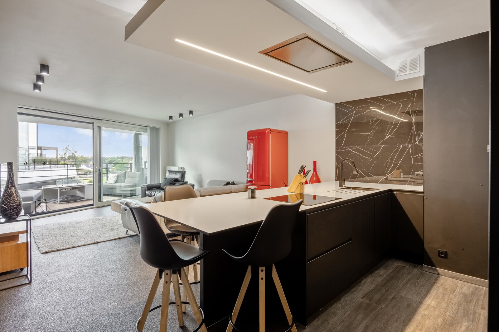 Dit appartement werd ingericht in strakke stijl. De doorgetrokken steentapijt leidt verder naar het zuidelijk georiënteerd, met bankiraï bekleed terras van 12m2. Voor de zonnige dagen is deze kant van het appartement voorzien van elektrische gordijnen aan de binnenzijde en airconditioning (eveneens in de master bedroom). Voor de koudere dagen, hangt de terrasverwarming reeds klaar.