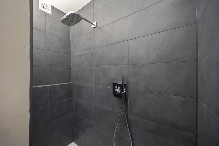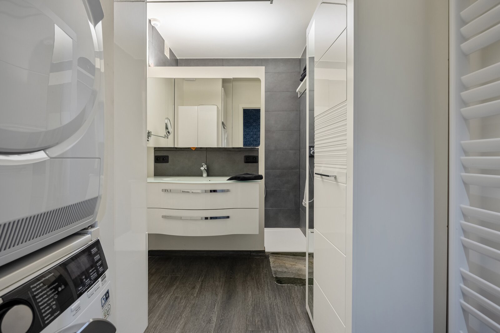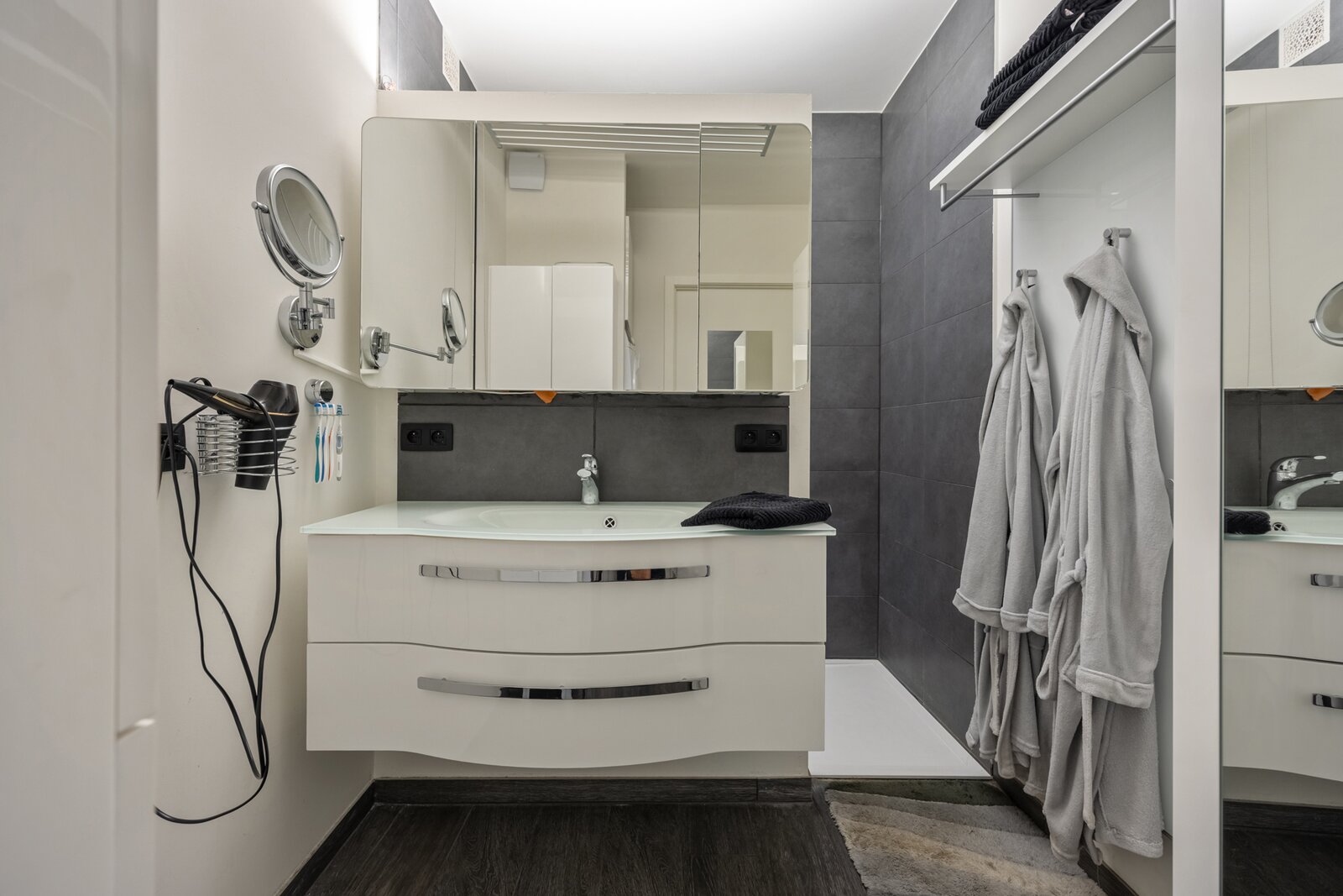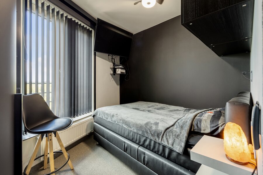 De hal leidt verder naar de badkamer die werd uitgerust met een ingebouwde washoek, een ruim badkamermeubel, extra kasten, handdoekenradiator en een XL-inloopdouche. Ten slotte leidt de nachthal naar de twee ruime slaapkamers, uitgerust met elektrische verduisteringsgordijnen.