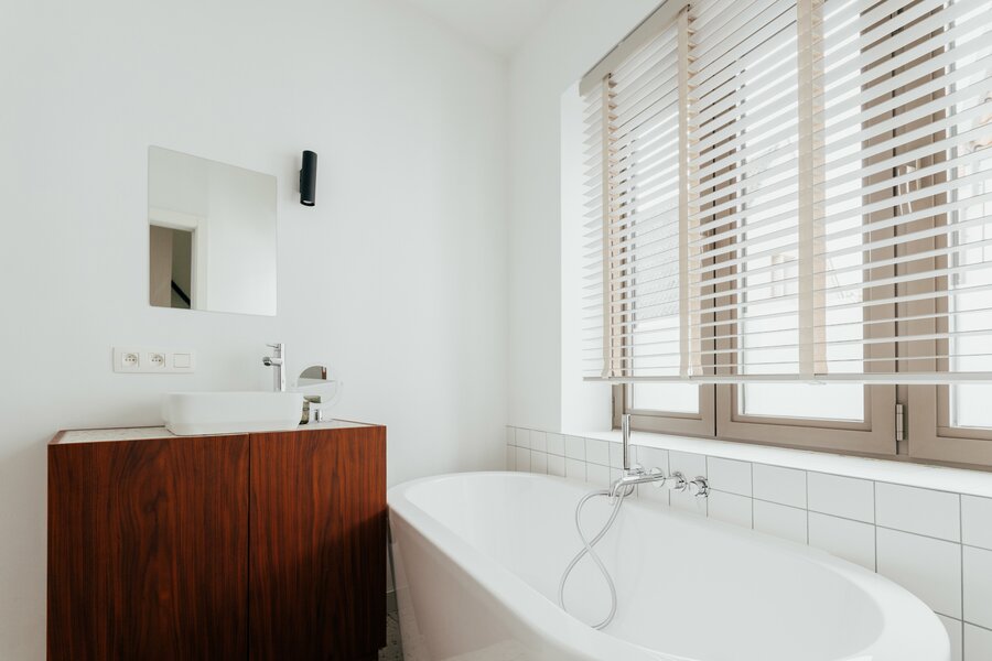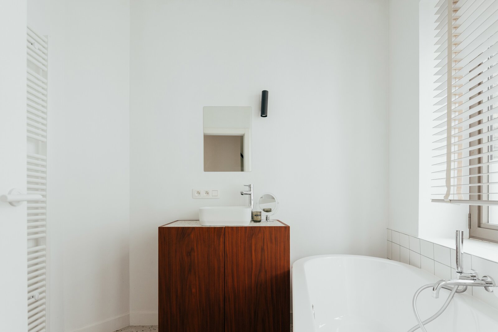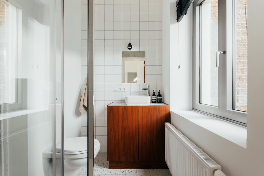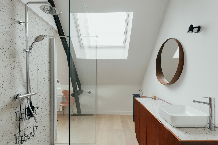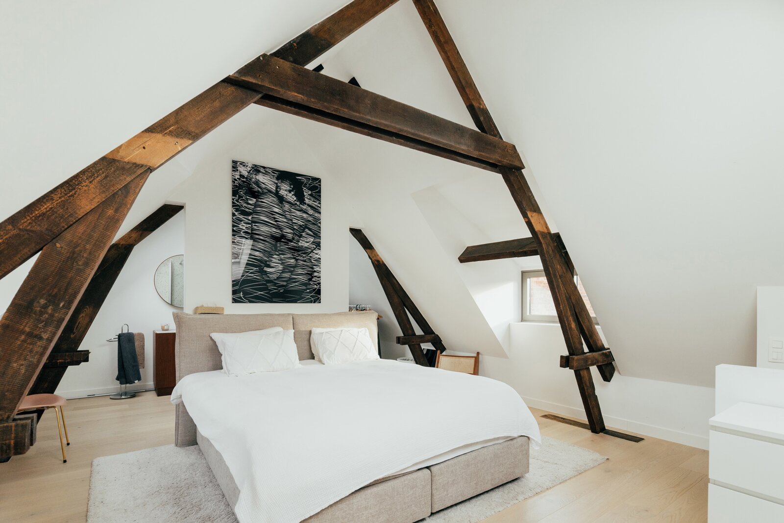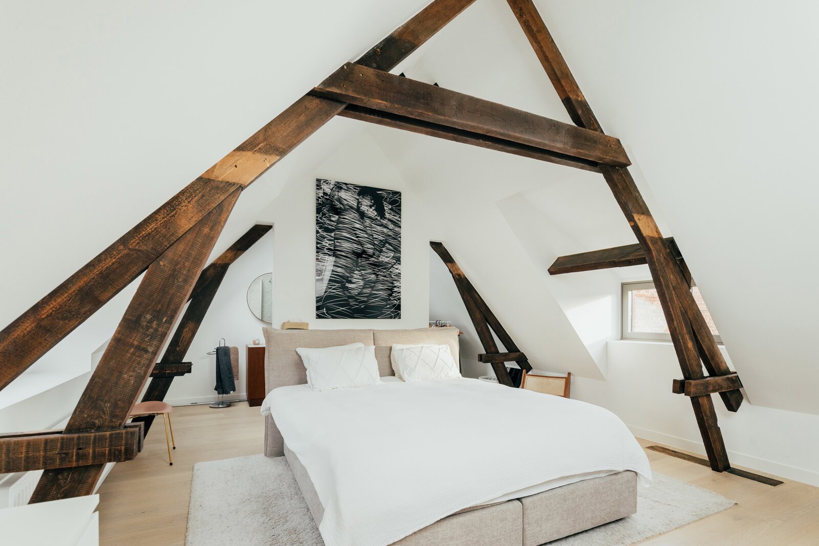 A stylish home office leads to the charming city garden. On the first floor, there are two bedrooms, each with its own bathroom. A great bonus is the sunny terrace with views of St Rumbold’s Tower. The main bedroom on the second floor offers true hotel vibes, with exposed beams and an en-suite bathroom. A wonderful place to wake up.