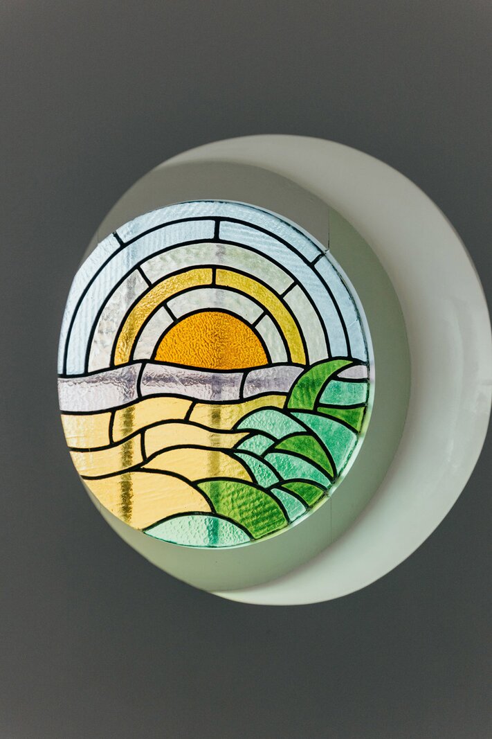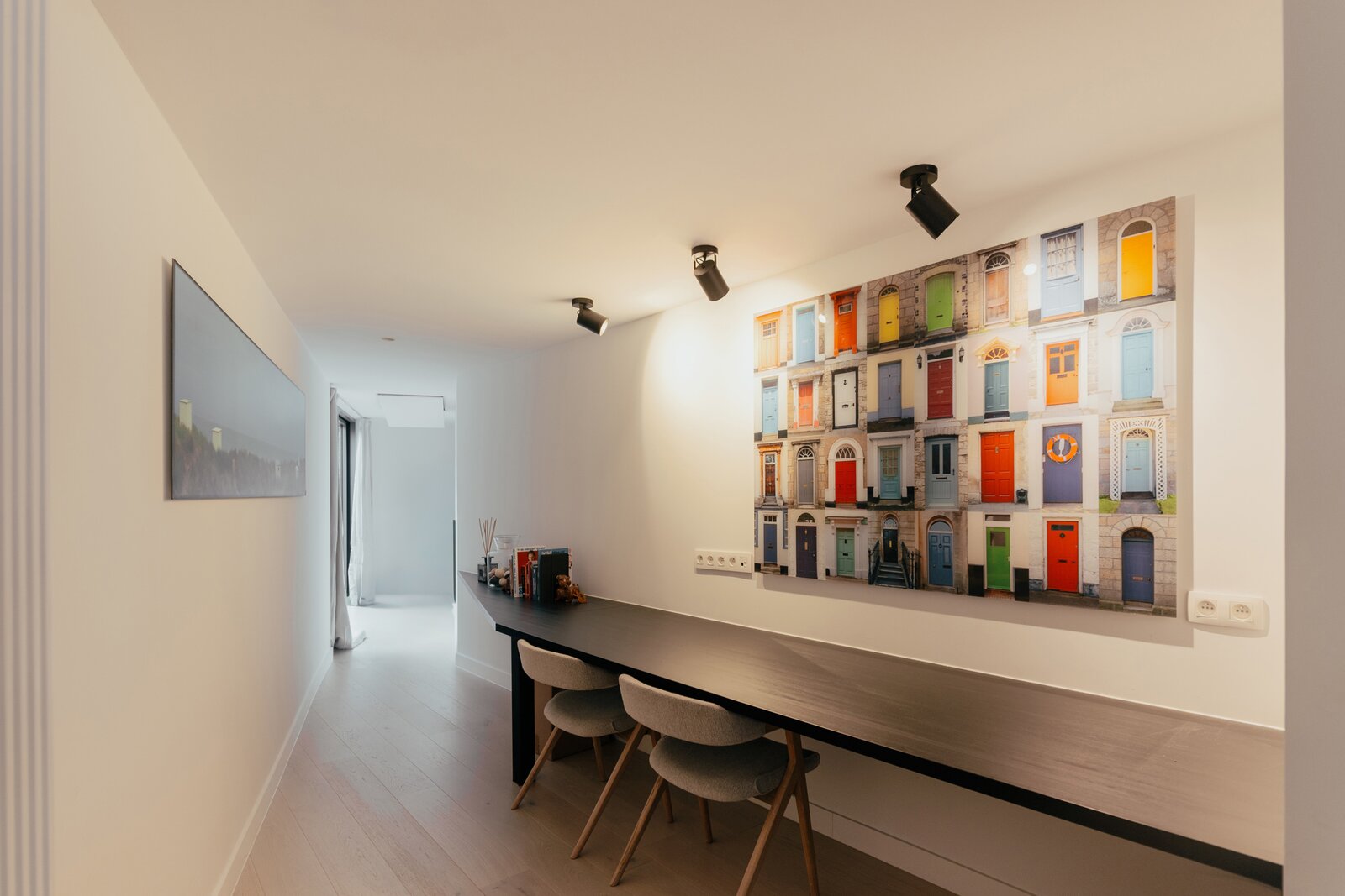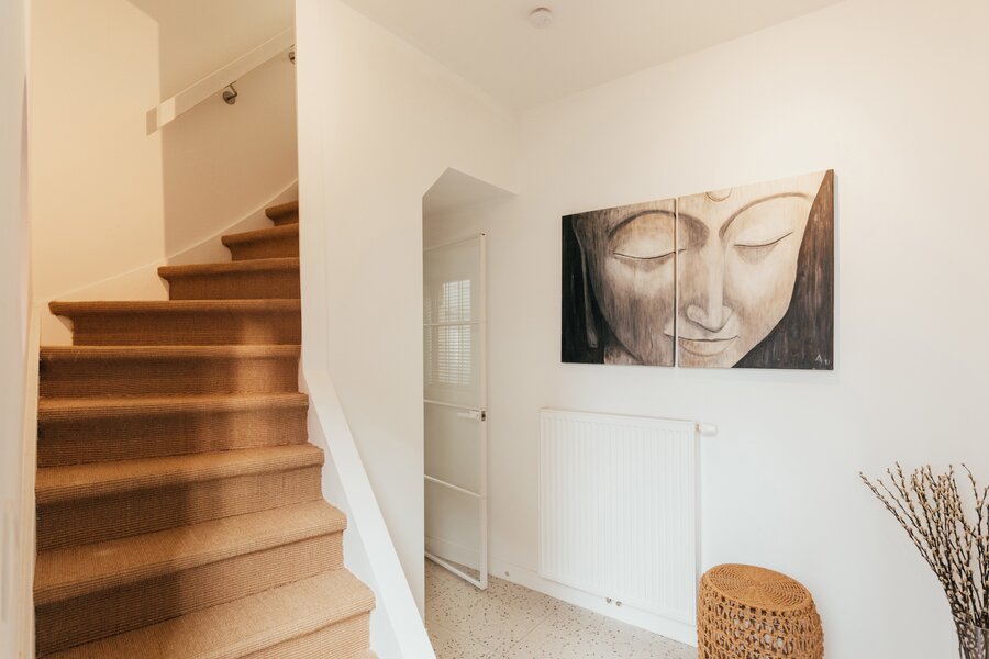 This property was fully renovated in 2023, combining original character with contemporary comfort. Entrance hall with cloakroom, laundry room and guest toilet. The L-shaped living area is filled with natural light and features an open kitchen, dining area and cosy lounge. The original round stained-glass window is a real eye-catcher. From the modern kitchen, you access a separate storage room with built-in cabinets and the spacious garage. An additional studio room is located above the garage.