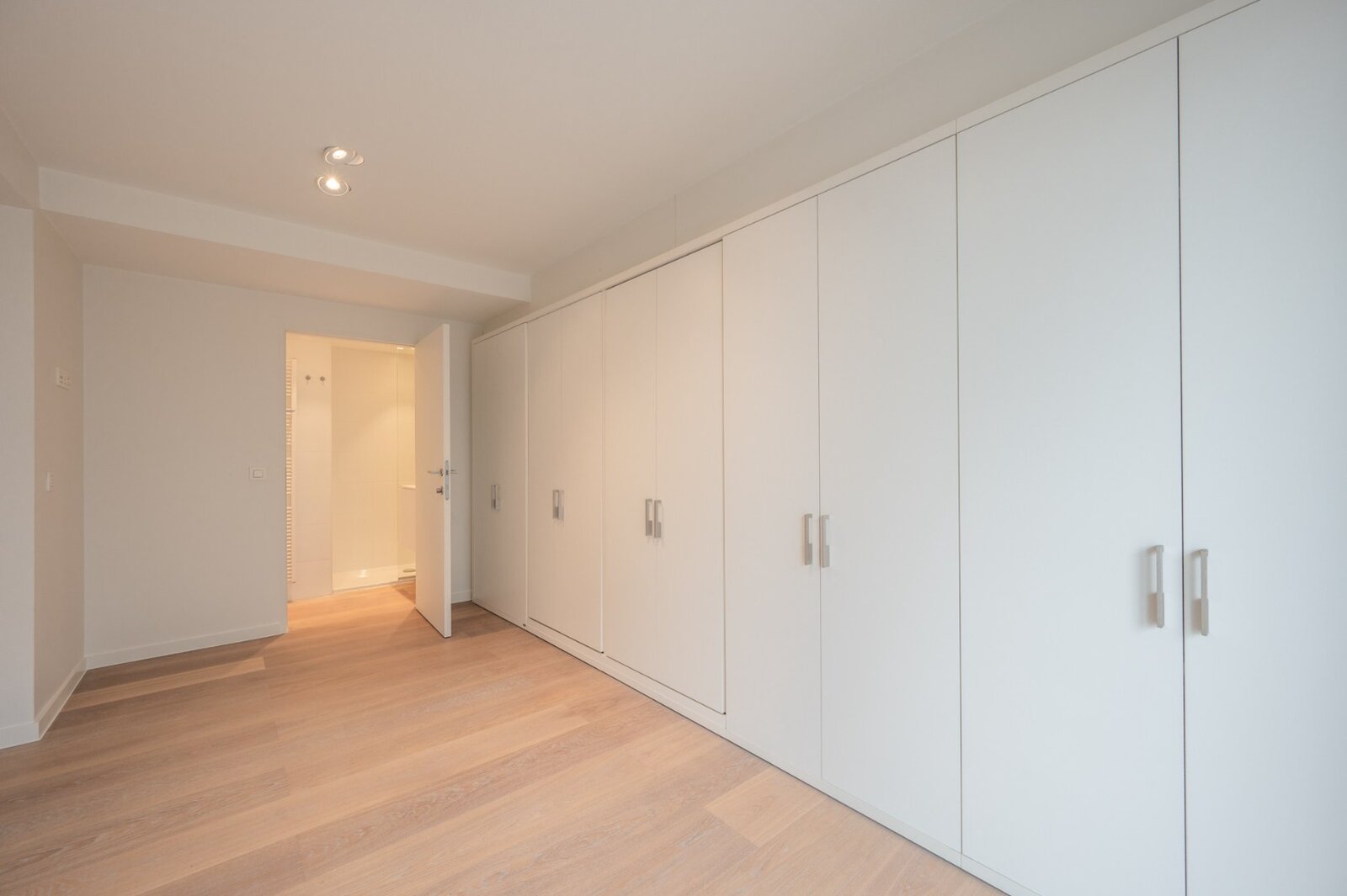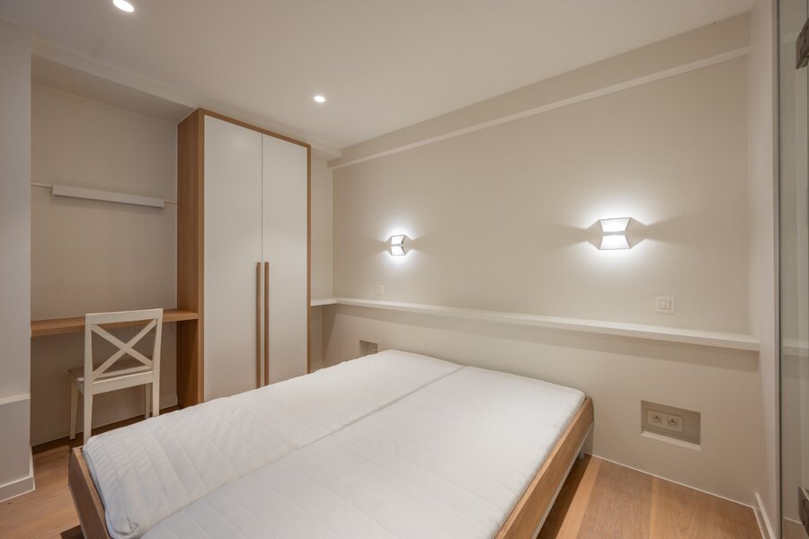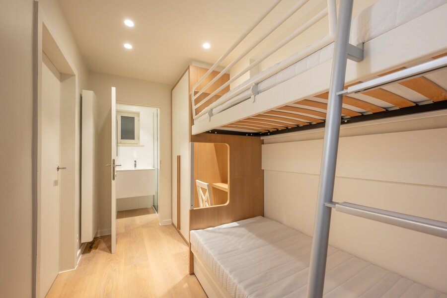 Slaapkamer met ingemaakte kast en aanpalend douchekamer, 2e kleinere kamer met stapelbed en douchekamer, in de woonkamer is er een schuifdeur naar een 3e slaapkamer met ingemaakte kasten en aanpalend douchekamer met toilet.