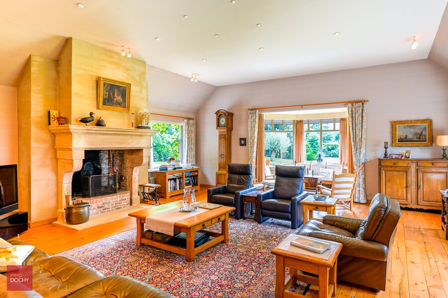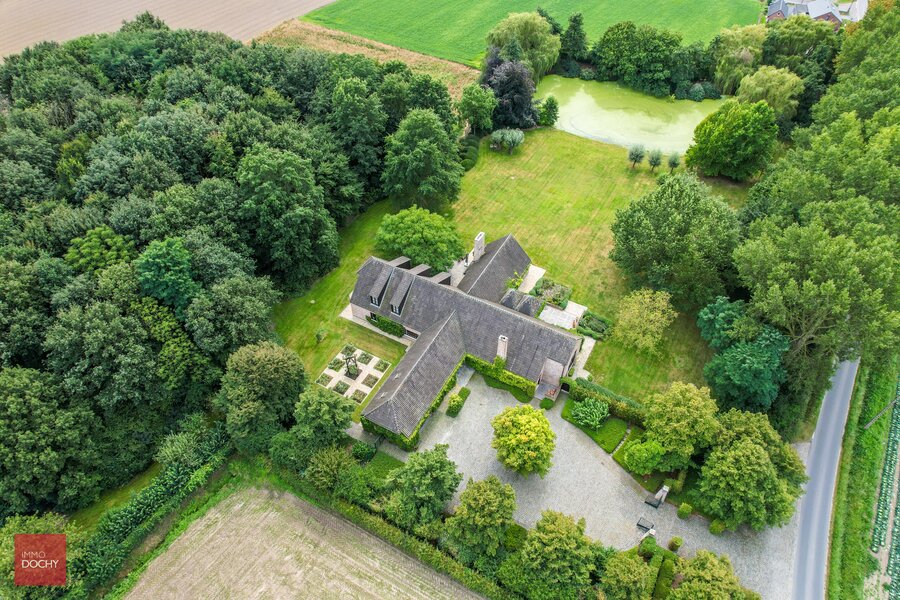 Prachtige eigendom met bos, prachtige tuin, vijver en ruim landhuis bestaande uit inkomhal, bureel, zeer ruime living met open haard, eetplaats, keuken met ontbijthoek en koelcel, wasplaats, kelders en een ruim overdekt zwembad (of hobbyruimte) met jacuzzi, verkleedruimte en douche. Ruime slaapkamer met badkamer en dressing op gelijkvloers en 2 ruime kamers (ev. 3) met badkamer op verdiep. Garage met zolder (hobbyruimte), tuinberging, en ruime terrassen met zicht op landschapstuin met vijver.