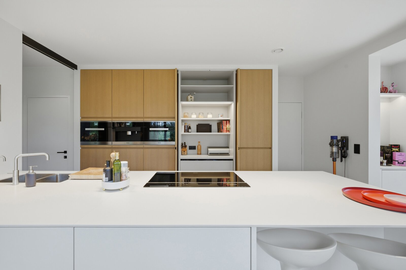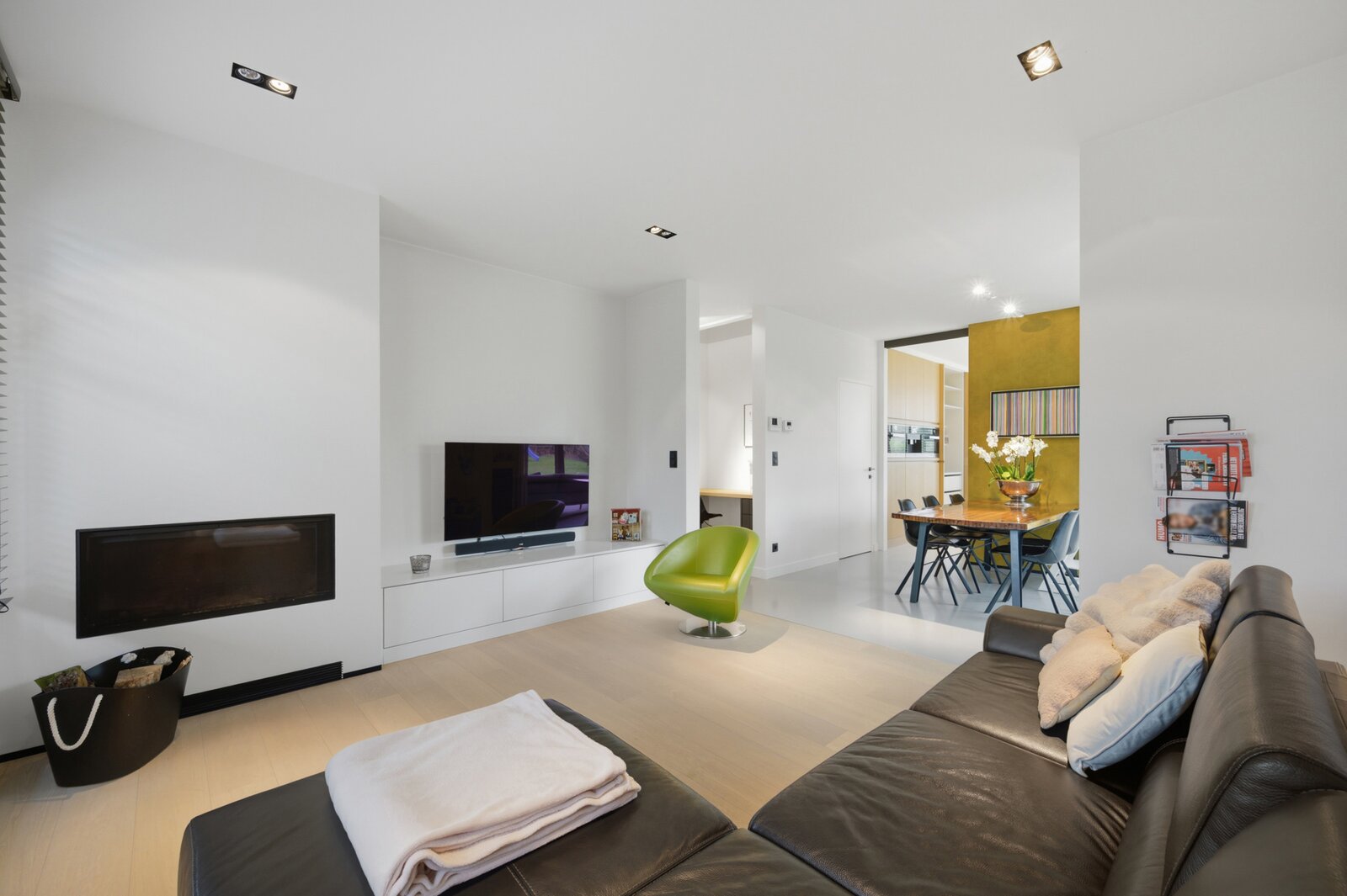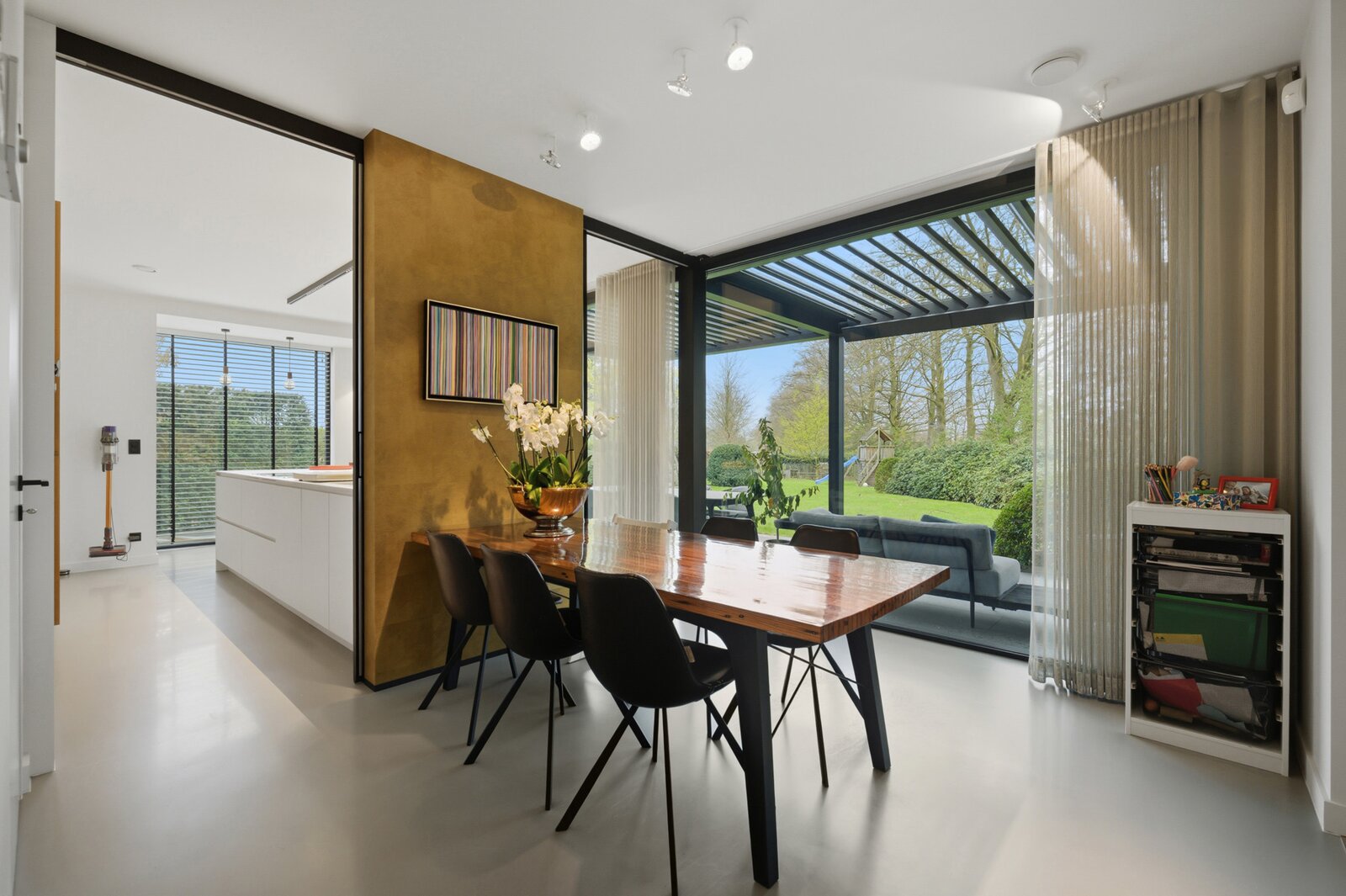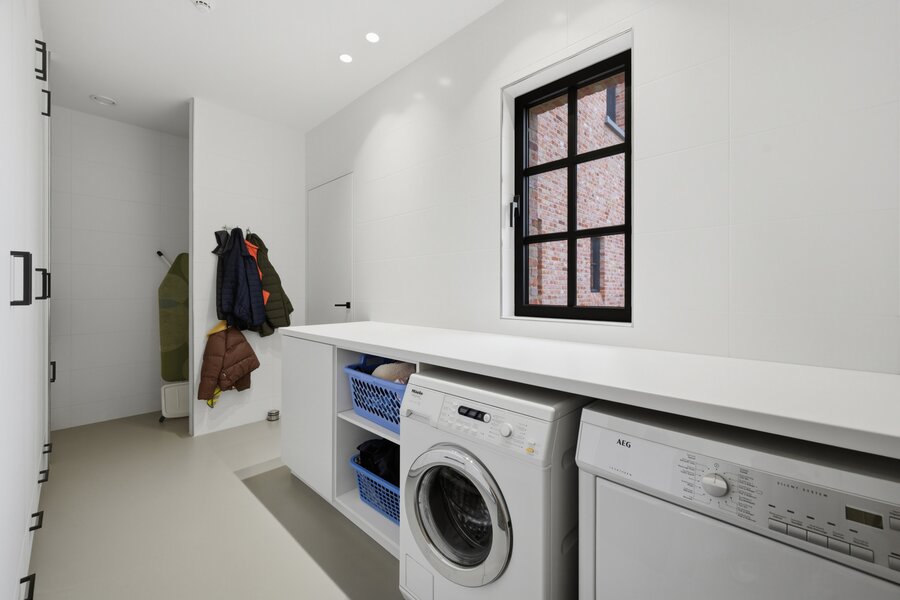 Bij het binnenkomen word je verwelkomd in de inkomhal met gastentoilet. Van hieruit bereik je de lichtrijke leefruimte en eetkamer, waar een gezellige houtkachel zorgt voor extra sfeer en warmte. Deze ruimte vloeit naadloos over in een moderne open keuken met zicht op de tuin. Aansluitend bevindt zich een bureau, er is ook plaats voorzien voor het plaatsen van een lift. Verder beschikt het gelijkvloers over een praktische wasplaats en een ruime inpandige garage.