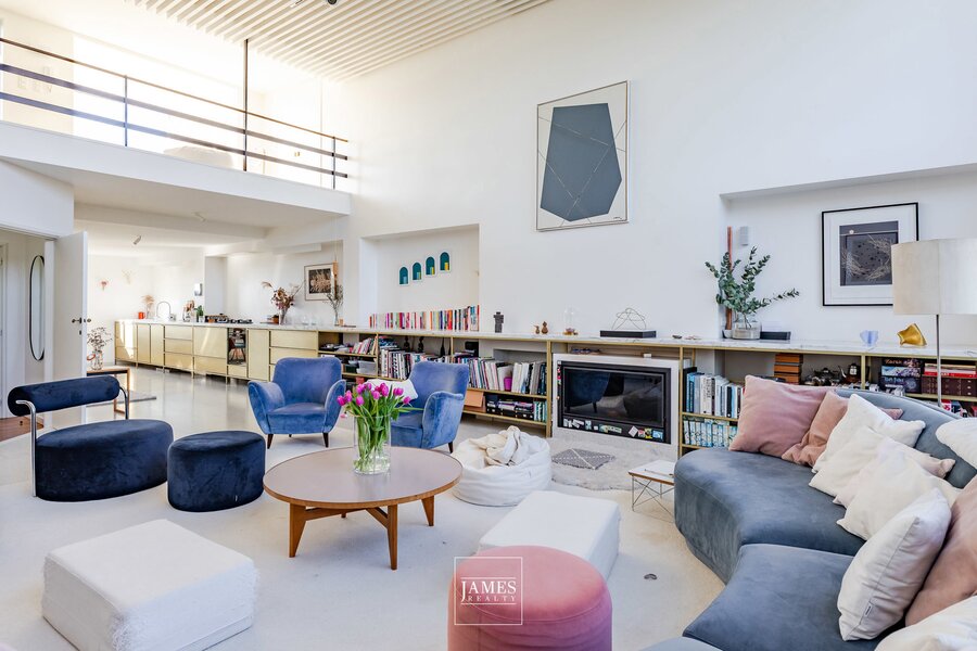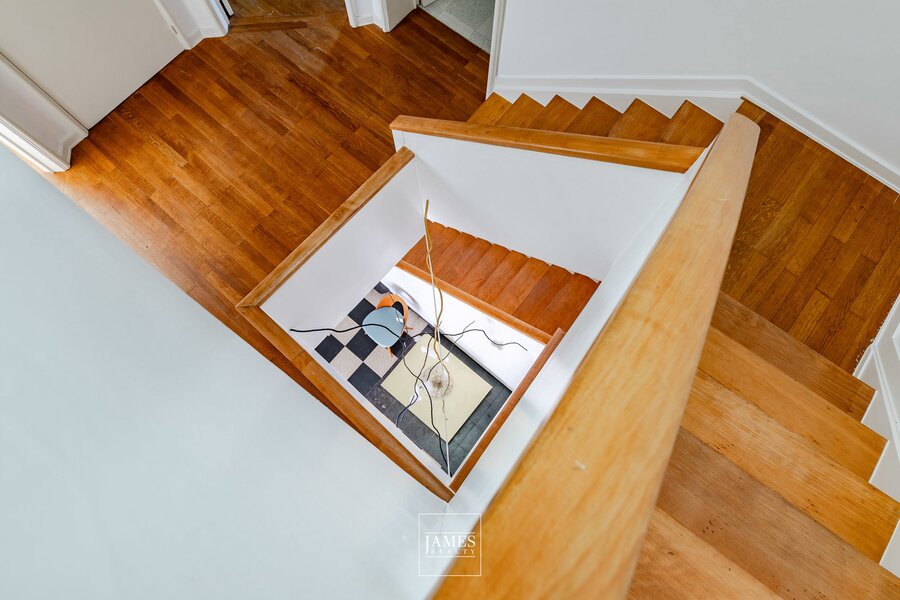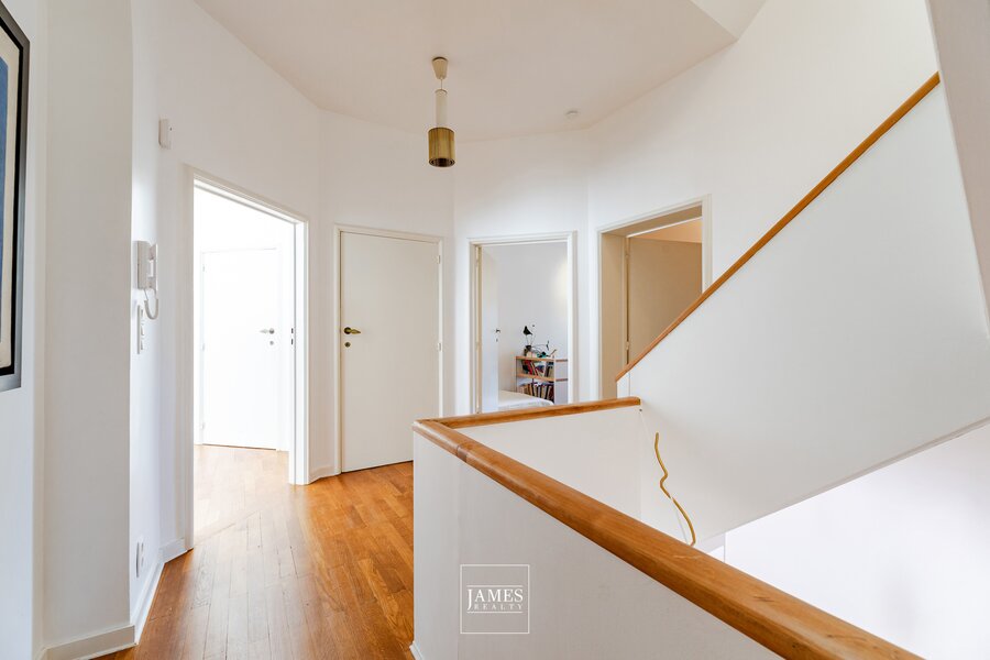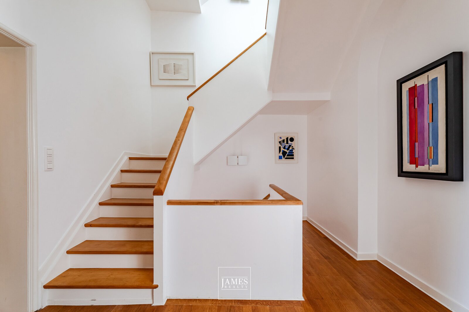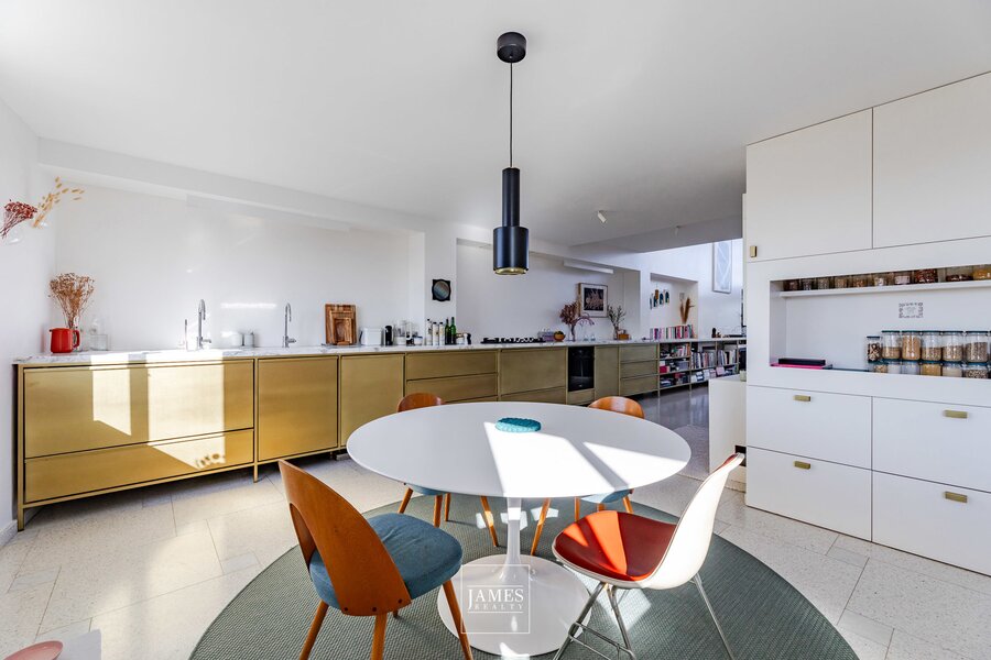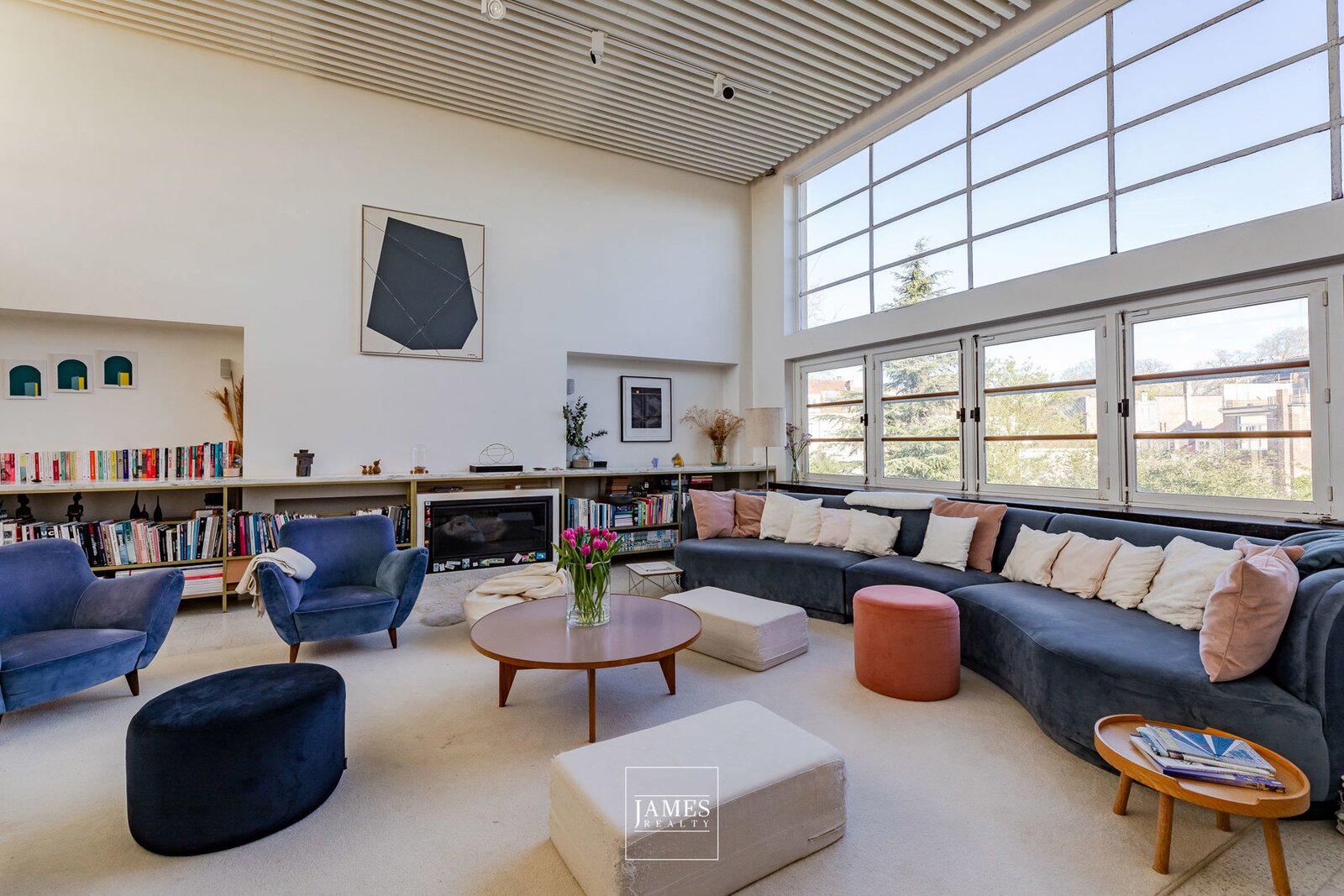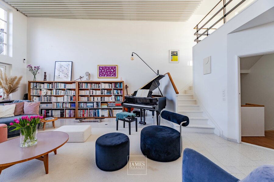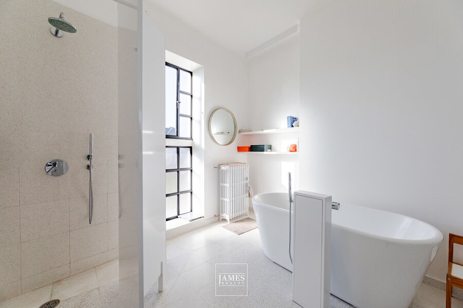 The house is characterised by an inverted layout, with the main living areas located on the top floor. The former artist’s studio has been transformed into a spacious double-height living room, flooded with natural light through a large glass roof. This remarkable space also includes the dining area and a bespoke open kitchen, and opens onto a south-facing solarium terrace.