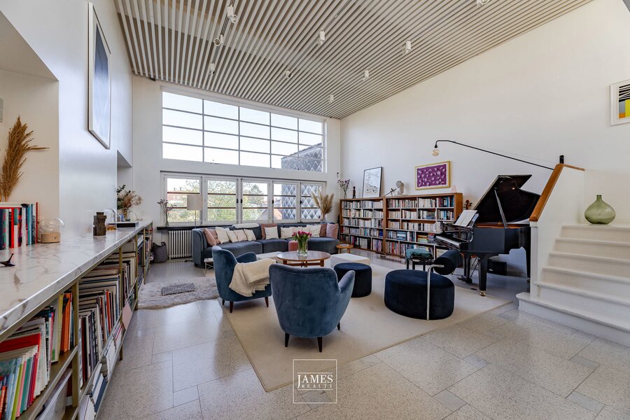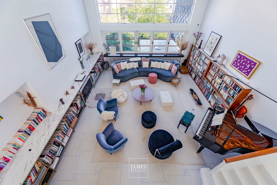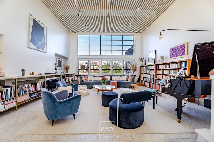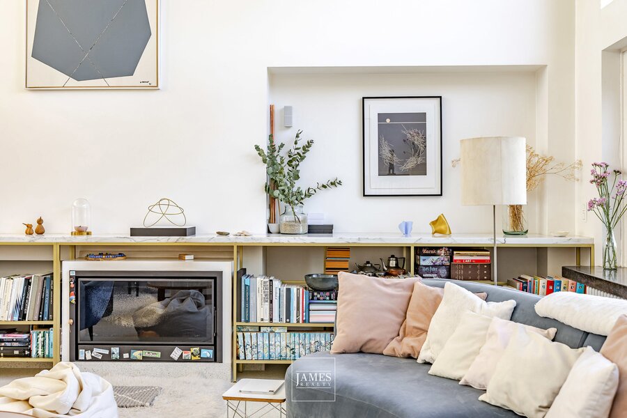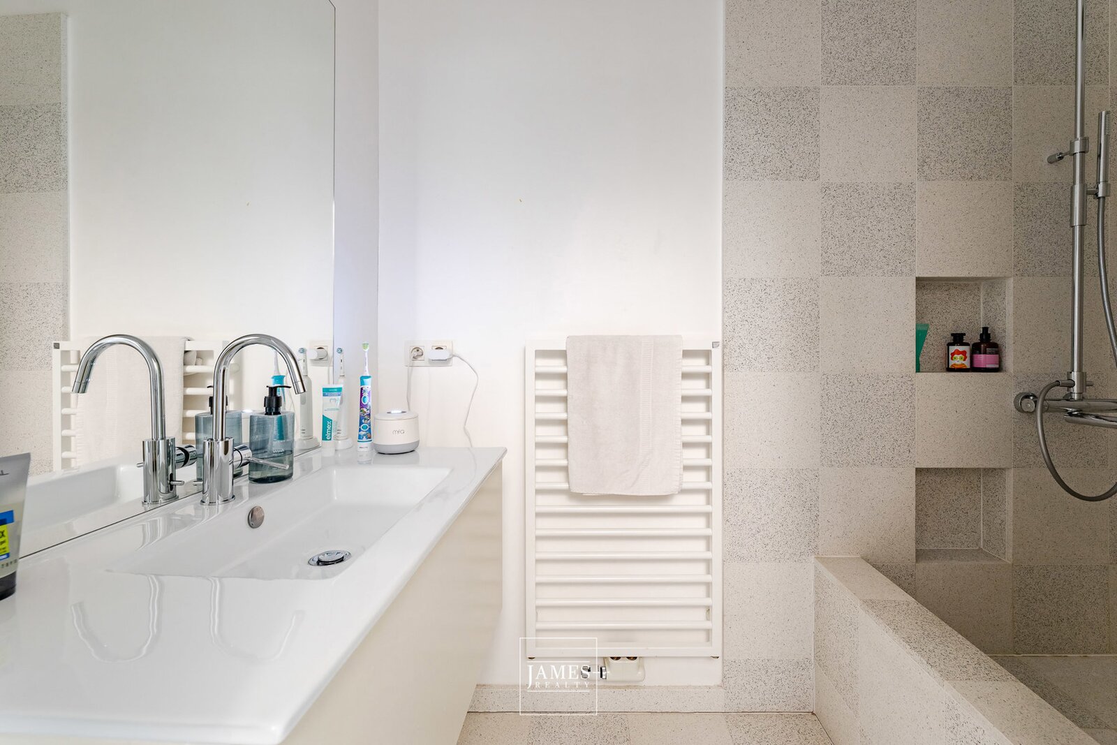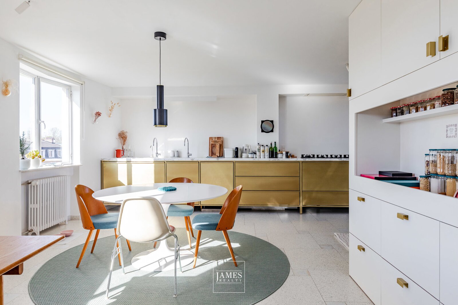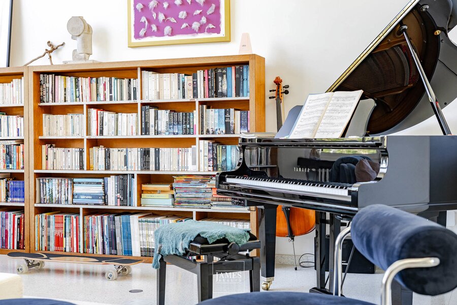 The house is characterised by an inverted layout, with the main living areas located on the top floor. The former artist’s studio has been transformed into a spacious double-height living room, flooded with natural light through a large glass roof. This remarkable space also includes the dining area and a bespoke open kitchen, and opens onto a south-facing solarium terrace.
