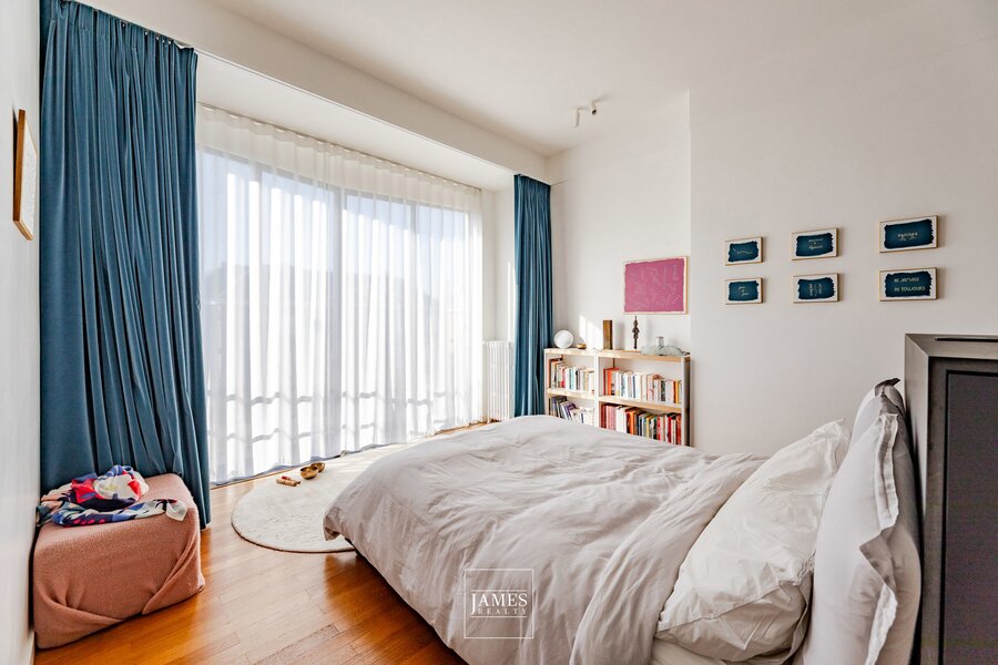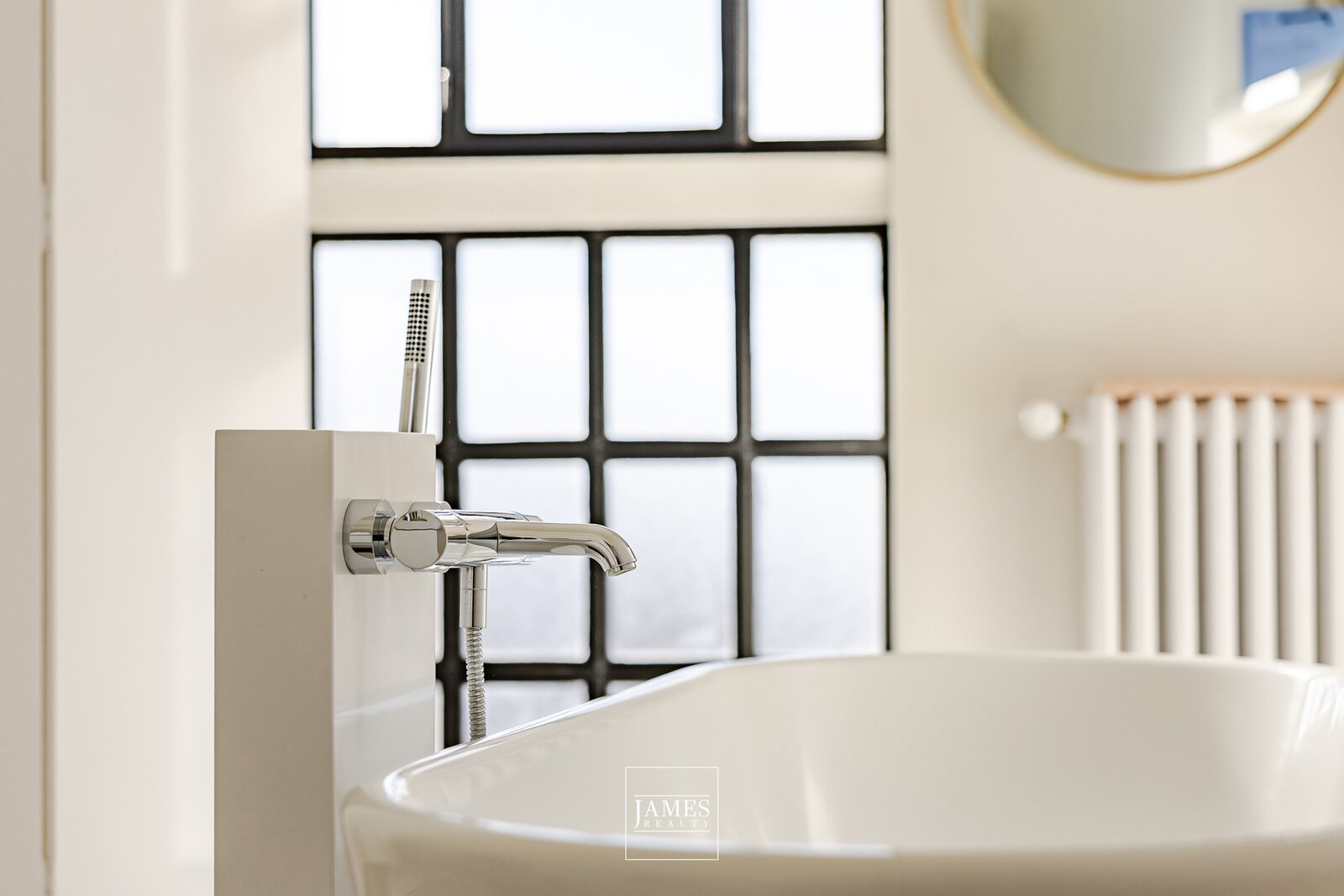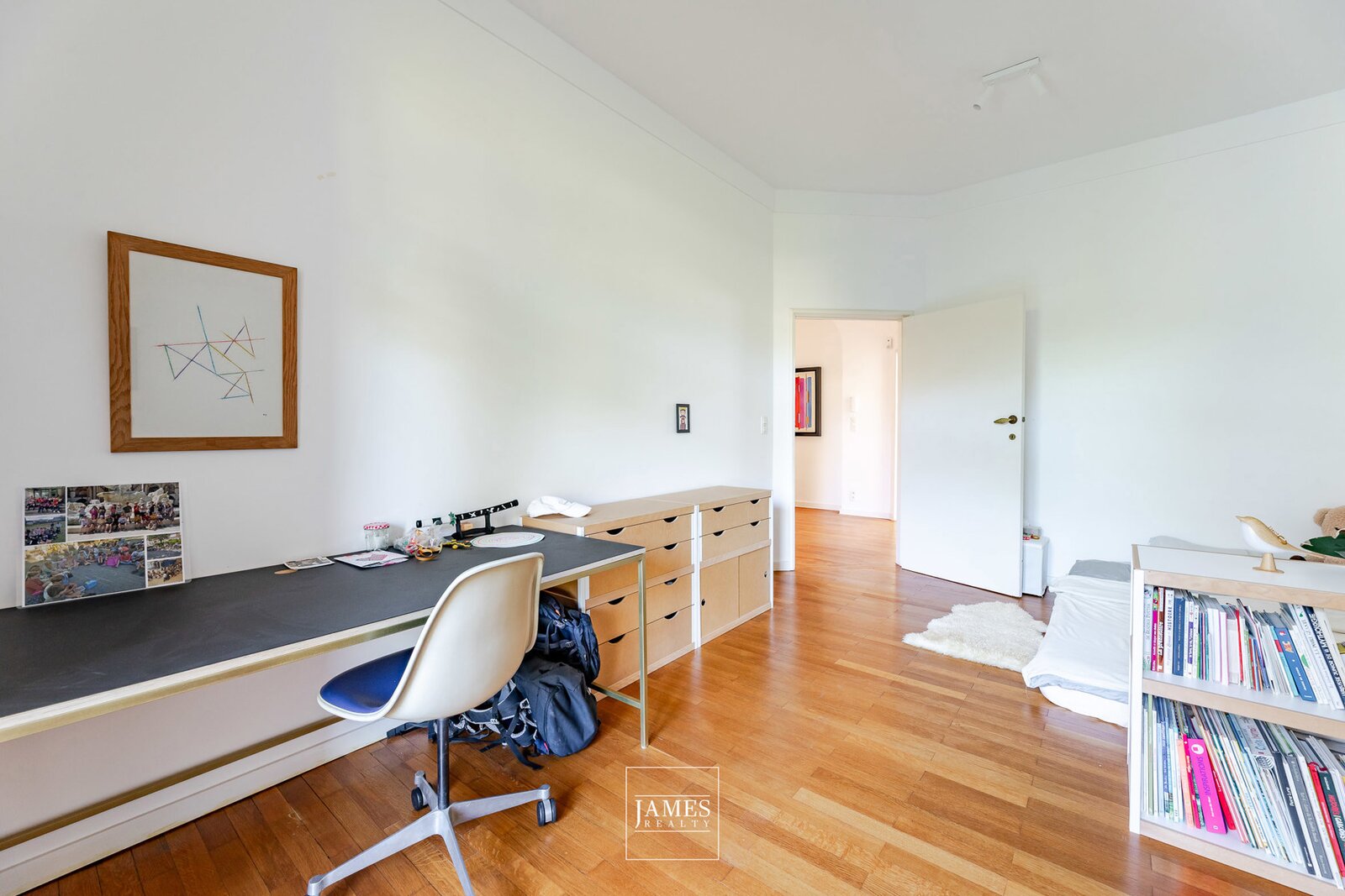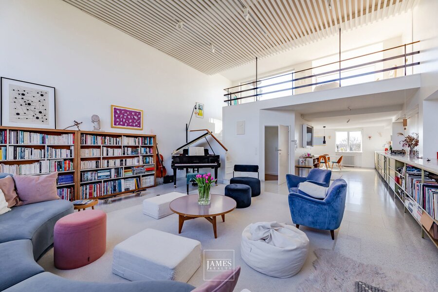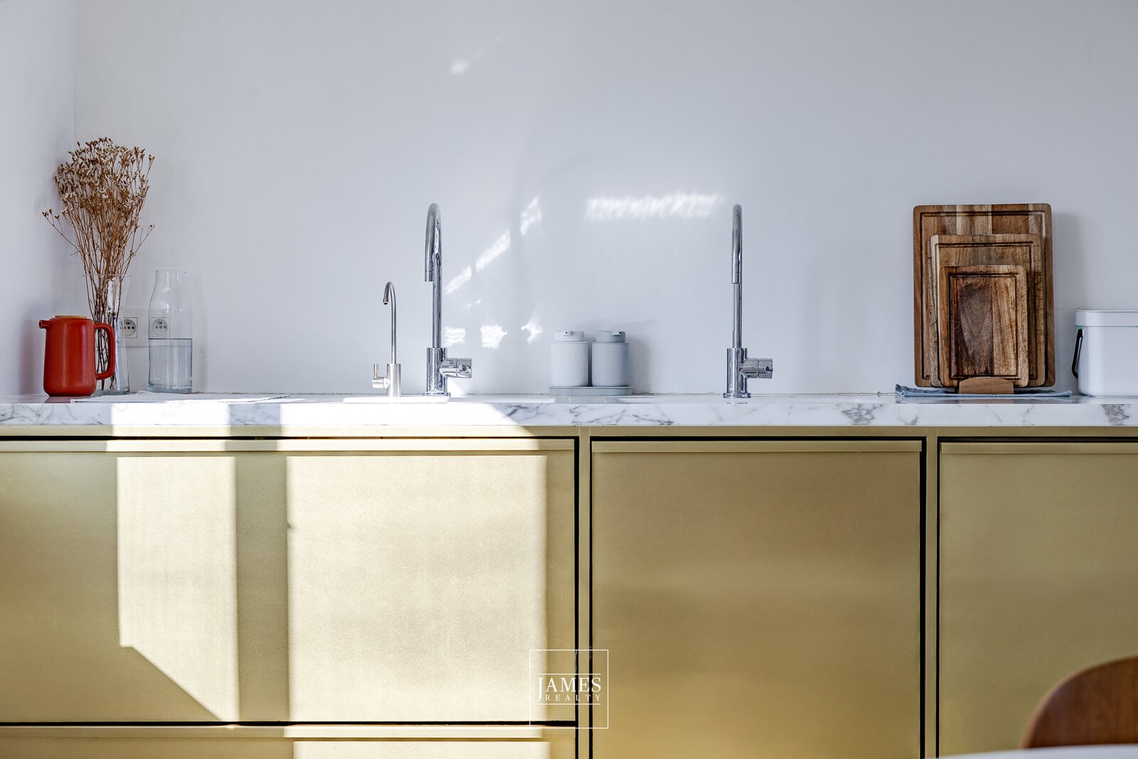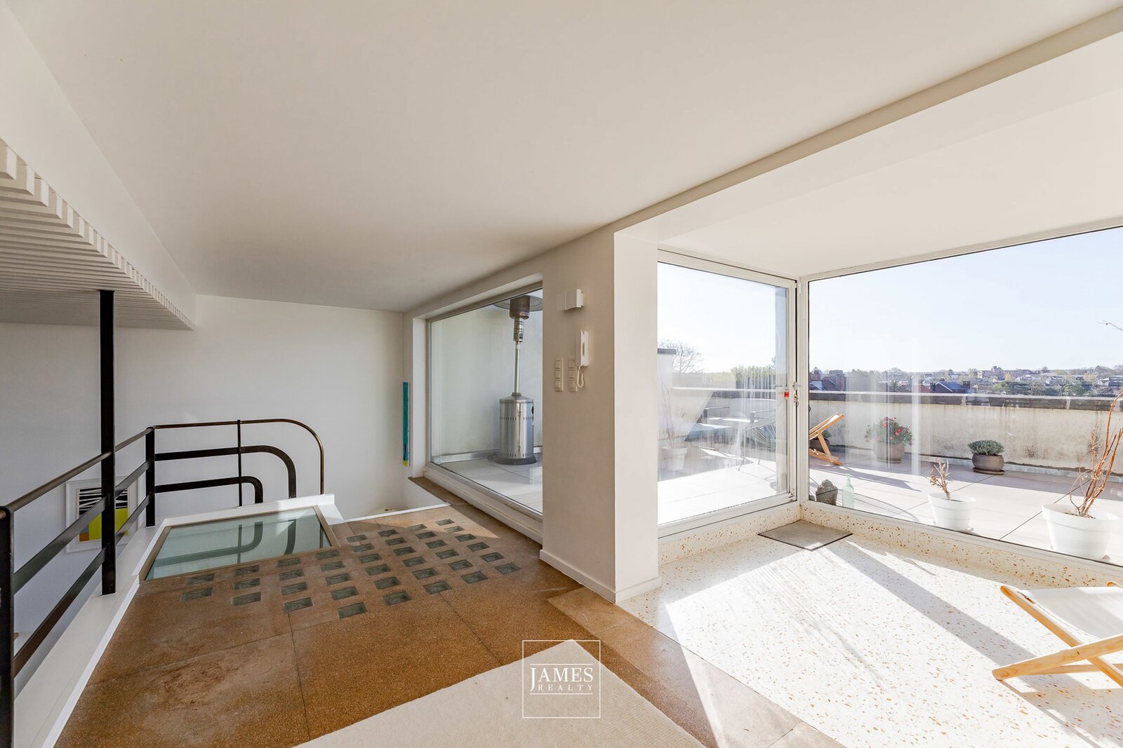 The house is characterised by an inverted layout, with the main living areas located on the top floor. The former artist’s studio has been transformed into a spacious double-height living room, flooded with natural light through a large glass roof. This remarkable space also includes the dining area and a bespoke open kitchen, and opens onto a south-facing solarium terrace.