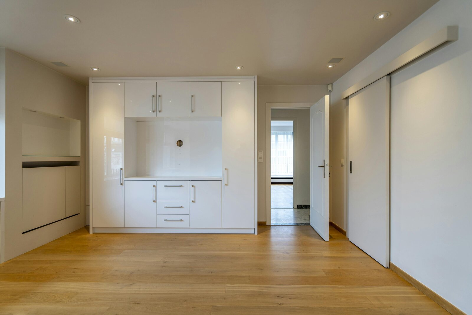 The living areas fit together seamlessly with plenty of natural daylight. Dining area, living room, desk. All with views of the Kouter or the Korte Meer.