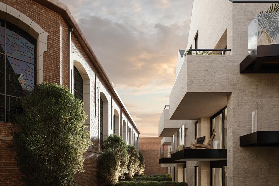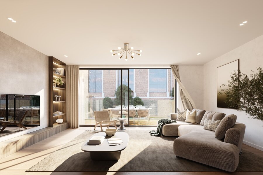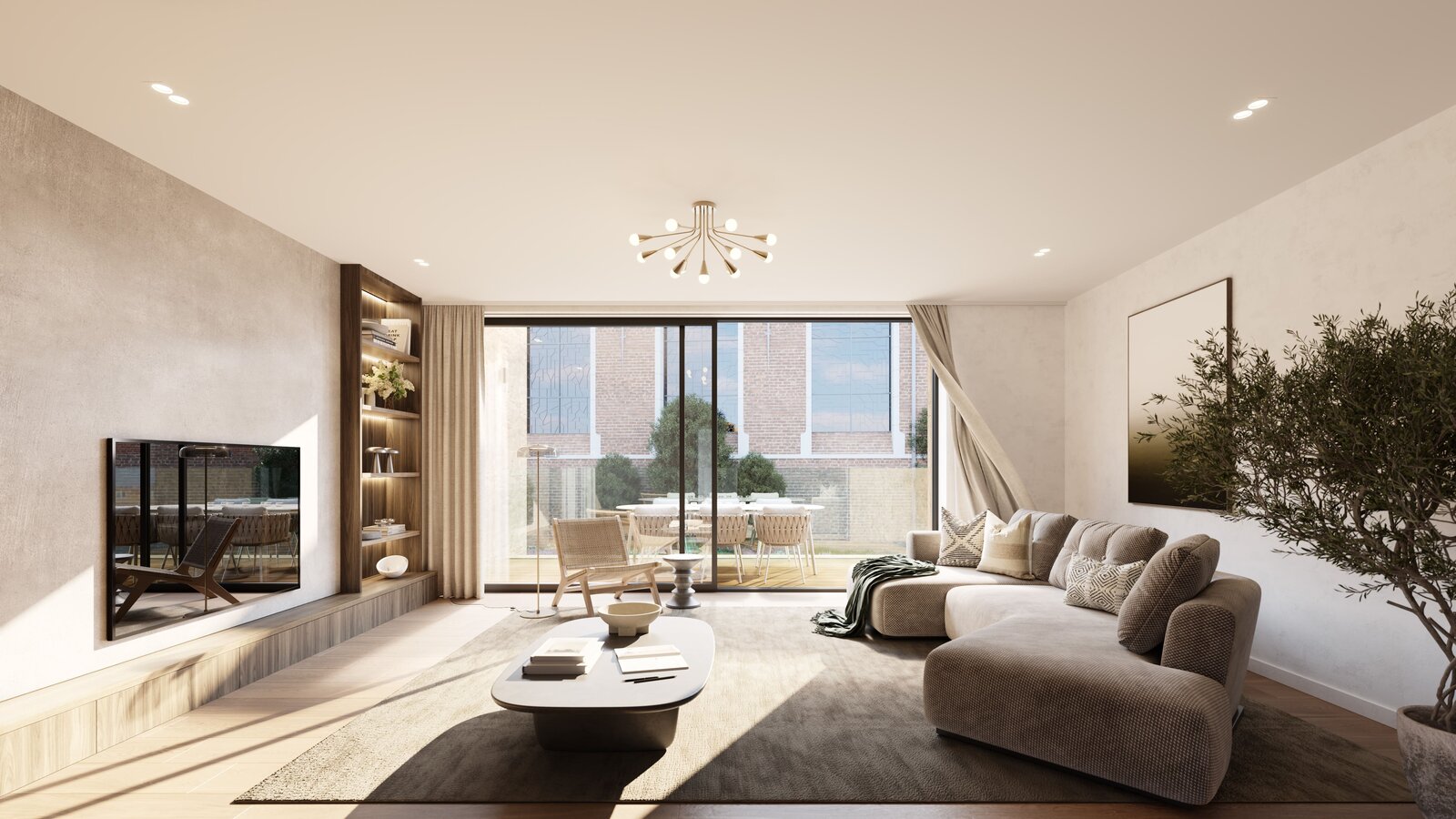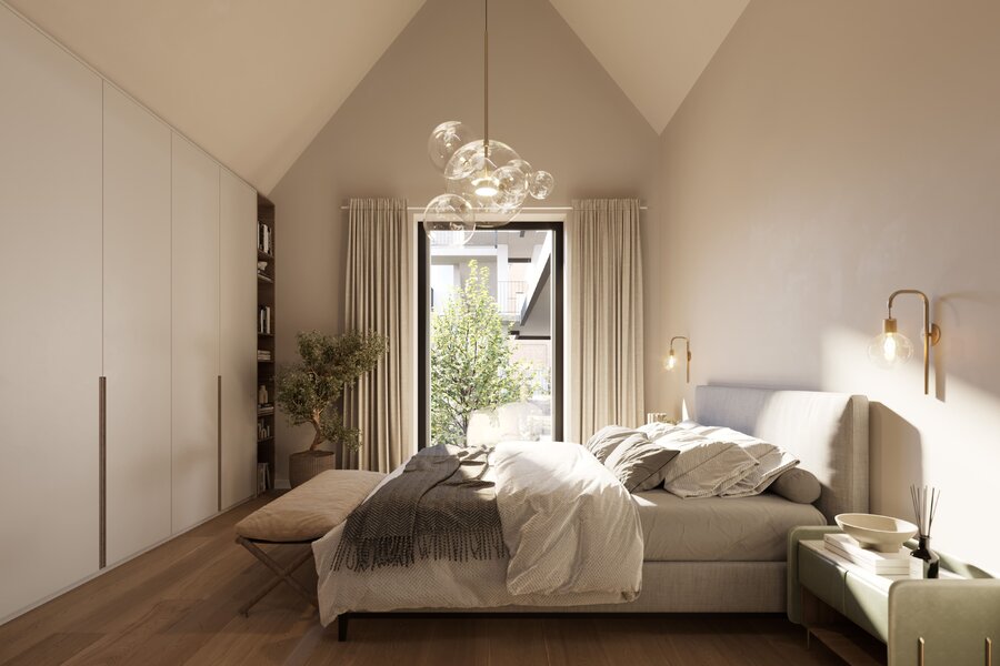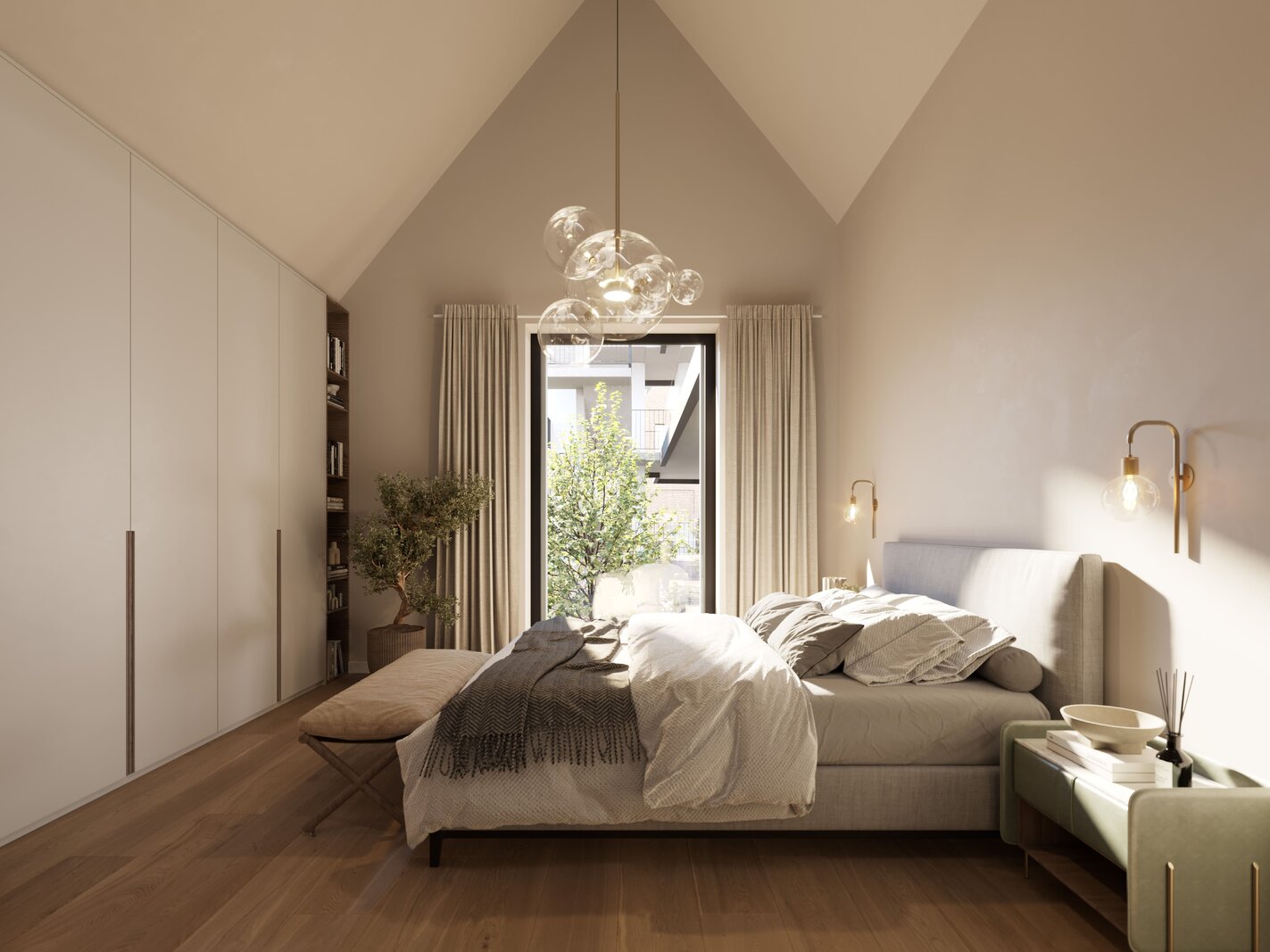 Deze duplex A1.1 op de eerste en tweede verdieping is voorzien van een exclusievere toegang met privacy op de hoek. De hoge leefruimte met open keuken staat in verbinding met het zonneterras. Er is op de eerste en tweede verdieping telkens een exclusieve slaapkamer met plafond tot in de nok. Deze ruime slaapkamers bieden mooie groene uitzichten bij het ontwaken en staan telkens in verbinding met de dressing en de badkamer met inloopdouche. De bovenste verdieping (2+) van deze duplex is tevens het hoogst gelegen wegens de typische Brugse dakenstructuur die ook in het nieuwbouw gedeelte wordt geïntegreerd.