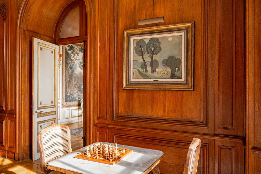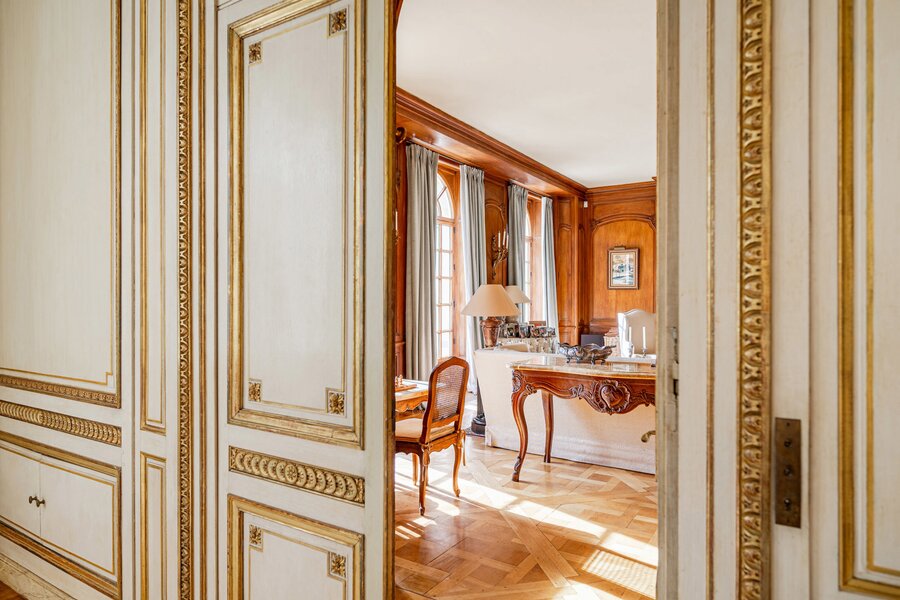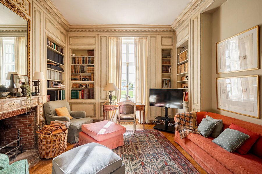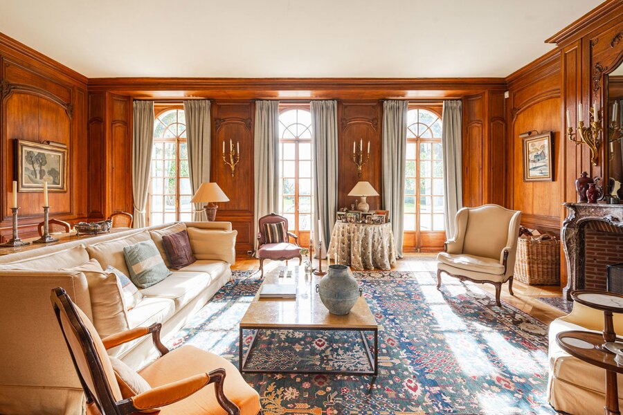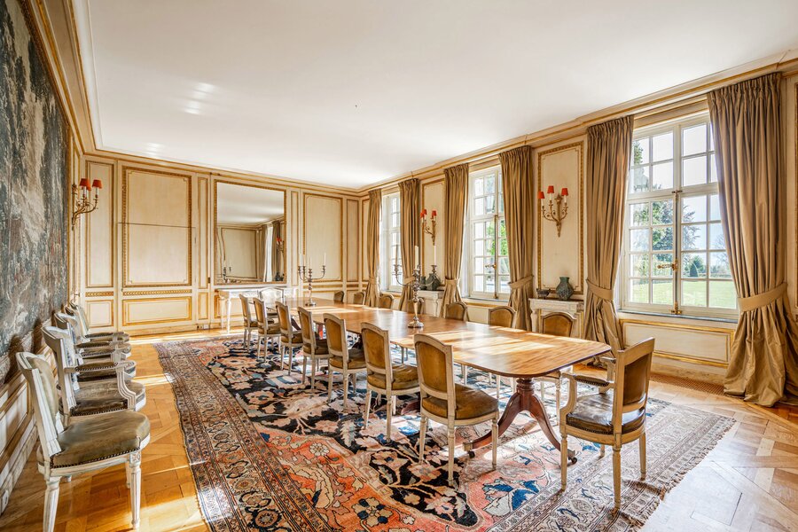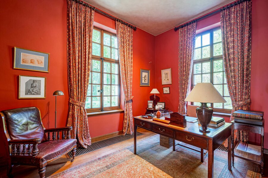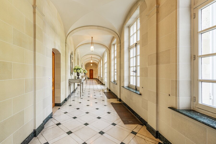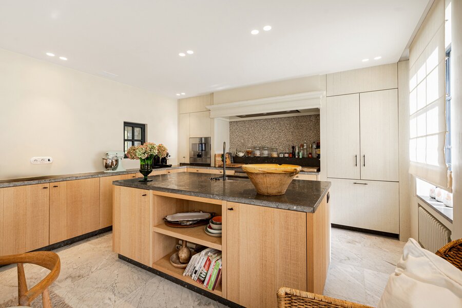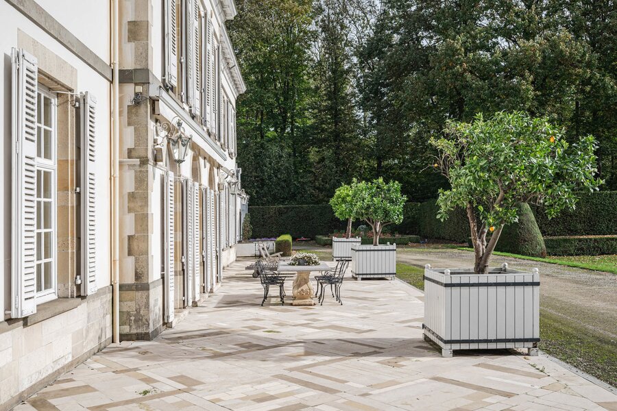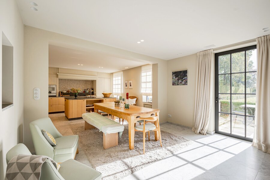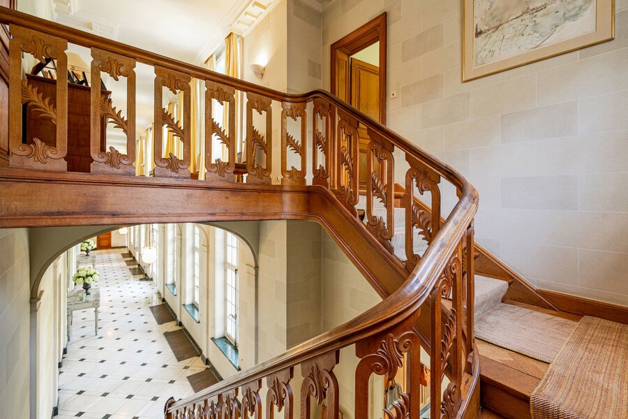 The majestic entrance hall gives access to several large living spaces, including a large reception room, a formal dining room, an office, a library, a relatively modern kitchen and a checkroom. On the second floor there is a master bedroom with bathroom and dressing room, an extra master bedroom and 4 more bedrooms with bathroom and a linen room with ironing room. On the second floor there is the possibility of creating a multipurpose room. The second floor includes a laundry room, kitchen, several cellars, workshop and a large garage. The interior was designed by Axel Vervoordt, with every detail worked out to perfection.
