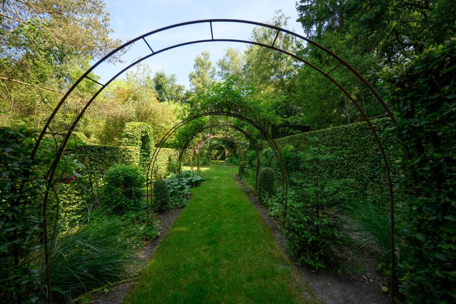 De woning beschikt over een voortuin met oprit en is volledig omheind. De tuin is toegankelijk zowel via het salon, als de eetkamer en de leefkeuken via grote raampartijen. Hij beschikt over een zeer ruim terras waar u kan genieten van alle rust en een groen uitzicht op de zeer fraai aangelegde parktuin met vijver.
