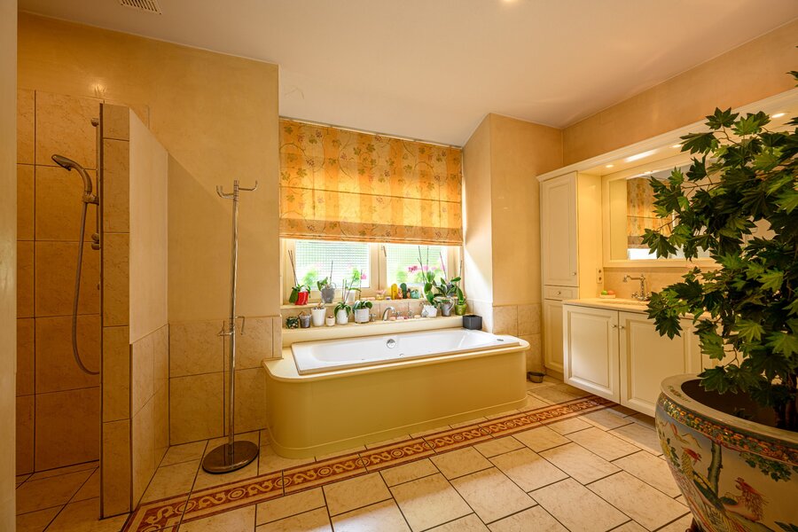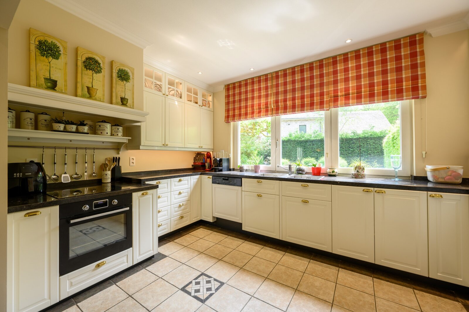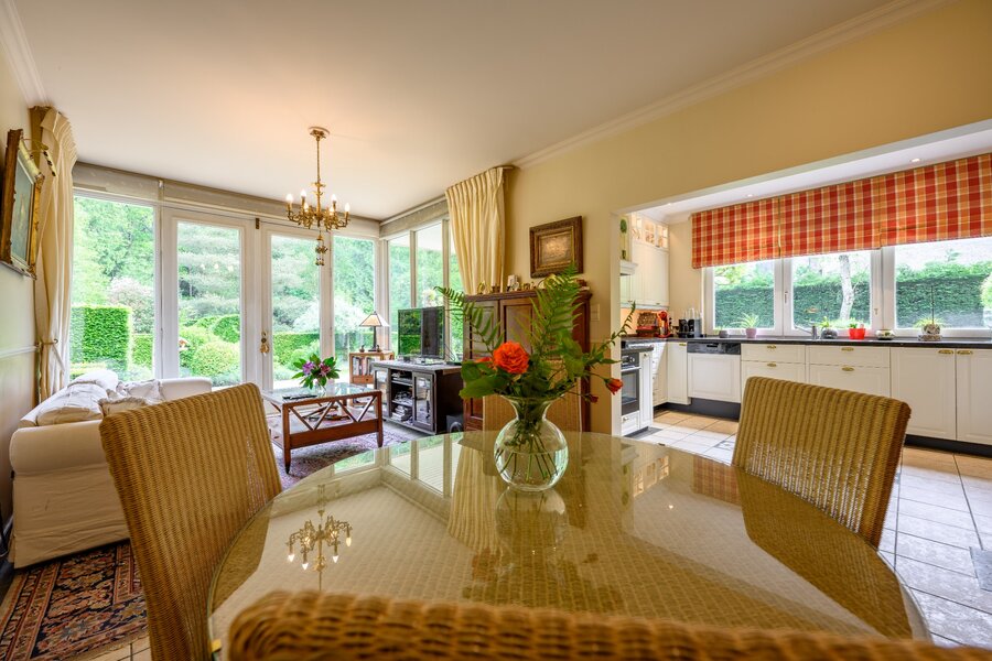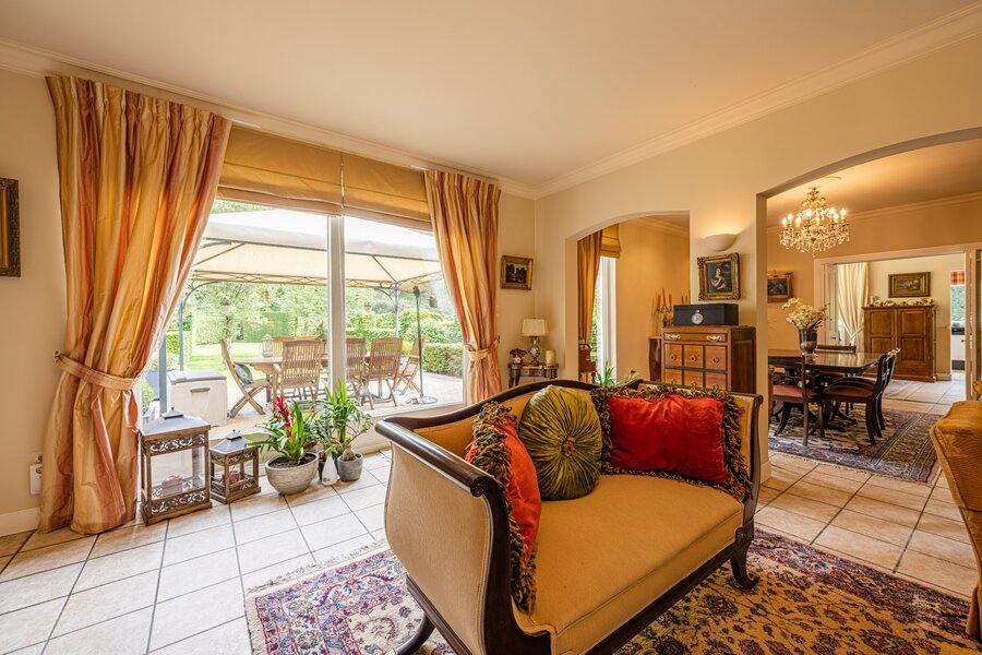 Via de inkomhal komen we binnen in de mooi onderhouden villa. Deze heeft een gastentoilet en voldoende hoogte voor een kroonluchter. Rechtdoor komen we in het leefgedeelte, die is opgedeeld in een salon en een eetkamer. De ruime leefkeuken is zeer compleet uitgerust met voldoende bergkasten, toestellen en een eethoek… kortom alle comfort die u verwacht. Vanuit alle ruimtes heeft u zicht op de prachtig aangelegde parktuin met vijver en terras. Via een bijkeuken met aparte inkomdeur, bereiken we de inpandige, dubbele garage. Een trap leidt naar een fraai ingerichte kantoorruimte met aparte badkamer. Aan de andere kant van de villa is er een masterbedroom met dressing en luxueuze badkamer met bad en douche. De woning is hierdoor geschikt voor zowel zorgwonen als home office en biedt u tal van mogelijkheden.