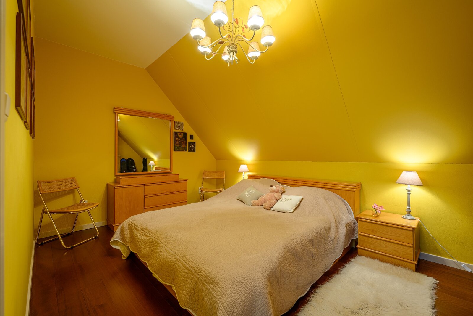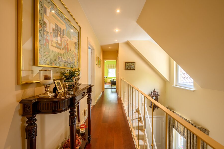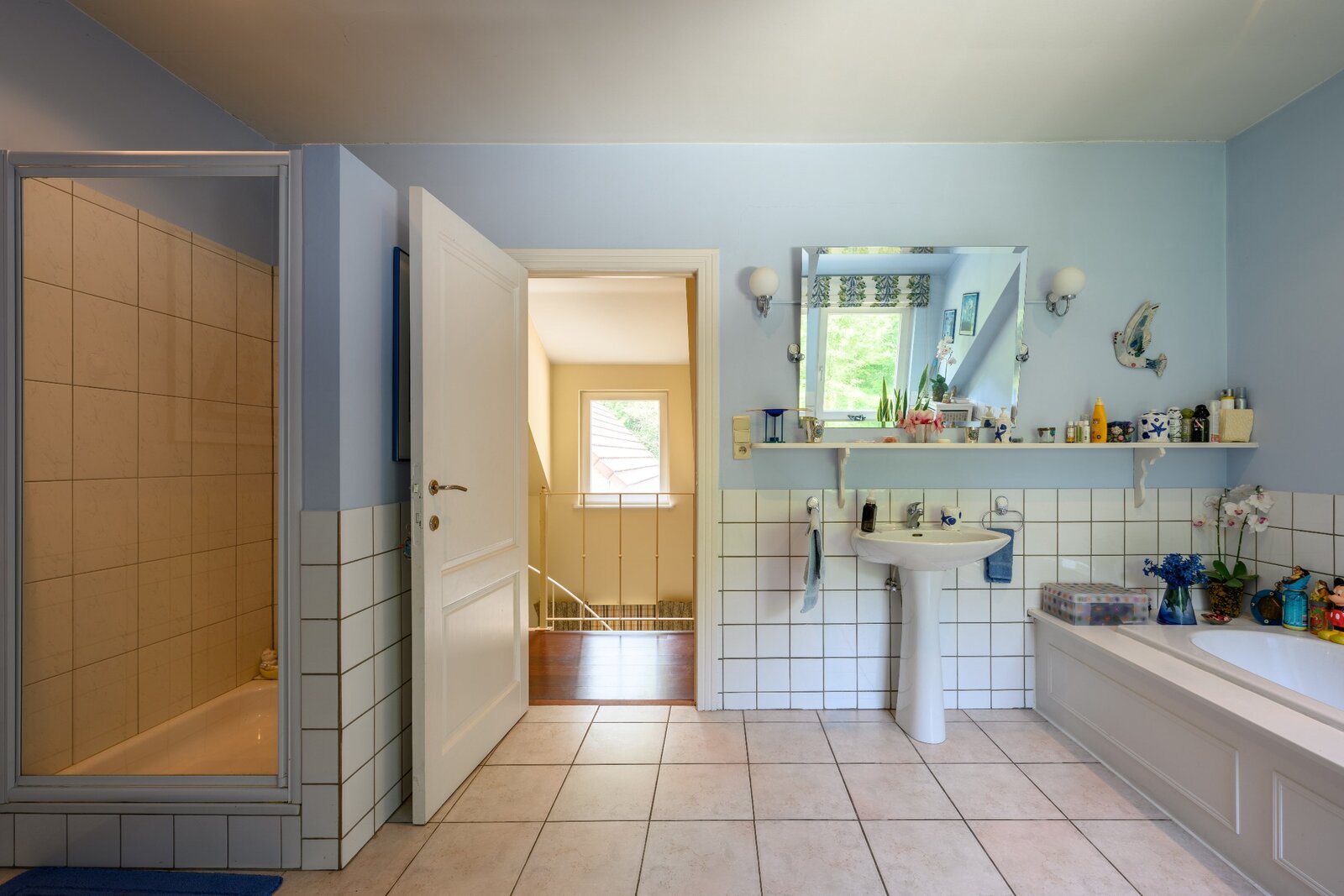 Vanuit de inkomhal nemen we de trap naar de nachthal op de eerste verdieping. Er zijn 4 kamers, waarvan 2 met en suite badkamer. De riante badkamer heeft een bad en een douche. Ten slotte is er nog een nachttoilet.