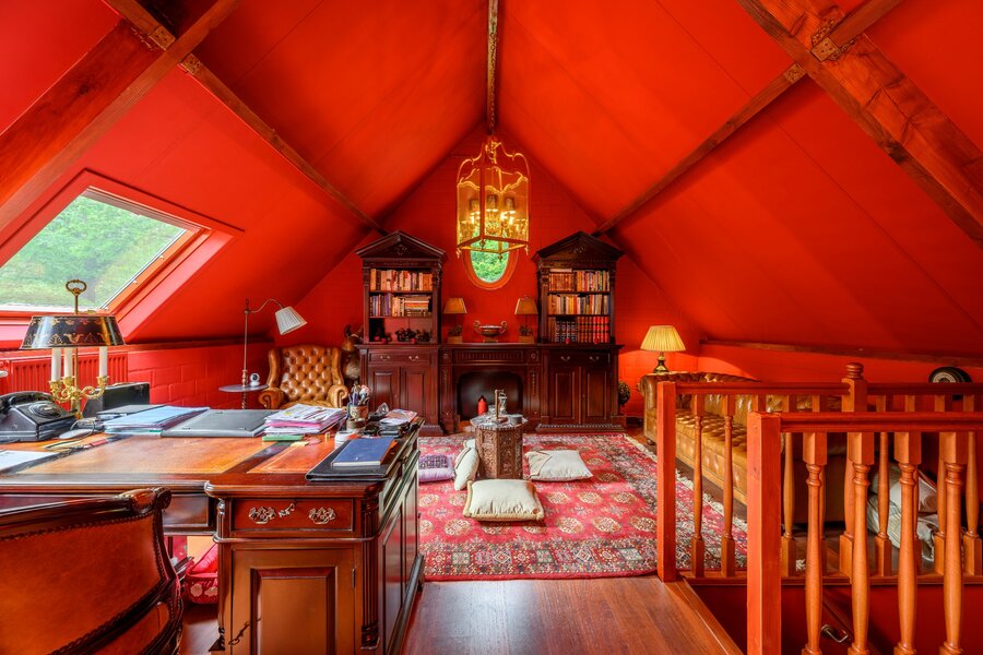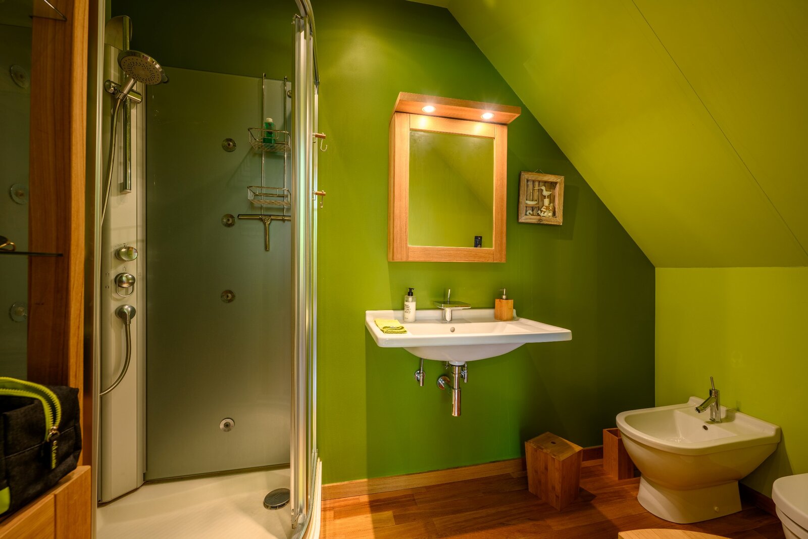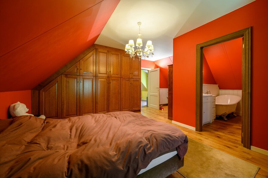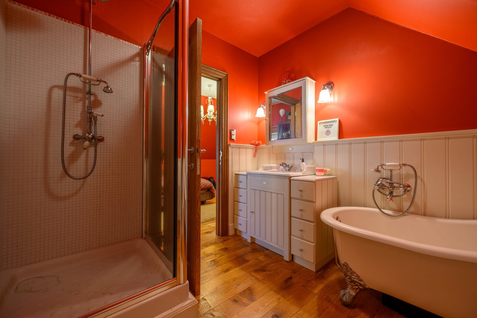 Vanuit de inkomhal nemen we de trap naar de nachthal op de eerste verdieping. Er zijn 4 kamers, waarvan 2 met en suite badkamer. De riante badkamer heeft een bad en een douche. Ten slotte is er nog een nachttoilet.