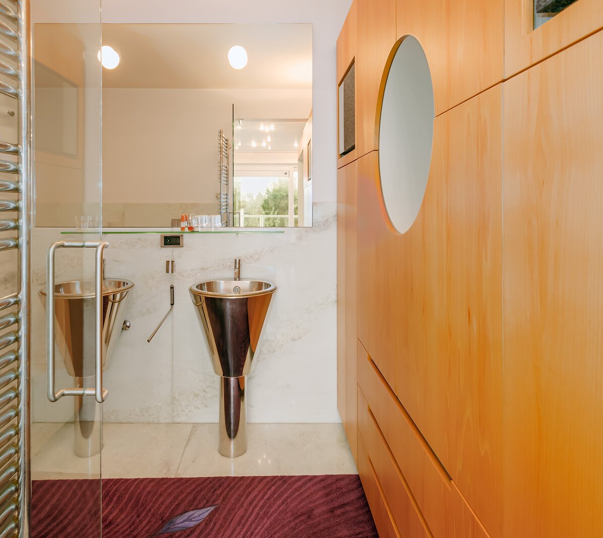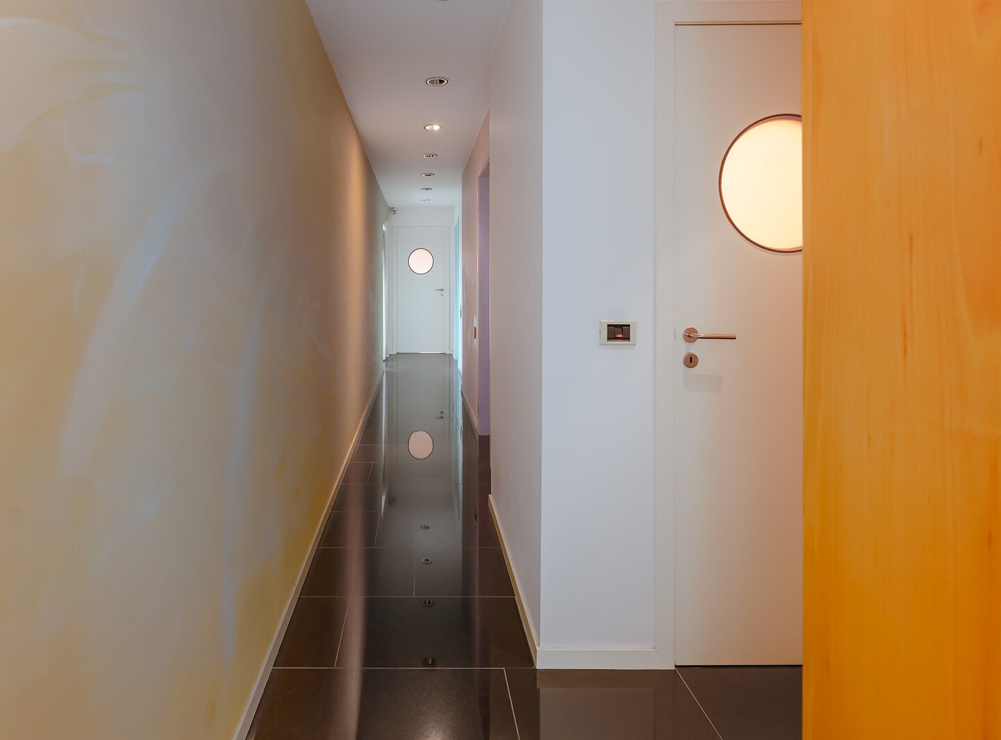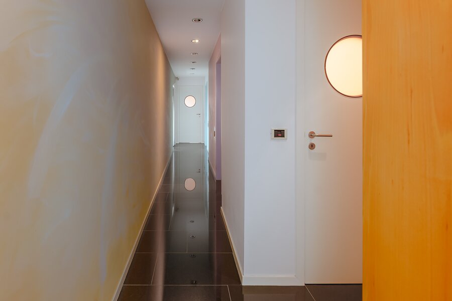 Gelijkvloers:inkomhal, keuken, berging, eetkamer, living, 7 terassen, 3 slaapkamers met elk een badkamer, gastentoilet.