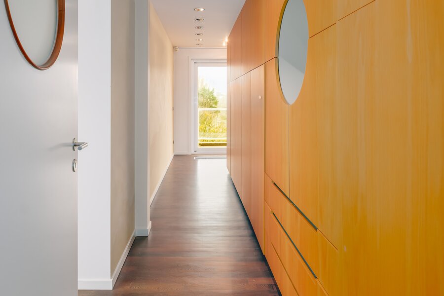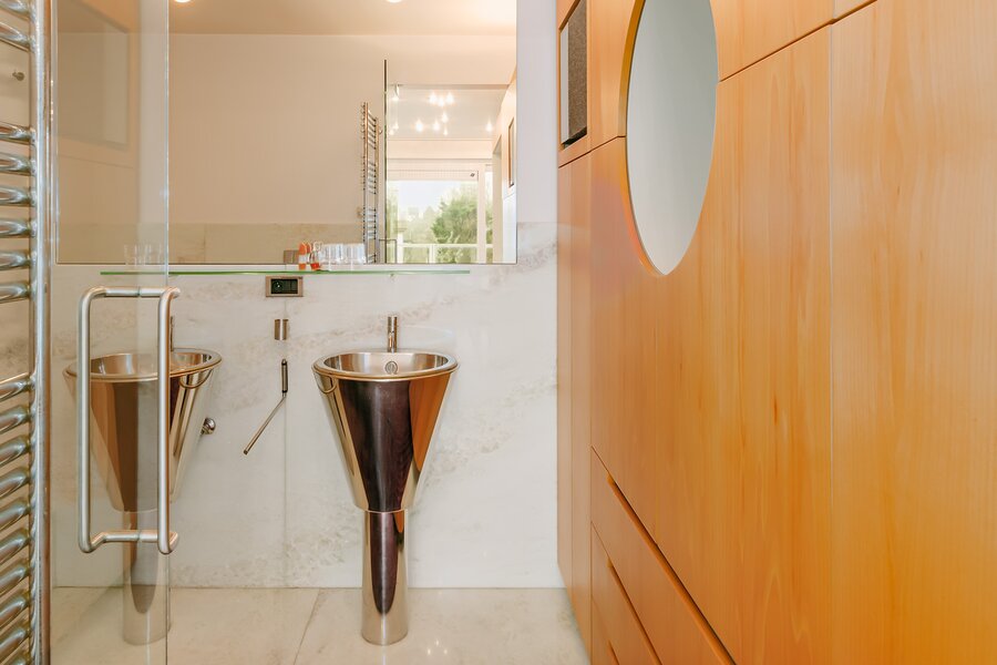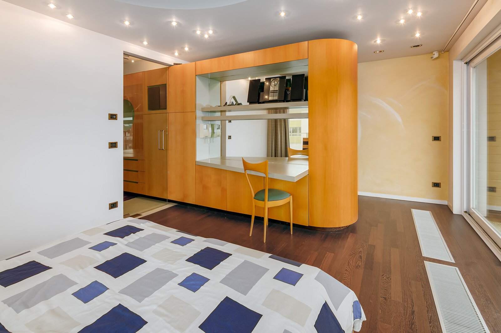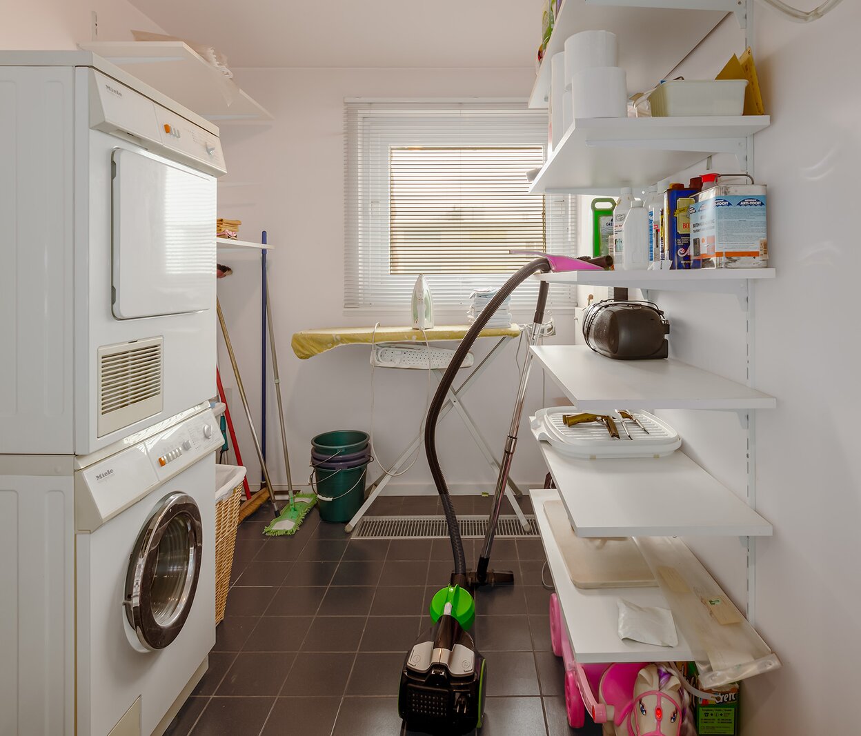 Gelijkvloers:inkomhal, keuken, berging, eetkamer, living, 7 terassen, 3 slaapkamers met elk een badkamer, gastentoilet.