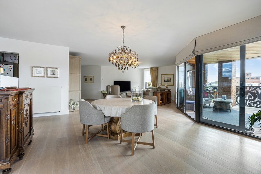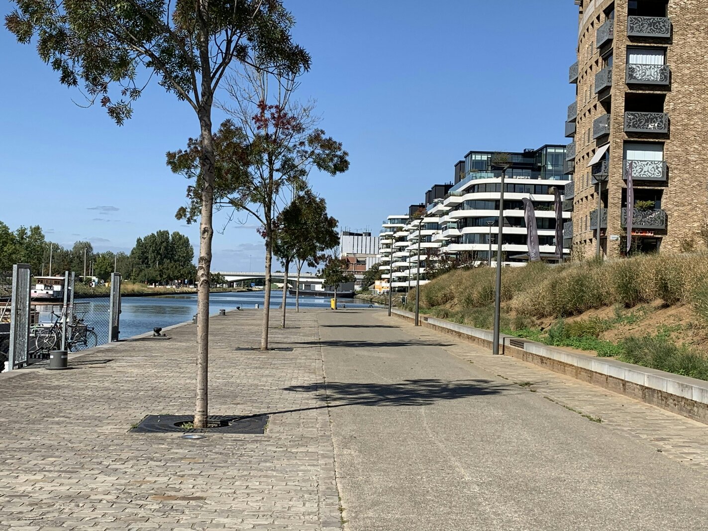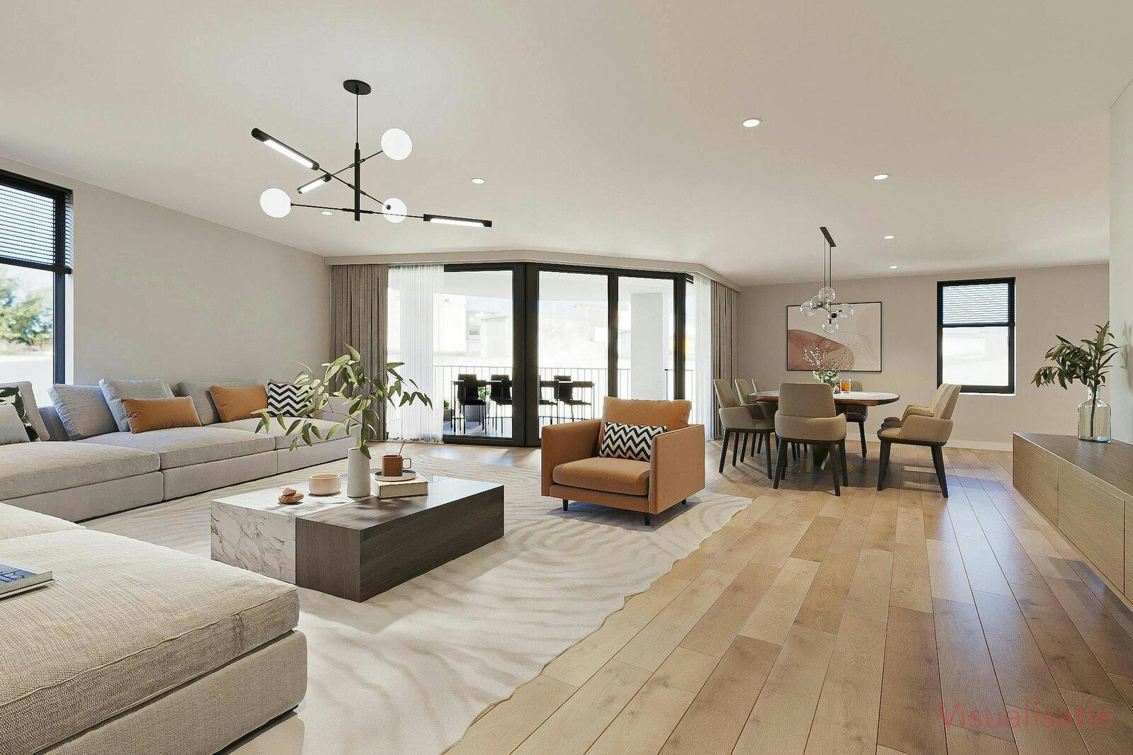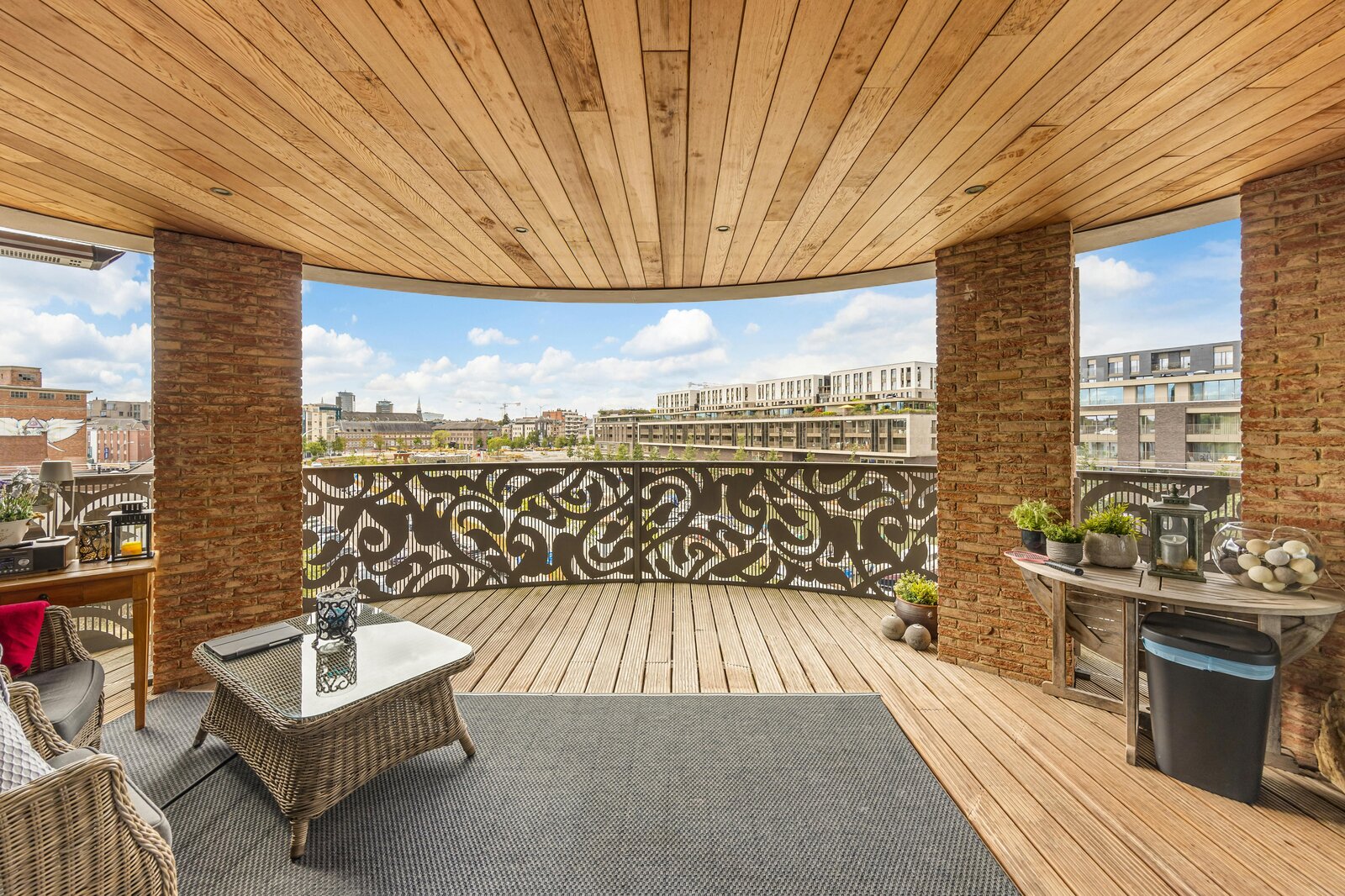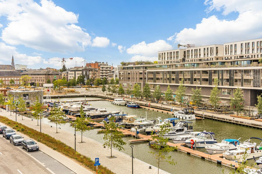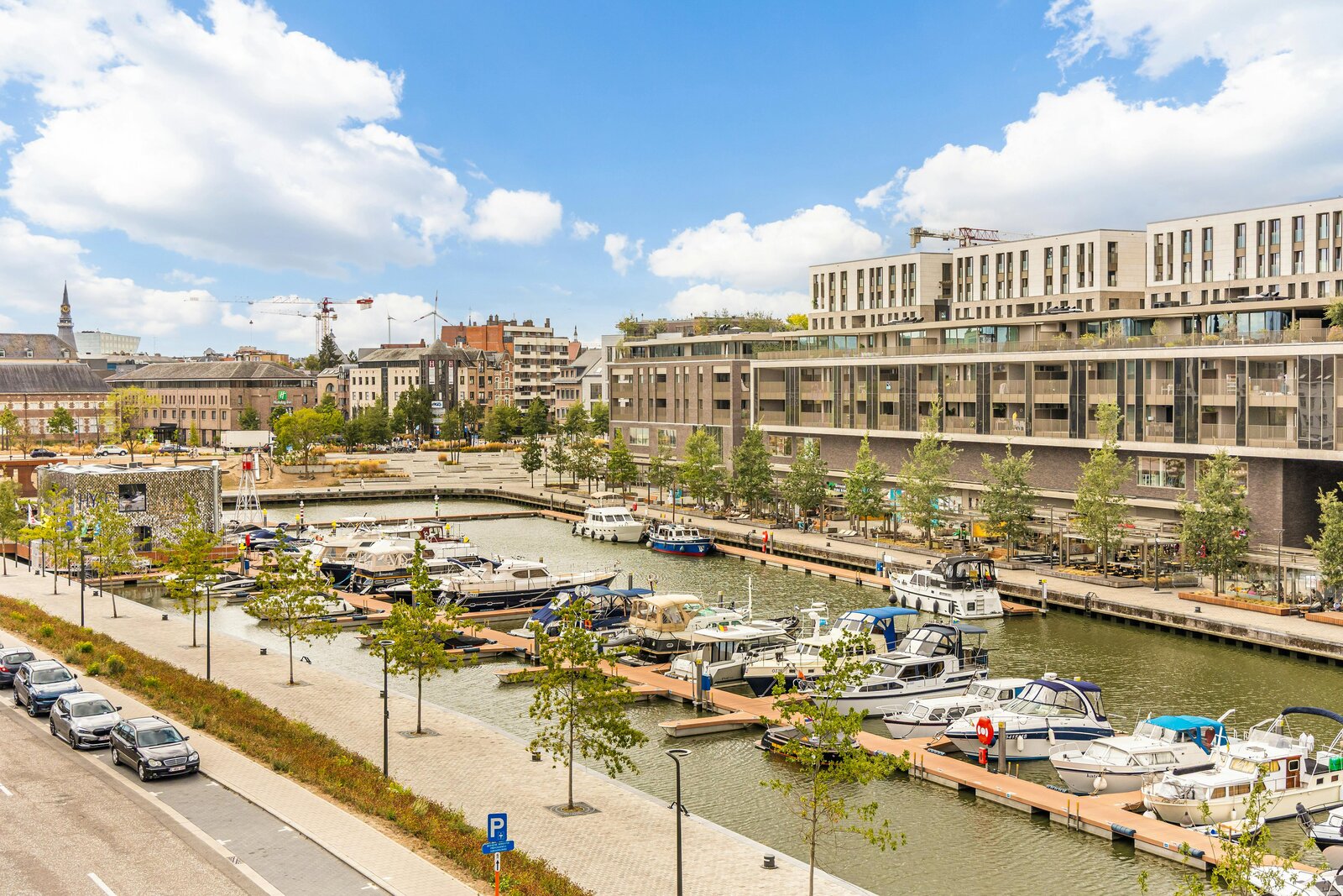 Unique apartment (168 m² gross, 3rd floor, elevator) + waterfront sun terrace (23 m²) with an underground car park a stone's throw from Hasselt center with a view of Quartier Bleu.