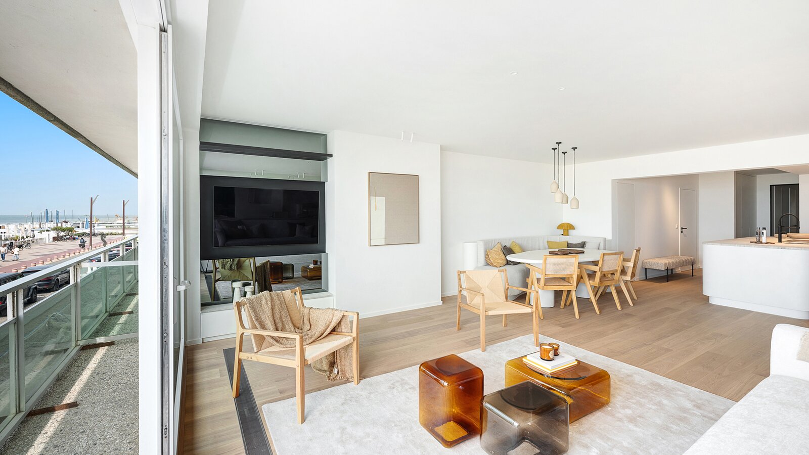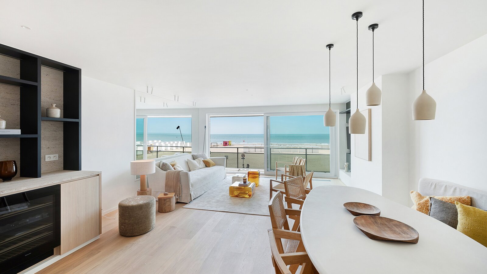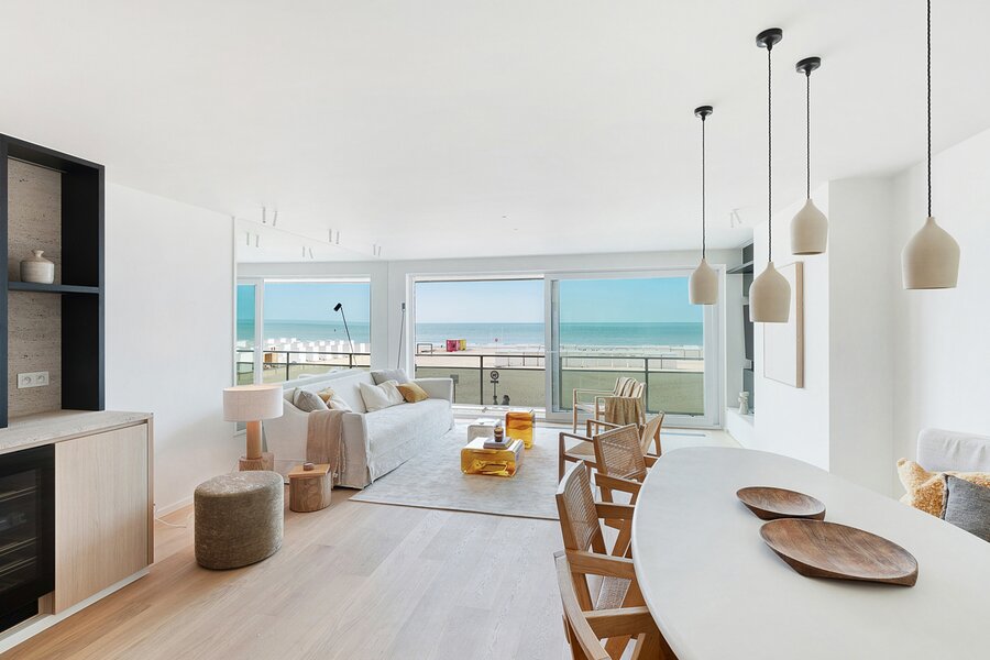 Magnificent apartment located on the 1st floor of a standing residence on the seafront in the Zoute, with a frontage width of 5.20 meters and a unique frontal sea view.