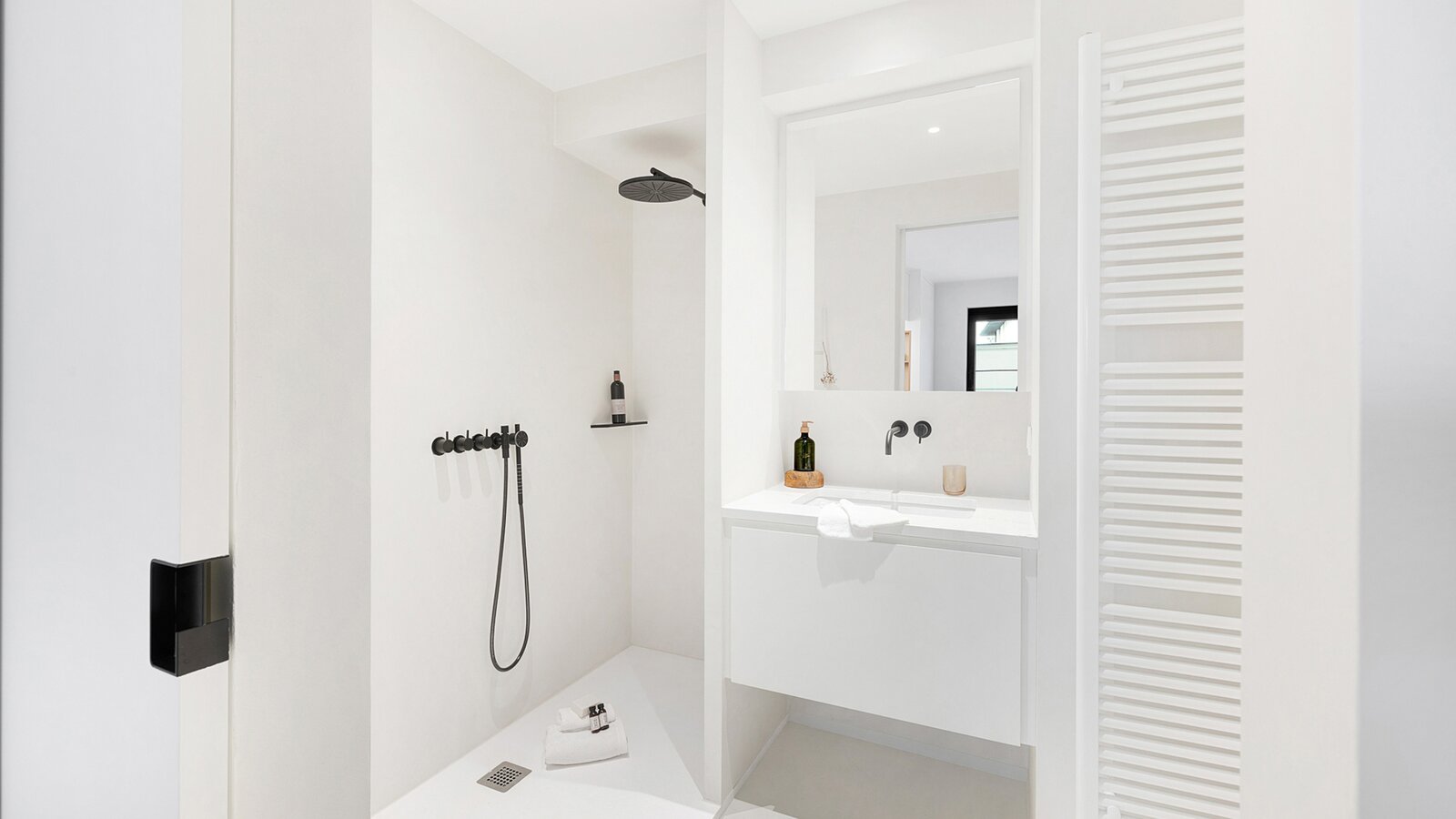 The layout includes an entrance hall with checkroom and guest toilet, a bright living room with panoramic sea view, a fully equipped kitchen with dining area, three full bedrooms and three stylish bathrooms.