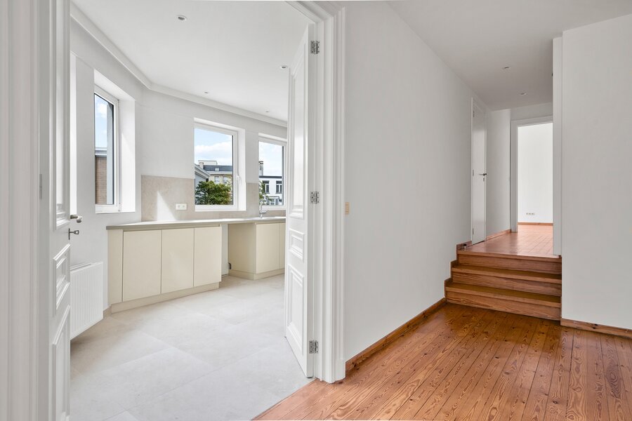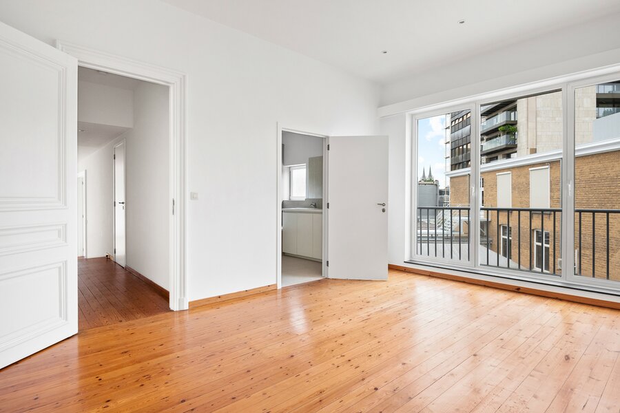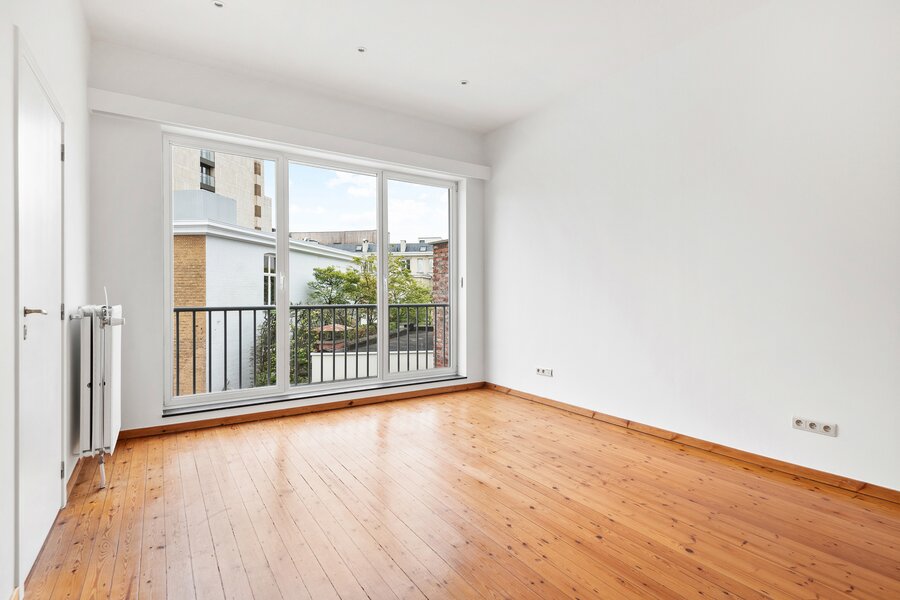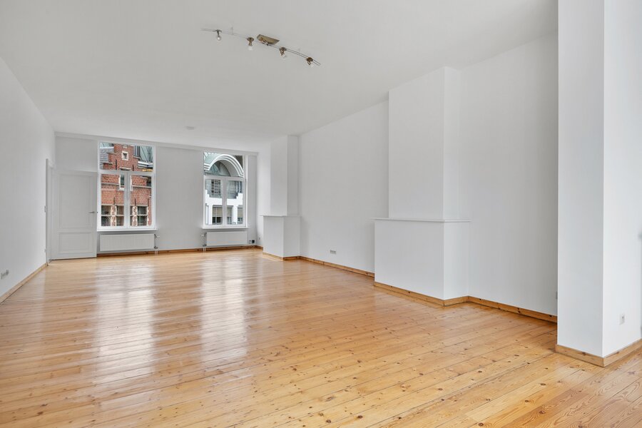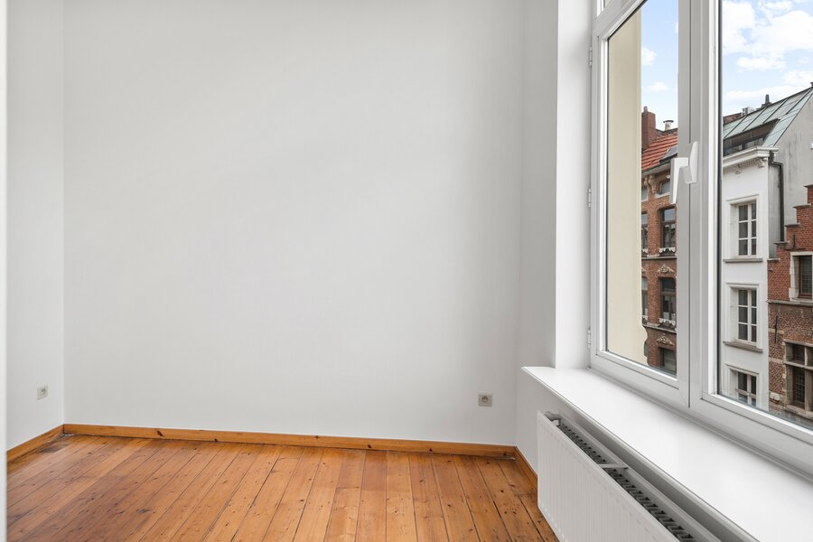 This extremely light-filled apartment is located directly opposite the Bourla Theater and between Schuttershofstraat and Leopoldstraat. The early twentieth-century building consists of a total of 4 spacious units. The apartment on the second floor has a spacious bedroom and a second room that can possibly be arranged as an office or children's room. There is one very large open living area with a parquet floor, pleasant ceiling heights, and beautiful authentic wooden floors. The fully equipped bathroom with a separate bath, separate walk-in shower, and double sink has recently been provided with new tiling. The large kitchen is fully installed – dishwasher, new ceramic hob, oven, and offers space for a personal American fridge – and, with its southwestern orientation, lets in an enormous amount of light. Thanks to the favorable orientation of the living area and the large windows, an actual terrace feeling is created inside – as if the outdoor life seamlessly continues indoors. The living area and bedroom are equipped with automatic sun blinds. Provision for common costs: €150 per month.