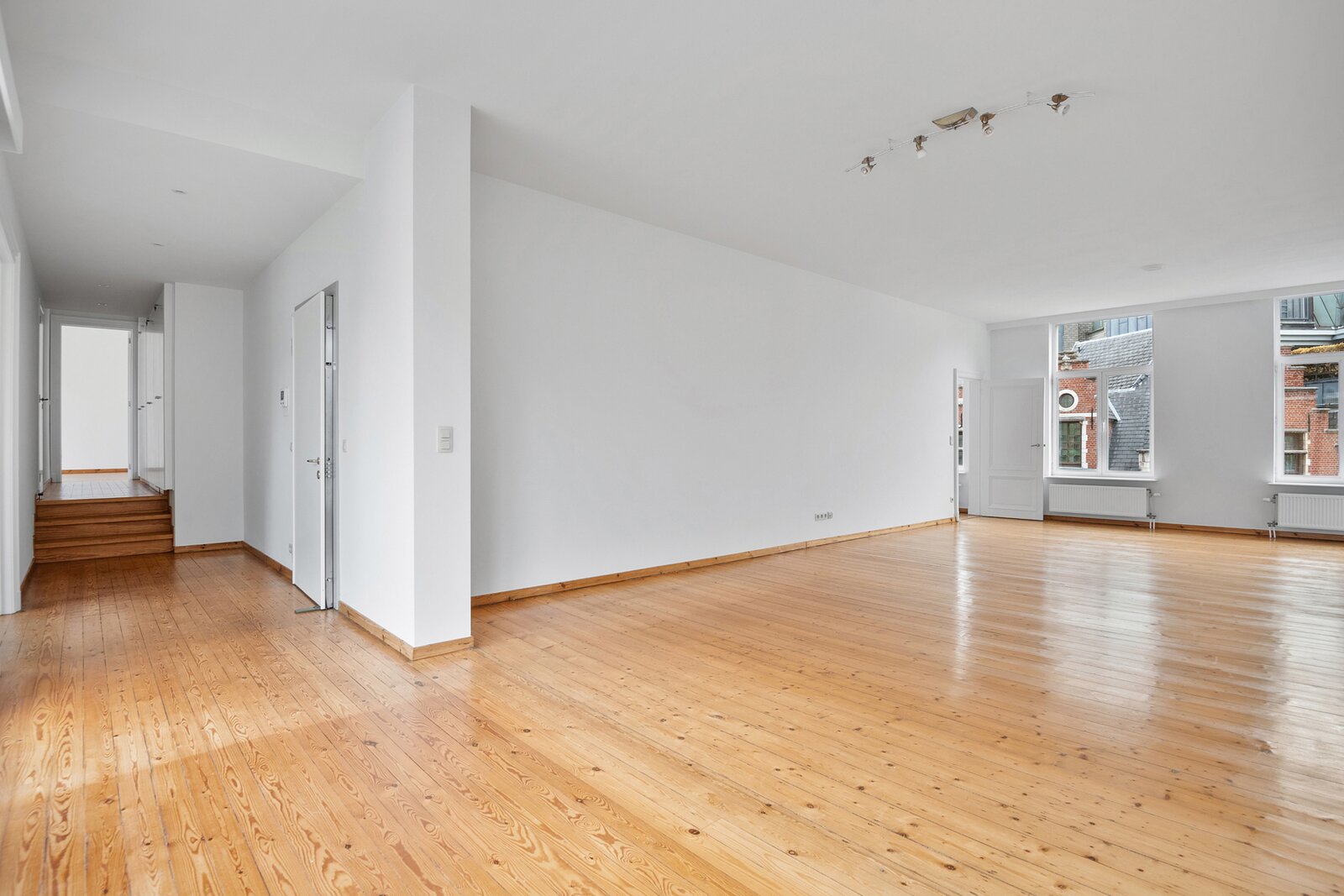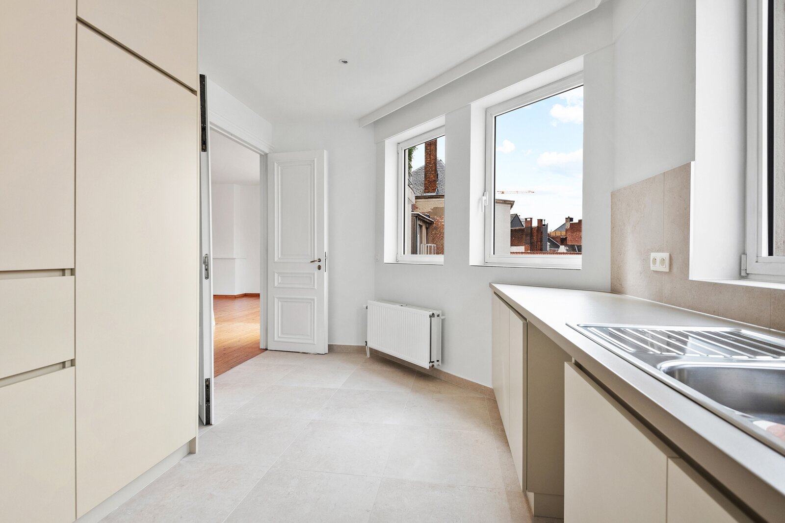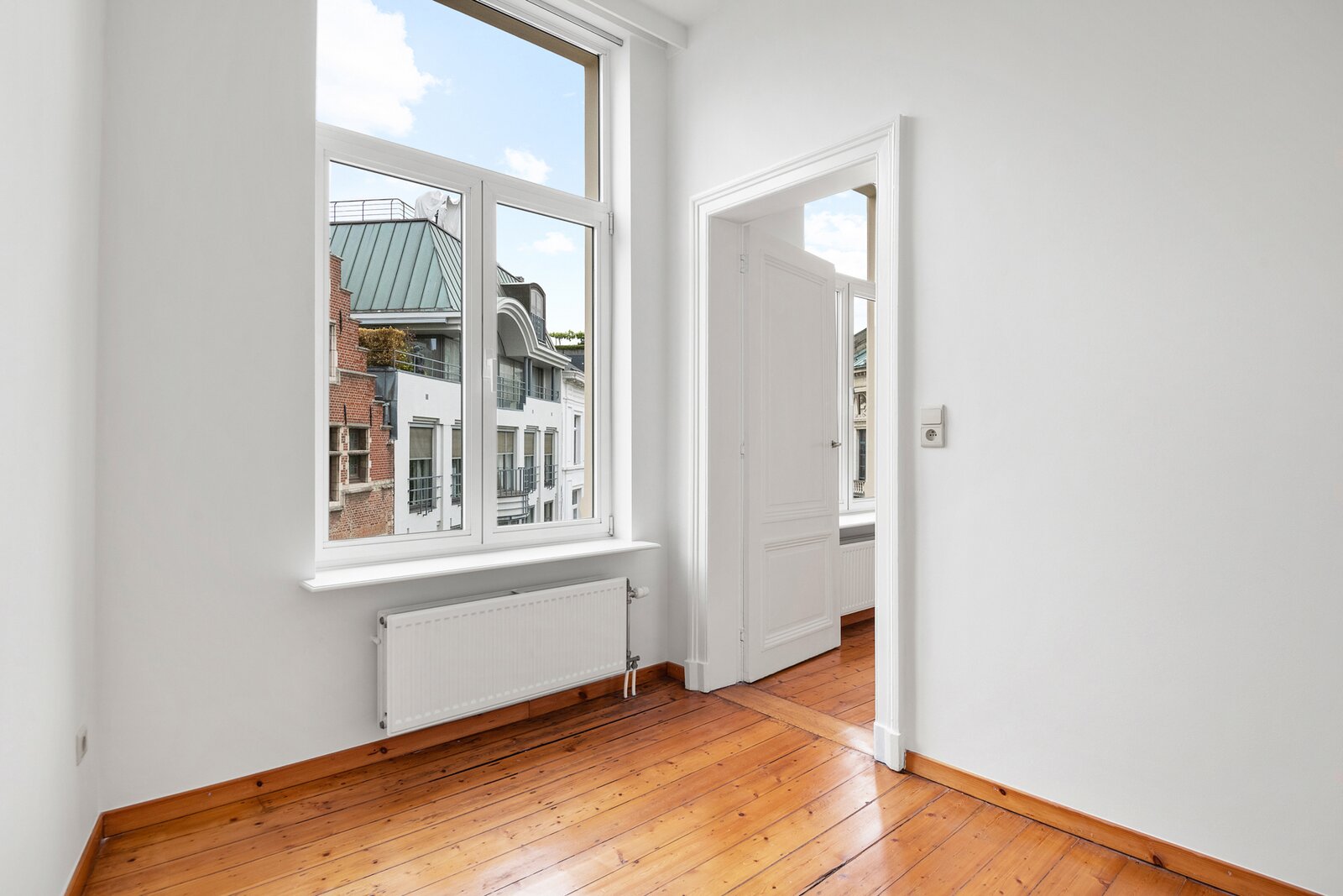 This extremely light-filled apartment is located directly opposite the Bourla Theater and between Schuttershofstraat and Leopoldstraat. The early twentieth-century building consists of a total of 4 spacious units. The apartment on the second floor has a spacious bedroom and a second room that can possibly be arranged as an office or children's room. There is one very large open living area with a parquet floor, pleasant ceiling heights, and beautiful authentic wooden floors. The fully equipped bathroom with a separate bath, separate walk-in shower, and double sink has recently been provided with new tiling. The large kitchen is fully installed – dishwasher, new ceramic hob, oven, and offers space for a personal American fridge – and, with its southwestern orientation, lets in an enormous amount of light. Thanks to the favorable orientation of the living area and the large windows, an actual terrace feeling is created inside – as if the outdoor life seamlessly continues indoors. The living area and bedroom are equipped with automatic sun blinds. Provision for common costs: €150 per month.