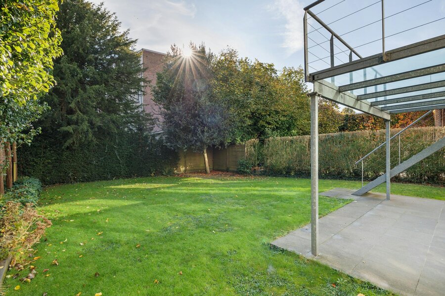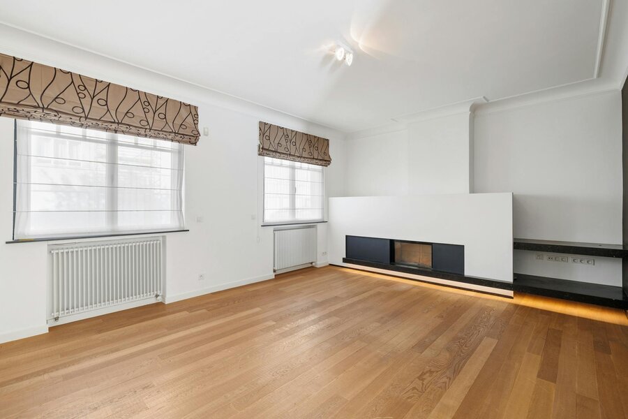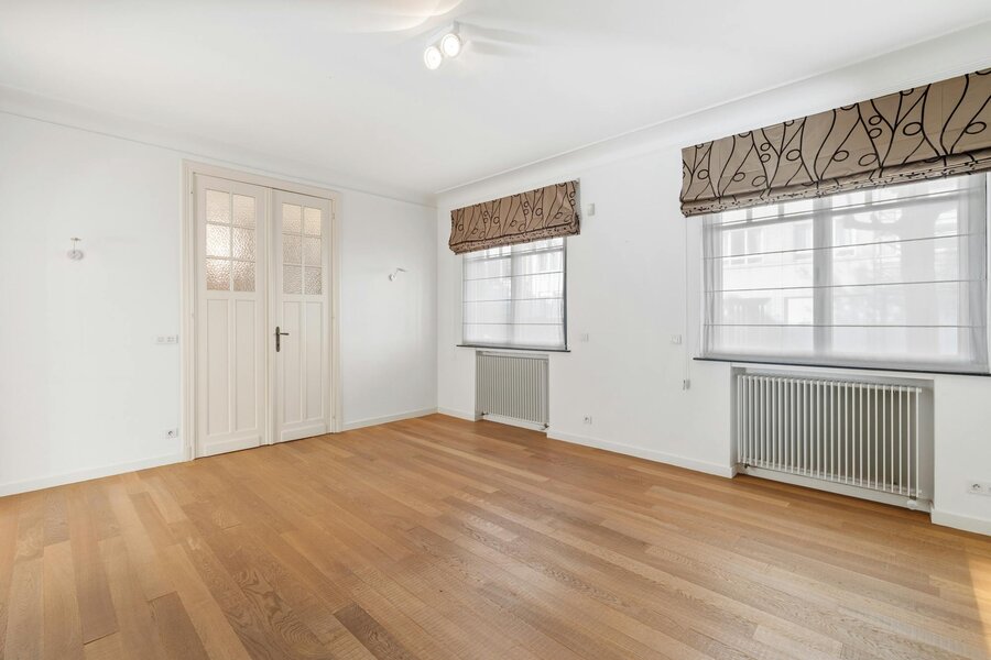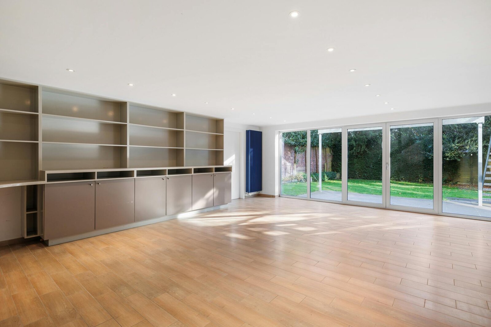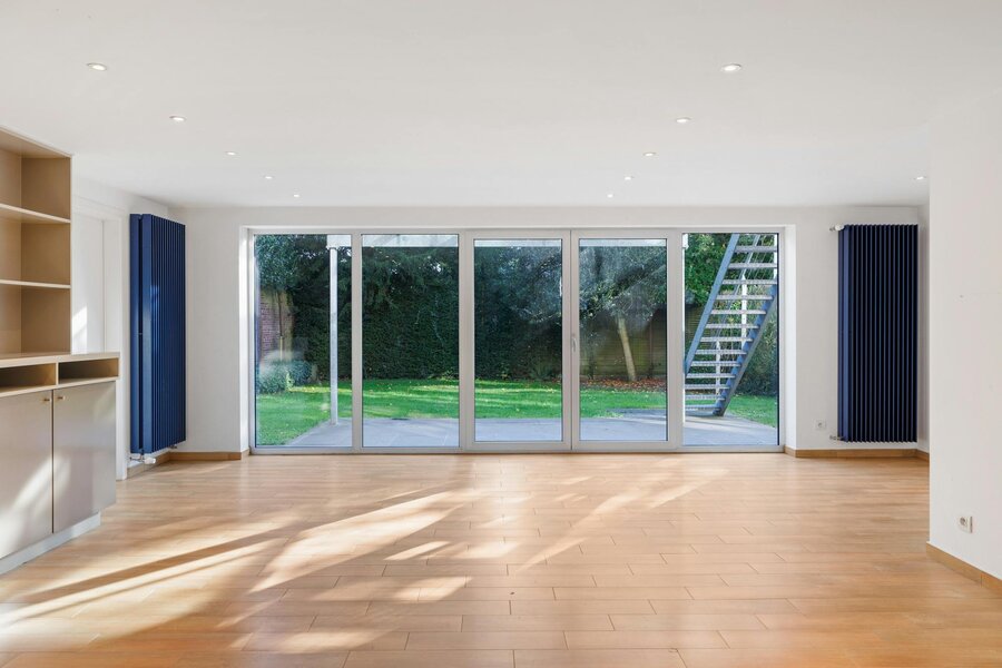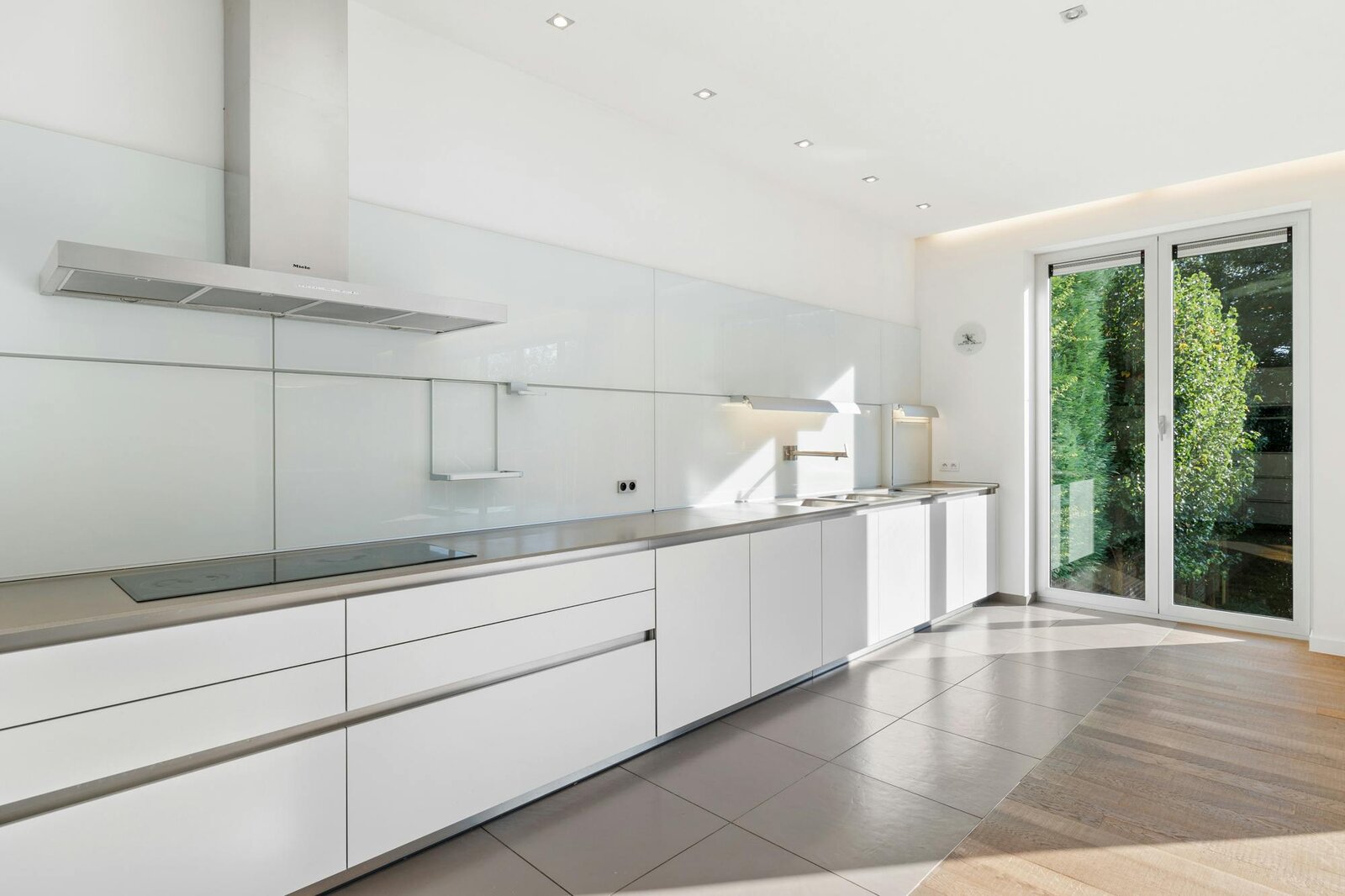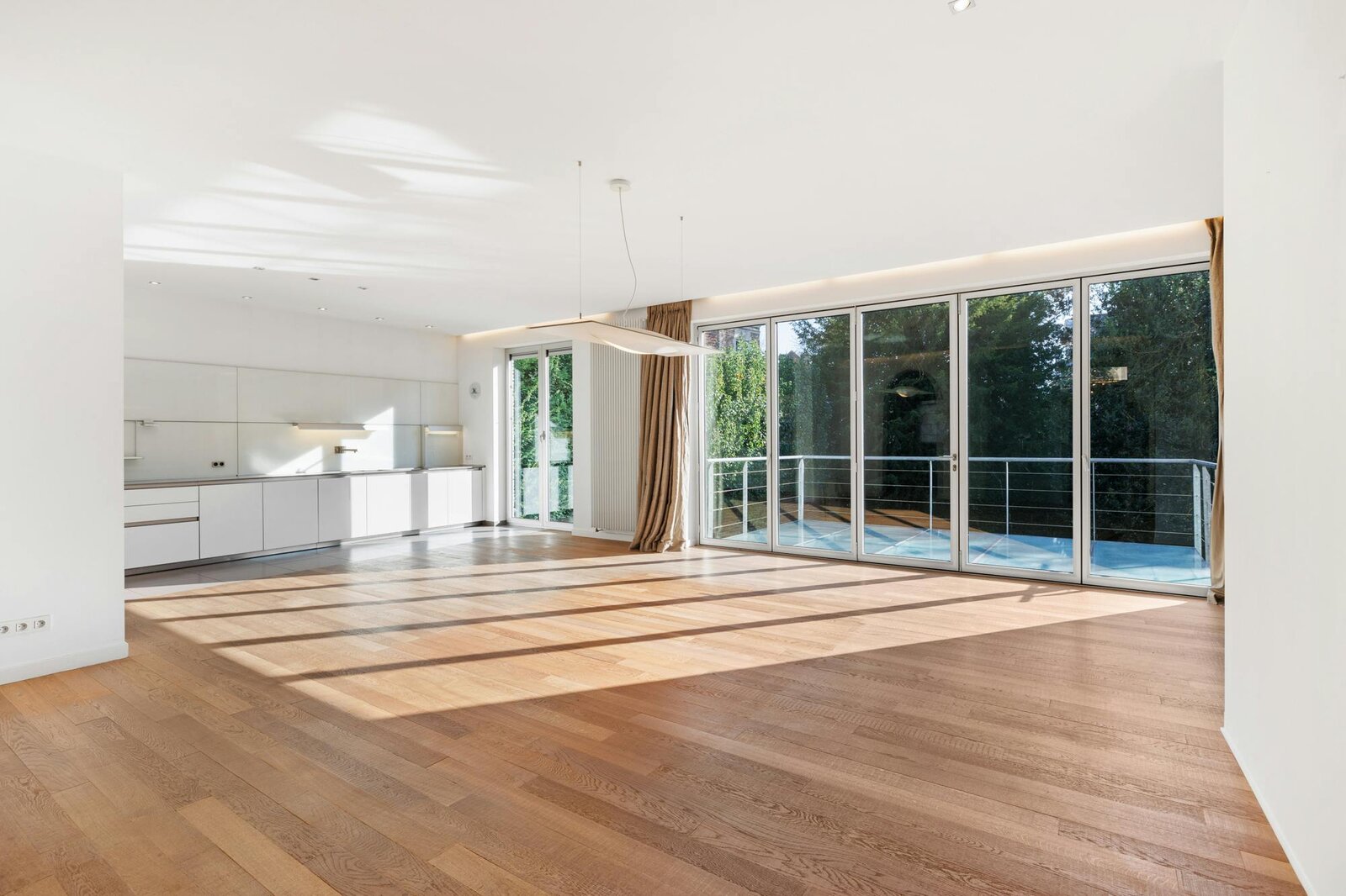 The stately entrance hall leads to an exceptionally spacious and bright living area. This open space includes a cosy sitting room with a fireplace and a dining area that flows into the hyper-equipped Bulthaup kitchen. Large glass panels open onto the south-facing terrace and the low-maintenance garden of ± 215 m², ensuring an abundance of light.