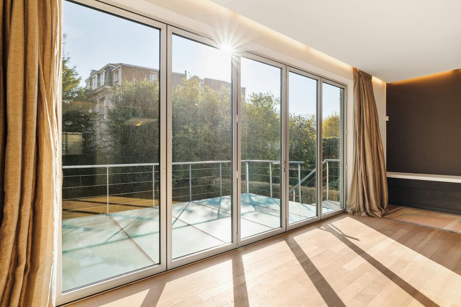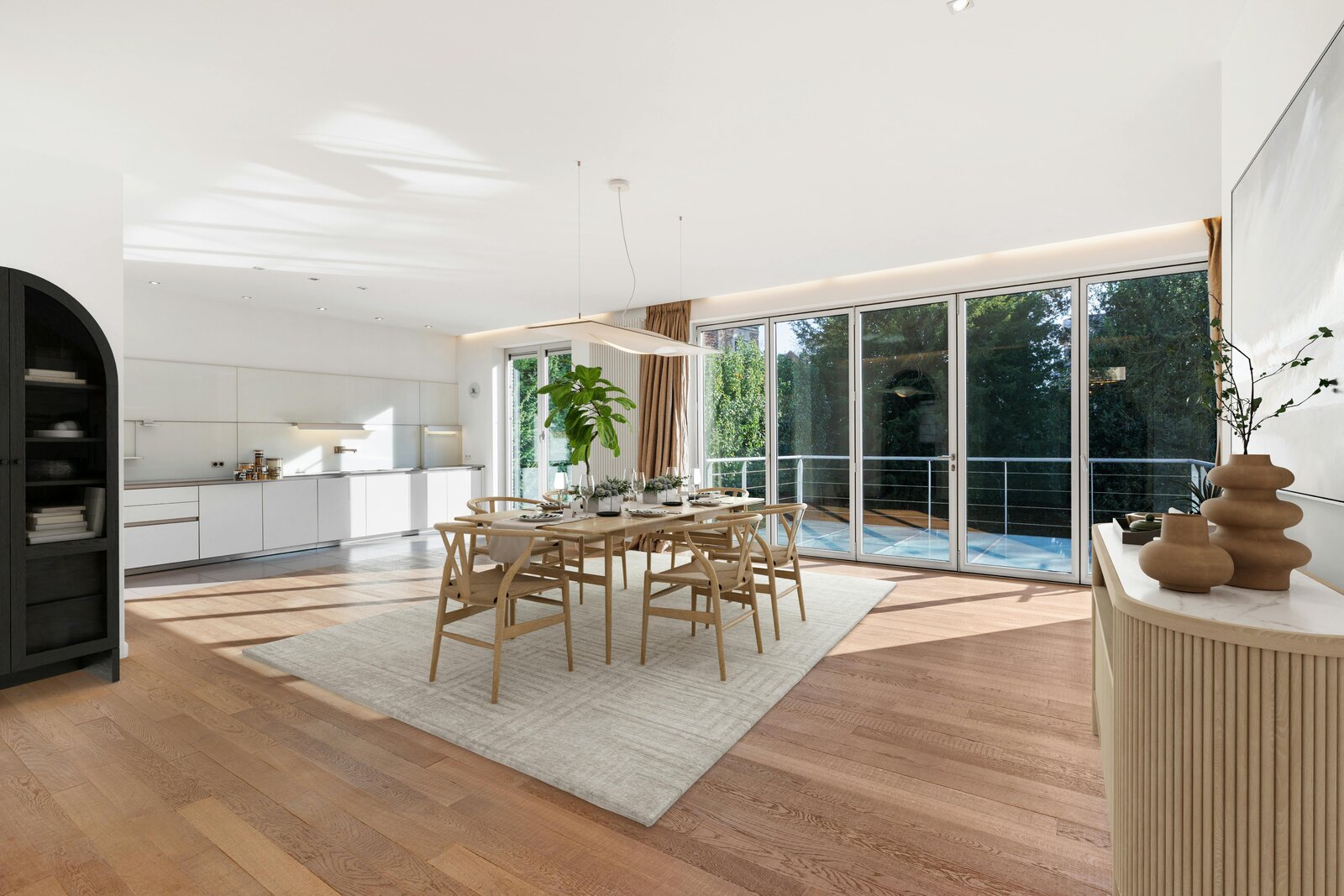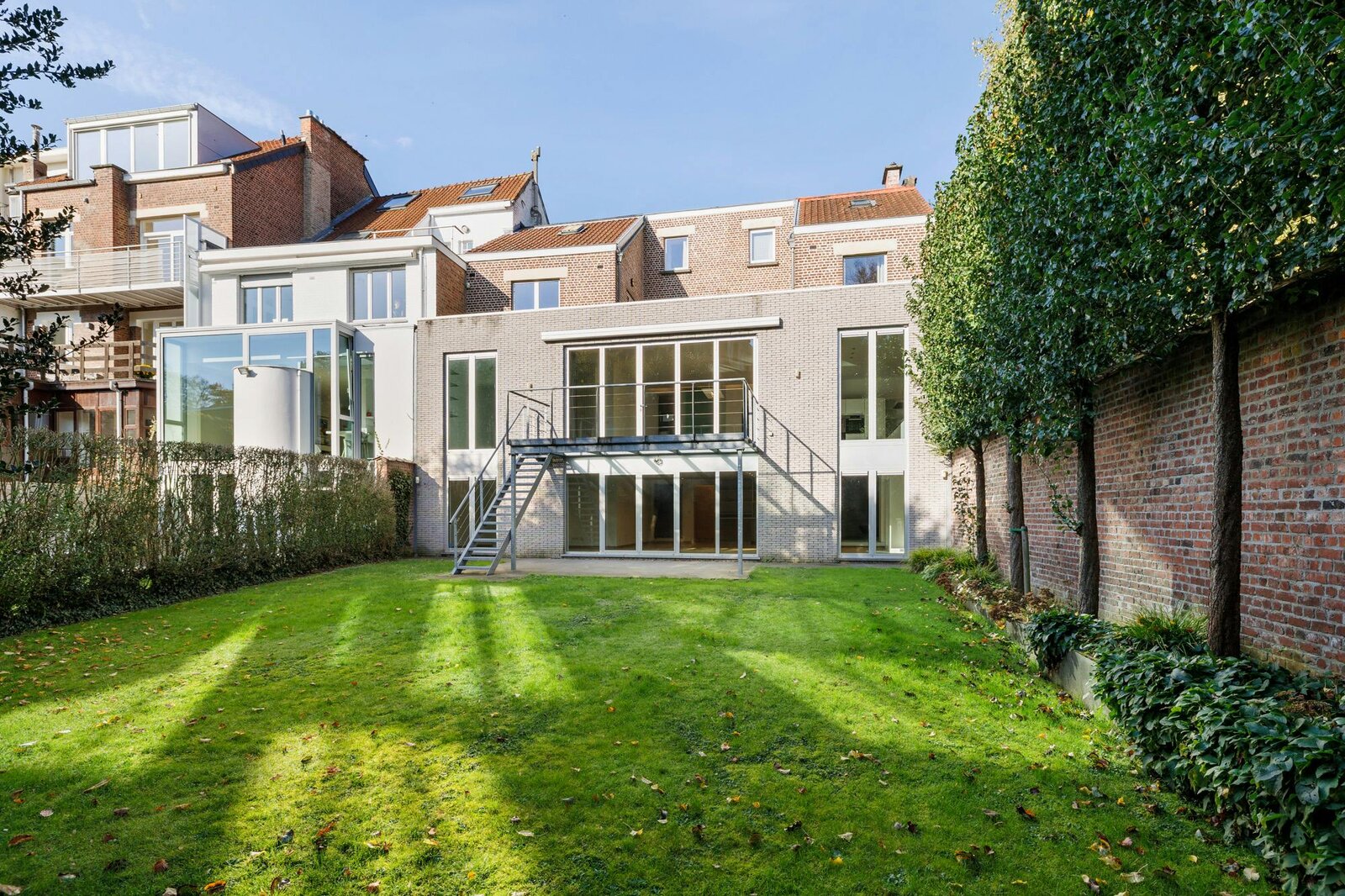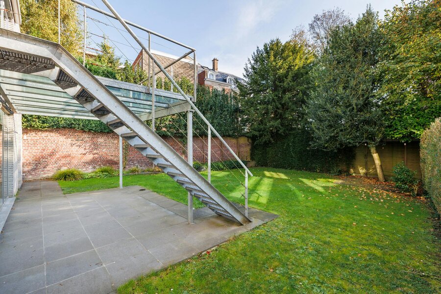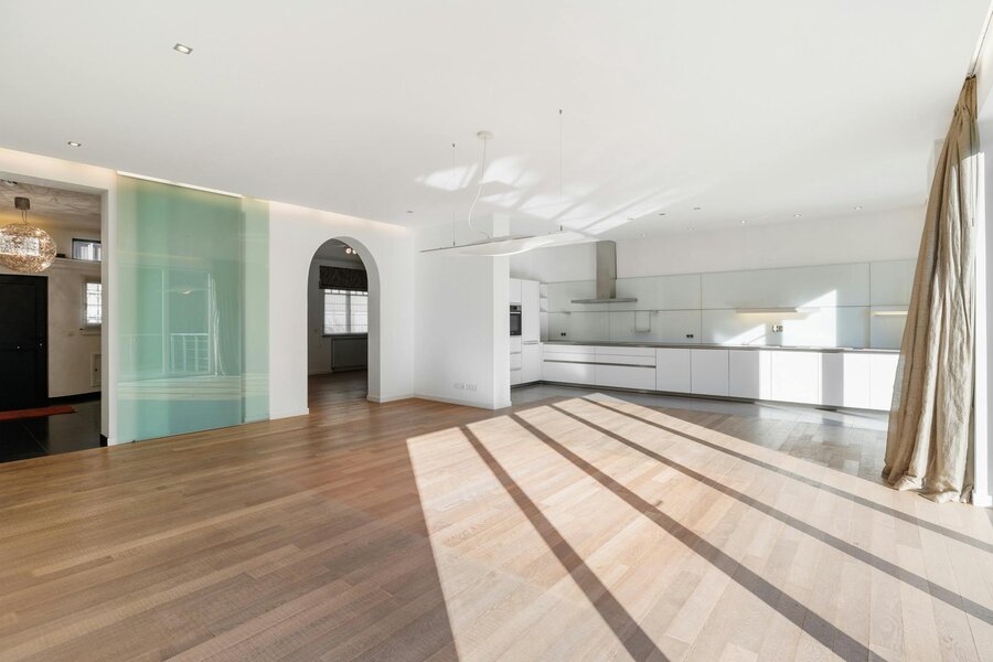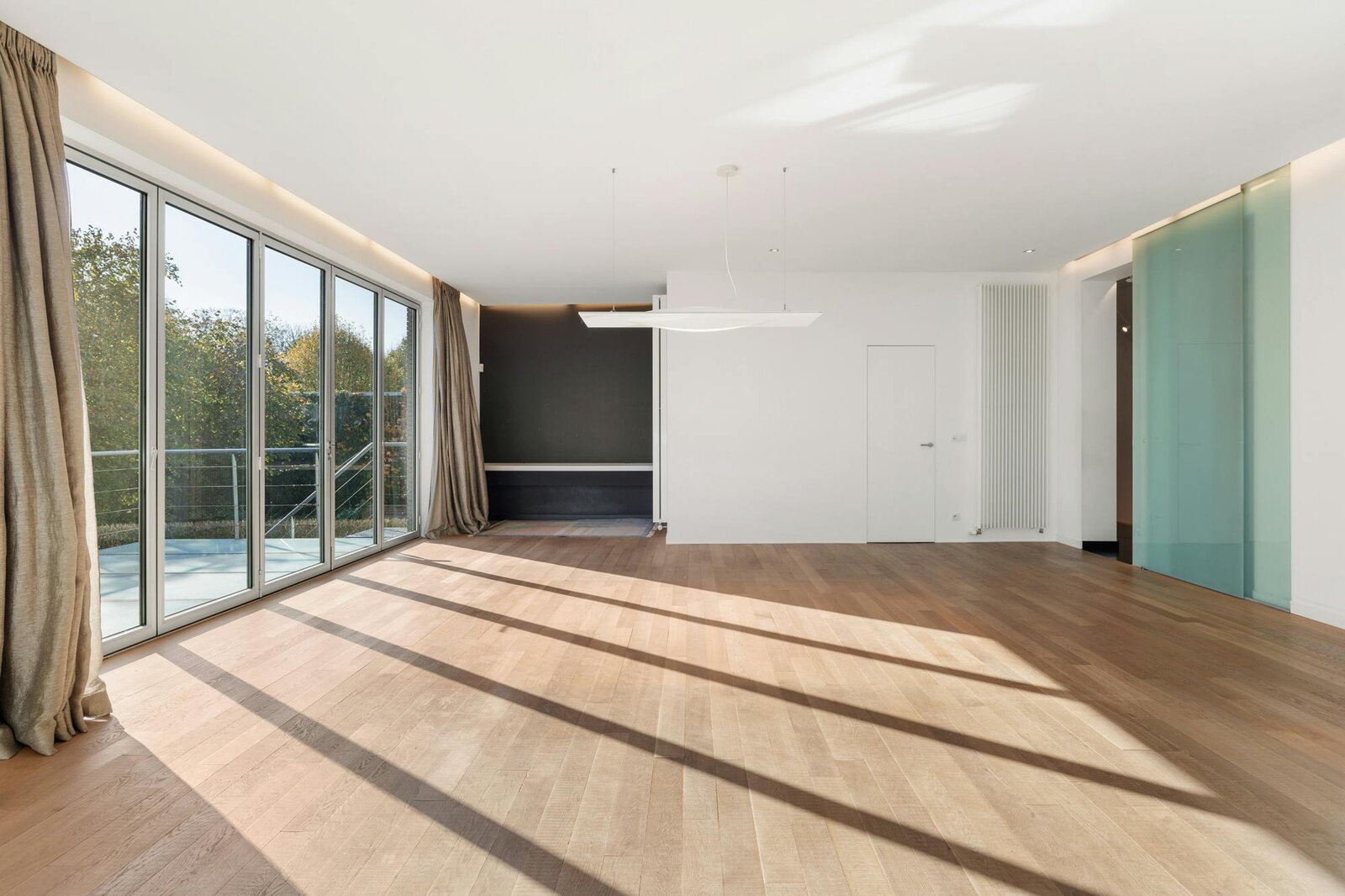 The stately entrance hall leads to an exceptionally spacious and bright living area. This open space includes a cosy sitting room with a fireplace and a dining area that flows into the hyper-equipped Bulthaup kitchen. Large glass panels open onto the south-facing terrace and the low-maintenance garden of ± 215 m², ensuring an abundance of light.