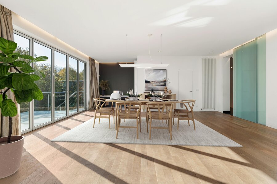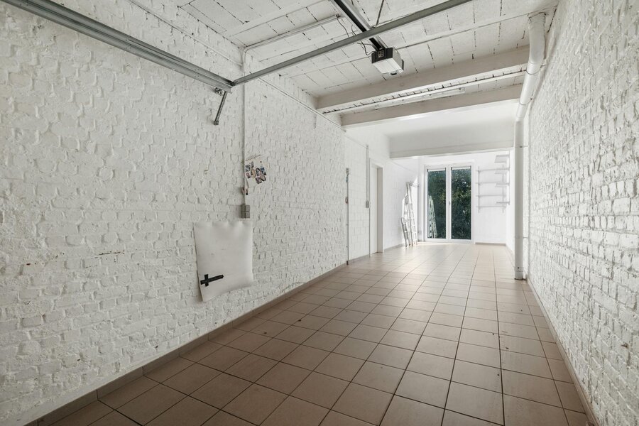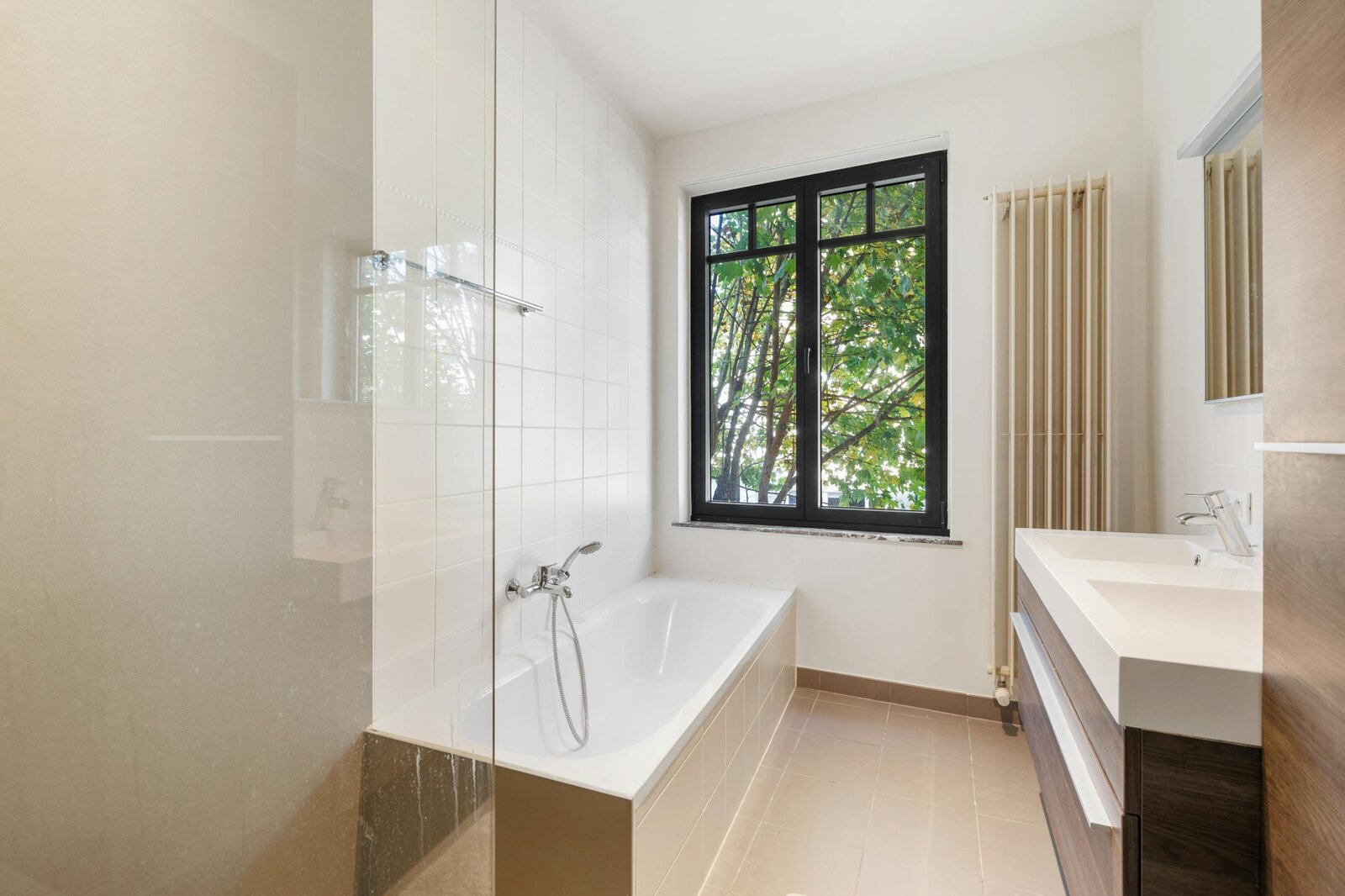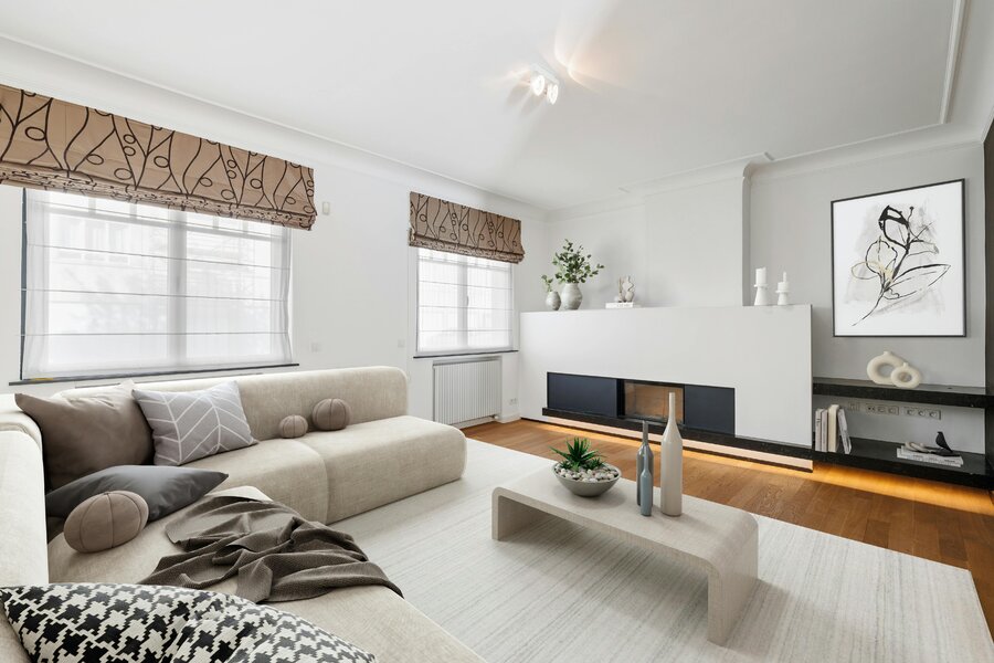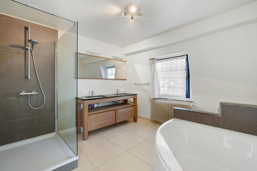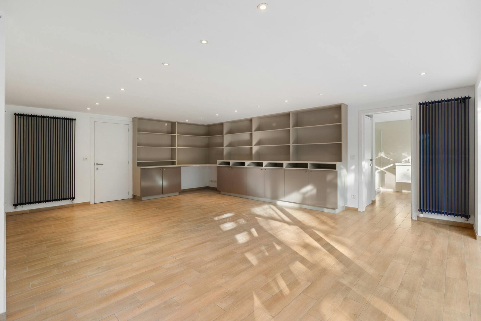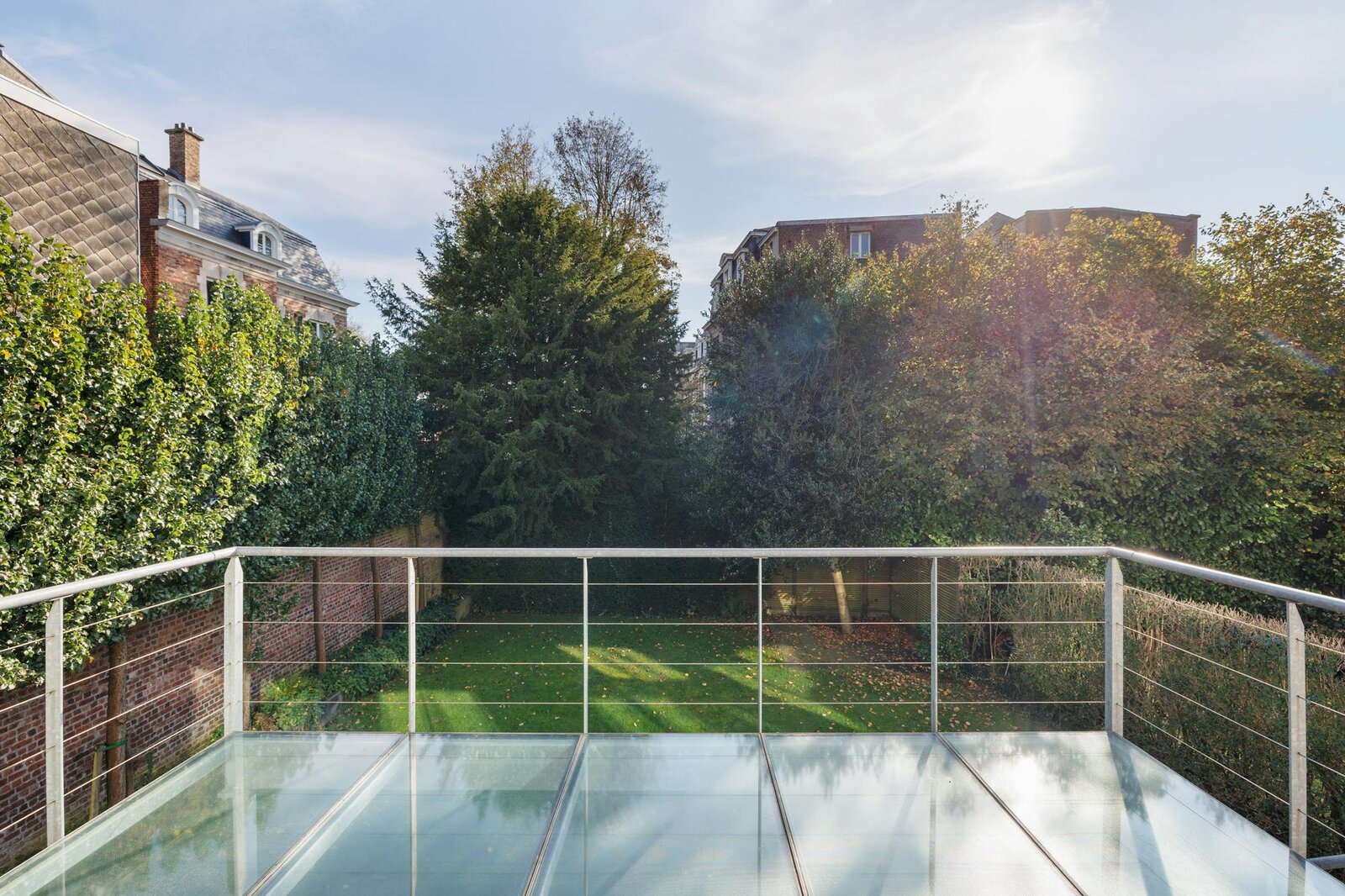 The stately entrance hall leads to an exceptionally spacious and bright living area. This open space includes a cosy sitting room with a fireplace and a dining area that flows into the hyper-equipped Bulthaup kitchen. Large glass panels open onto the south-facing terrace and the low-maintenance garden of ± 215 m², ensuring an abundance of light.