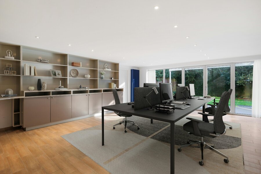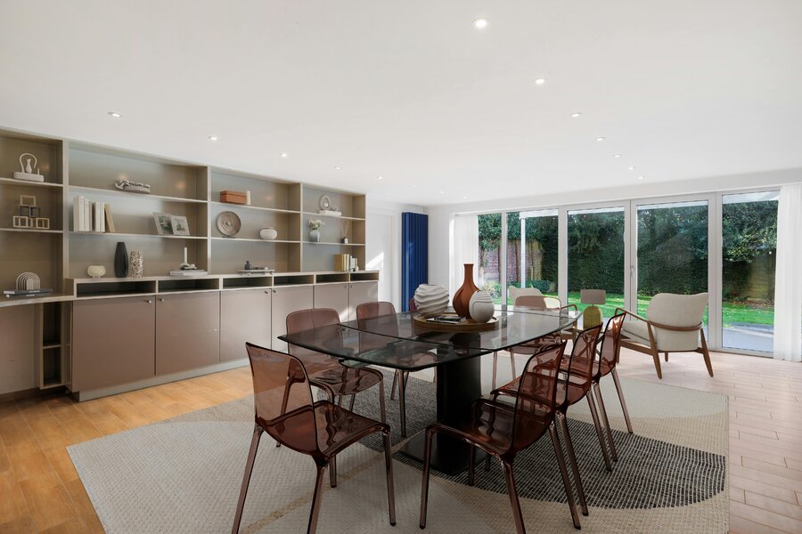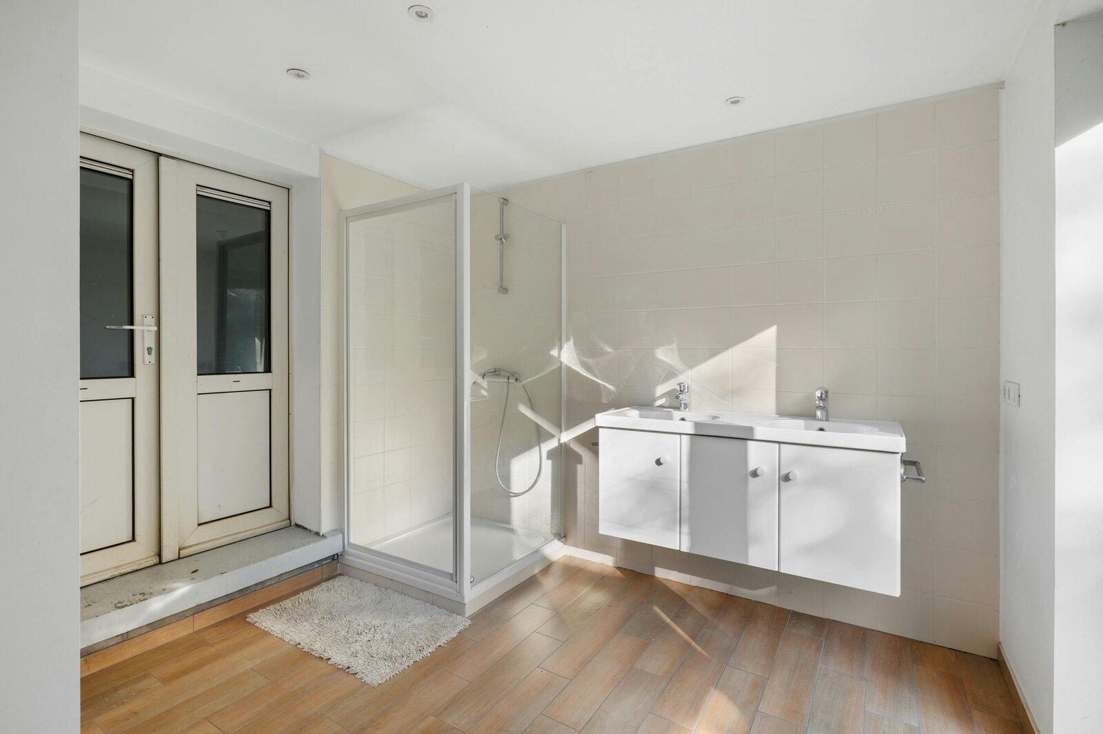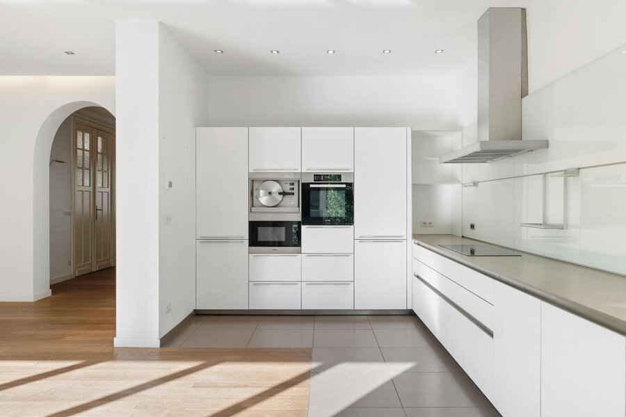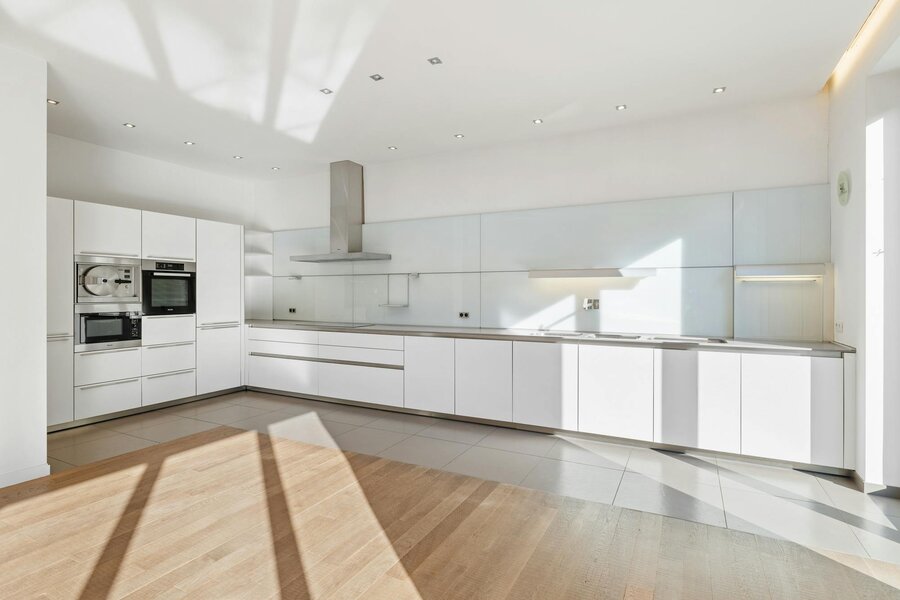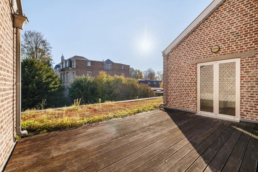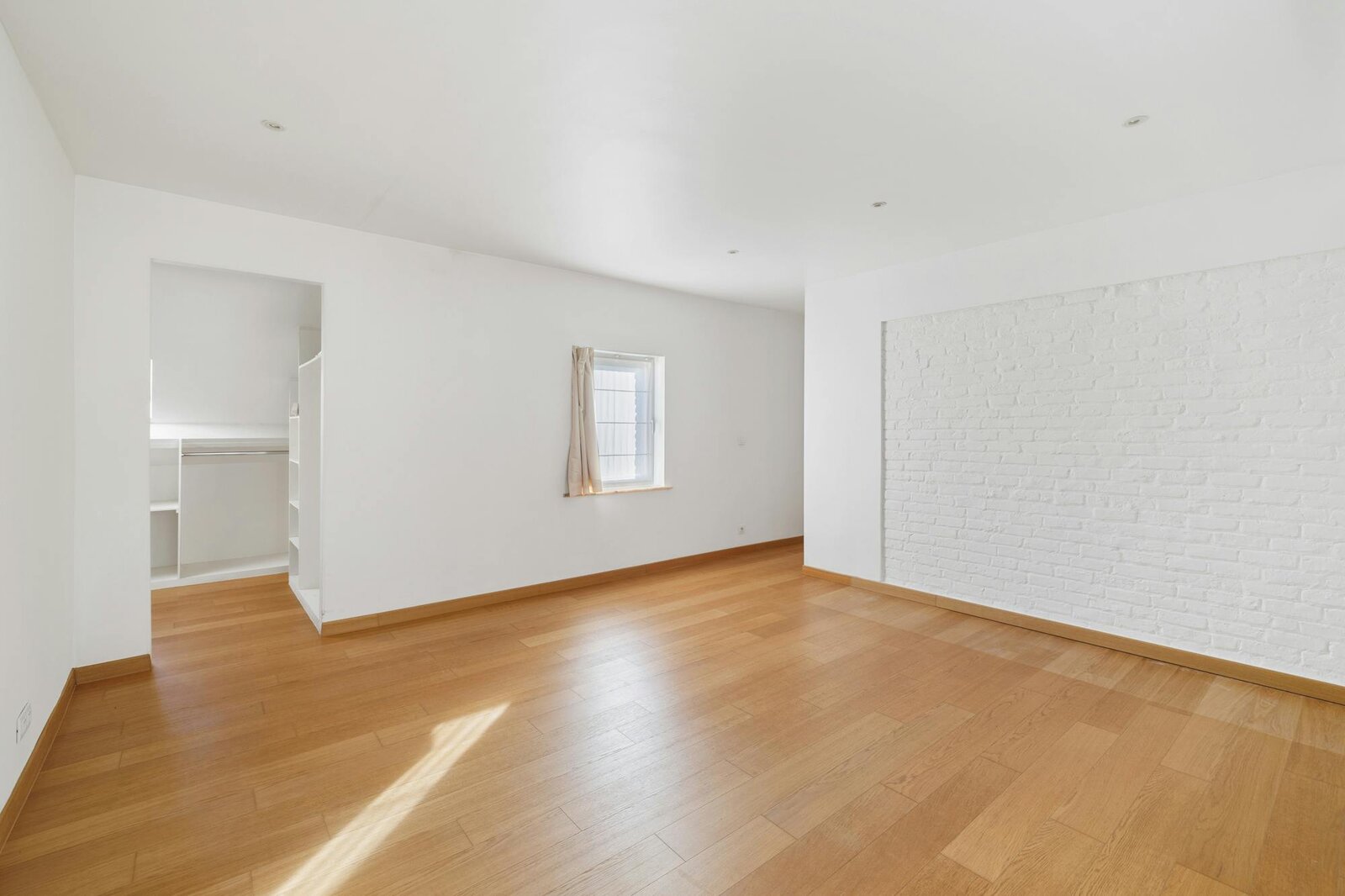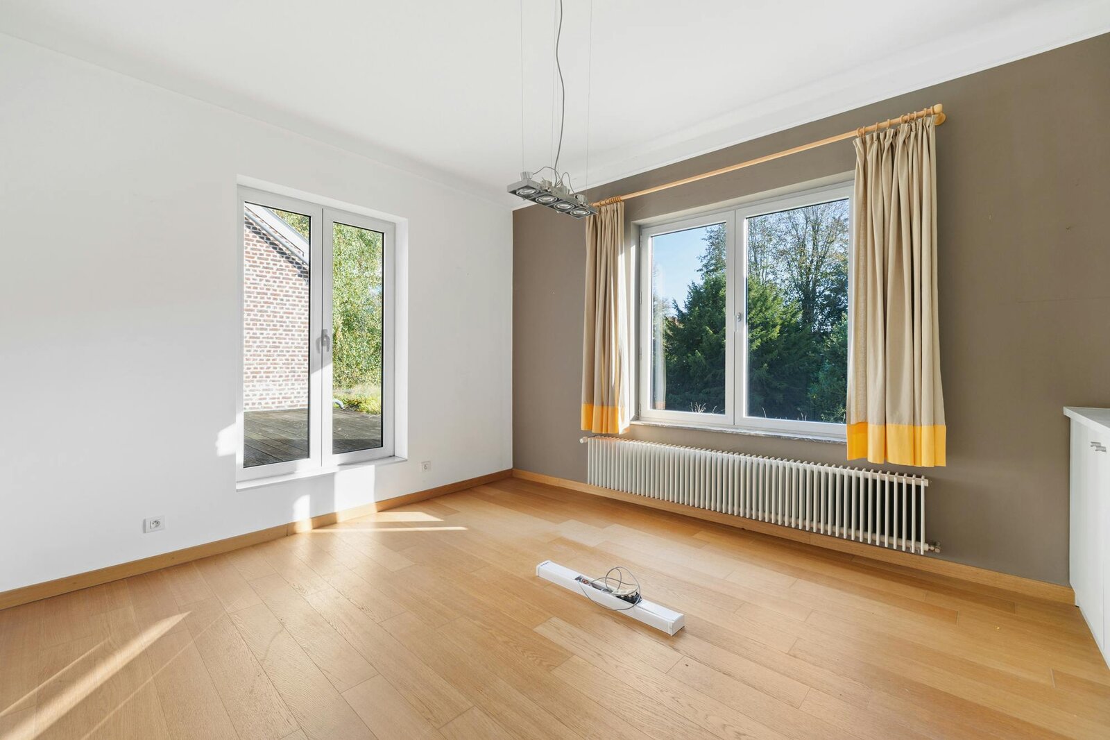 The stately entrance hall leads to an exceptionally spacious and bright living area. This open space includes a cosy sitting room with a fireplace and a dining area that flows into the hyper-equipped Bulthaup kitchen. Large glass panels open onto the south-facing terrace and the low-maintenance garden of ± 215 m², ensuring an abundance of light.