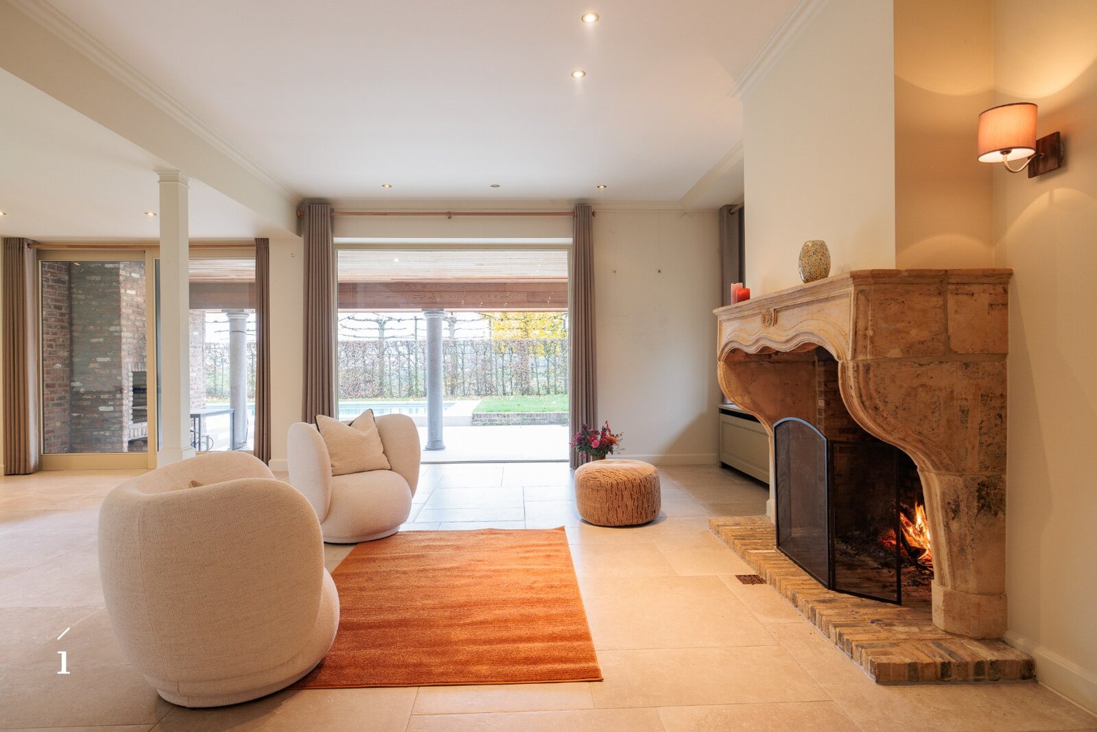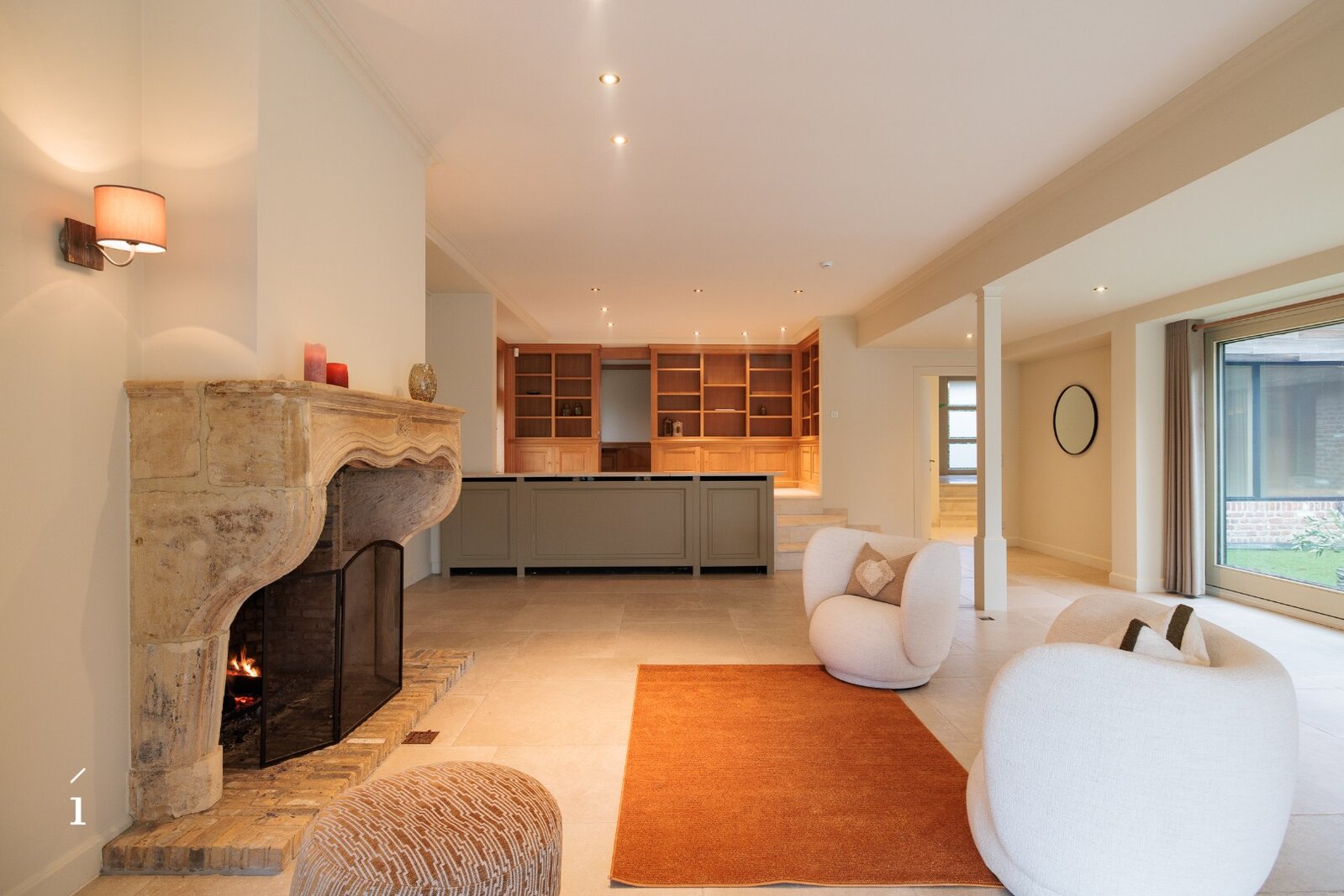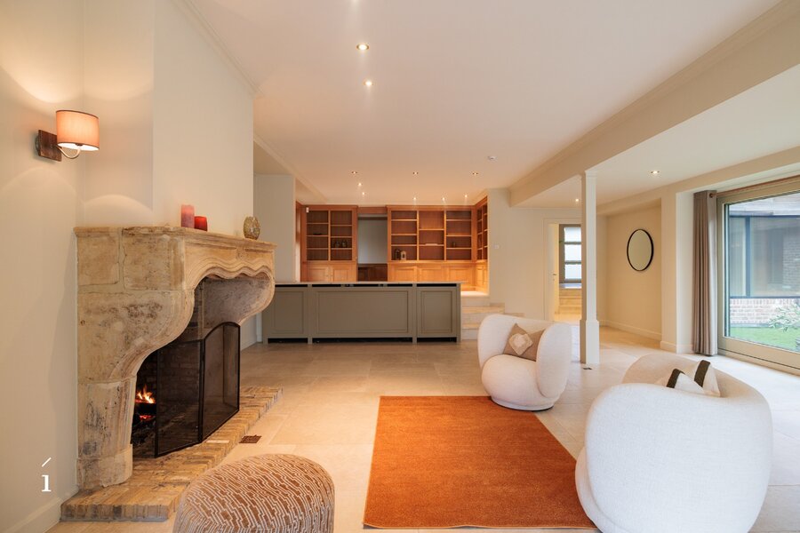 Bij het binnenkomen valt meteen het warme karakter van de woning op. De ruime inkomhal leidt naar een lichtrijke woonkamer met een authentieke Franse kasteelhaard als sfeervol middelpunt. Dankzij de centrale patio stroomt het licht rijkelijk binnen en ontstaat een vloeiende verbinding met de eetkamer, waar opnieuw een haard voor zachtheid zorgt. Buiten geniet u van zicht op de tuin, het verwarmde zwembad, een ruim terras en een uitnodigende buitenhaard.