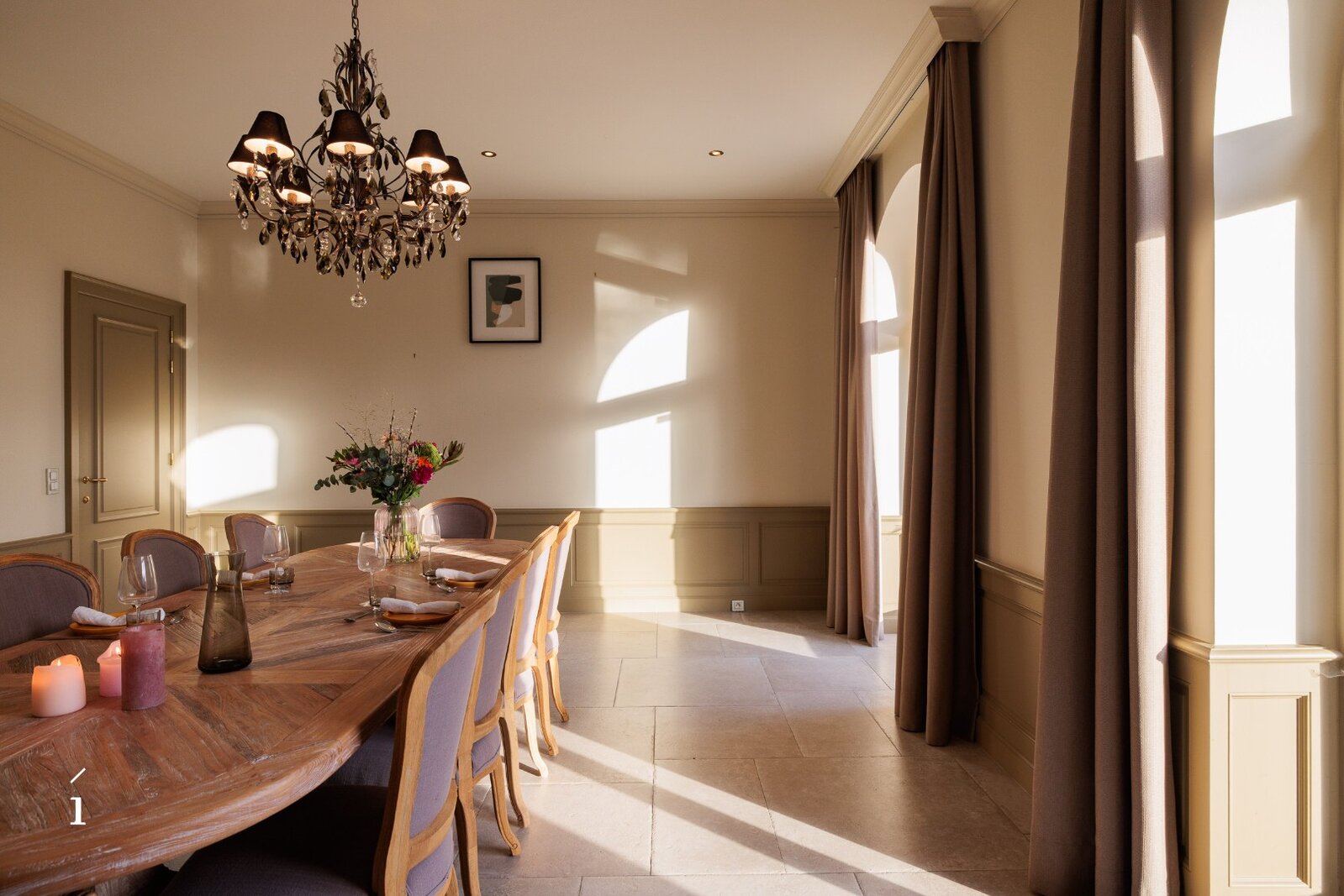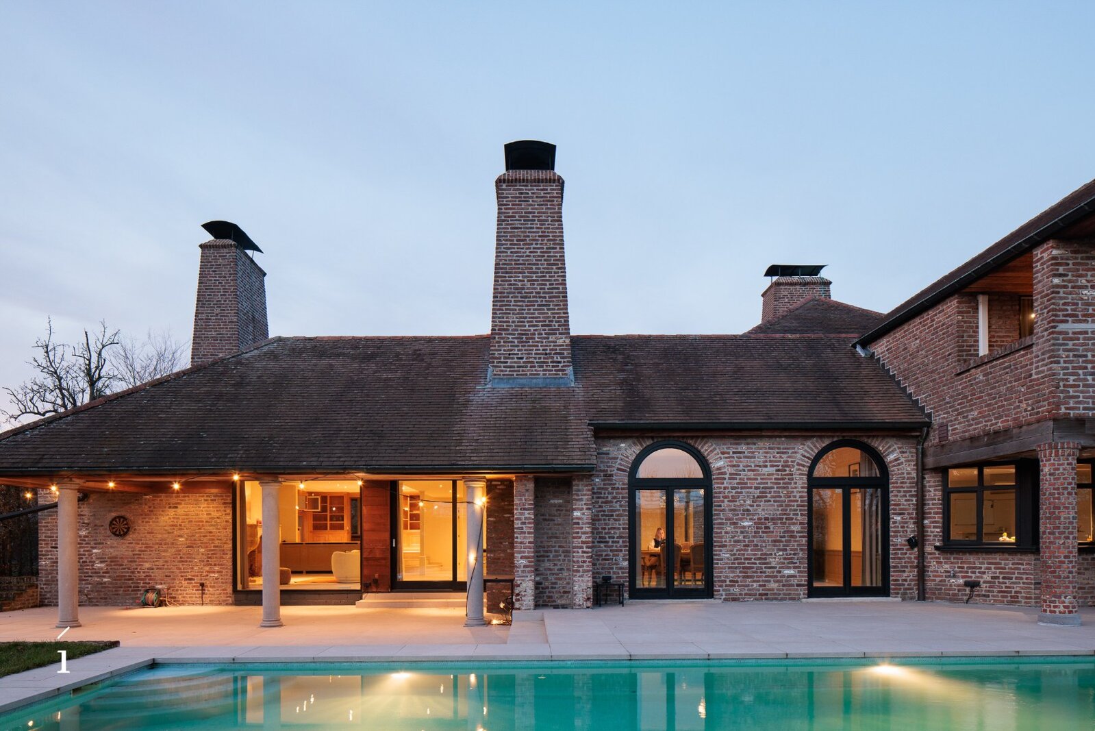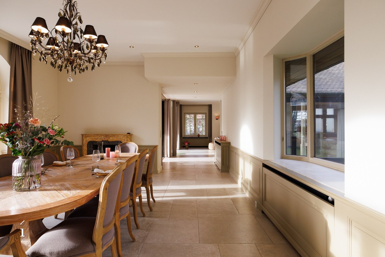 Bij het binnenkomen valt meteen het warme karakter van de woning op. De ruime inkomhal leidt naar een lichtrijke woonkamer met een authentieke Franse kasteelhaard als sfeervol middelpunt. Dankzij de centrale patio stroomt het licht rijkelijk binnen en ontstaat een vloeiende verbinding met de eetkamer, waar opnieuw een haard voor zachtheid zorgt. Buiten geniet u van zicht op de tuin, het verwarmde zwembad, een ruim terras en een uitnodigende buitenhaard.