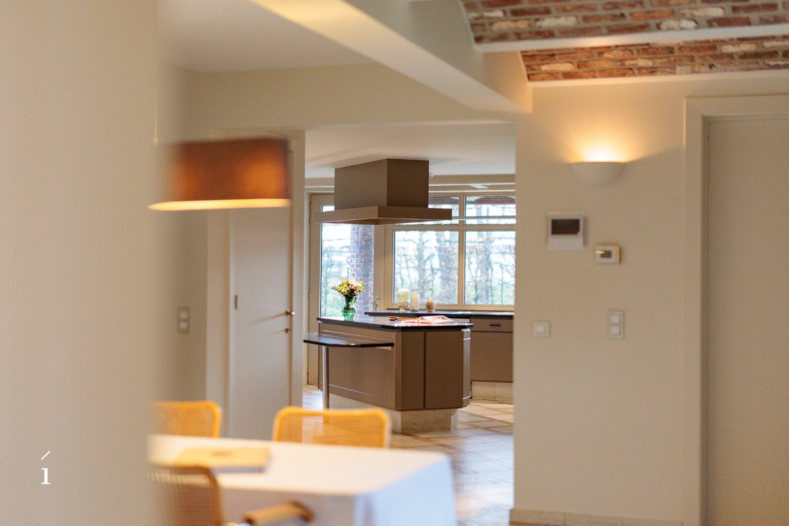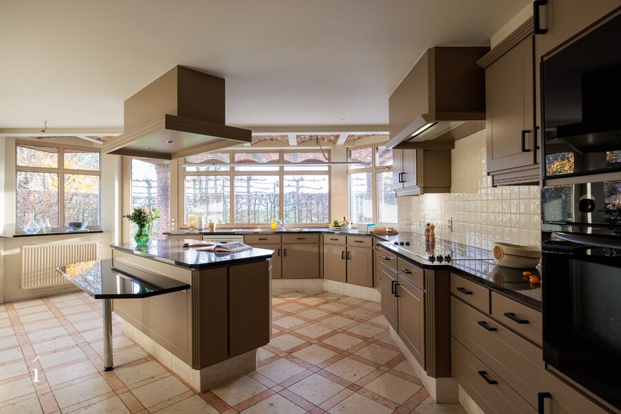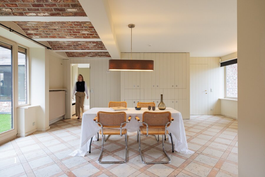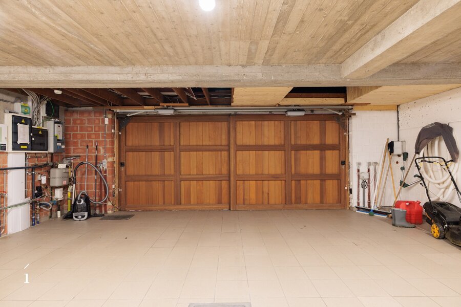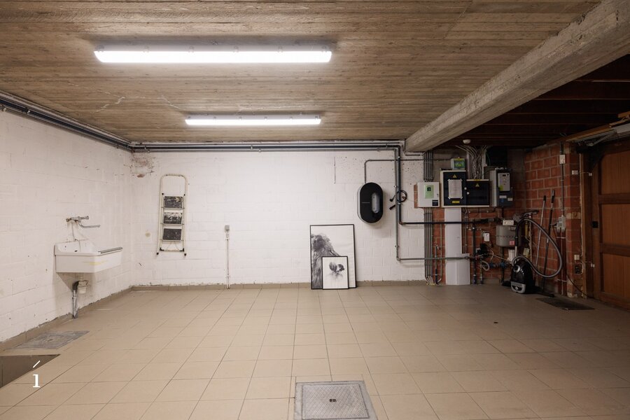 Aansluitend op de eetkamer bevindt zich de ruime leefkeuken, met zicht op de tuin en het overdekte terras. Warme materialen, maatwerk en natuurlijk licht maken dit tot een plek waar koken en leven samenkomen. Vanuit de keuken is er toegang tot de berging, wasruimte, droge kelder en de ruime dubbele inpandige garage. Verder op het gelijkvloers vindt u een polyvalente kamer met massief houten maatkasten, ideaal als bureau, leesruimte of een extra slaapkamer.