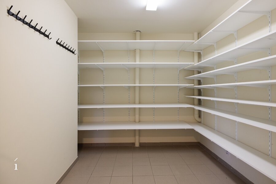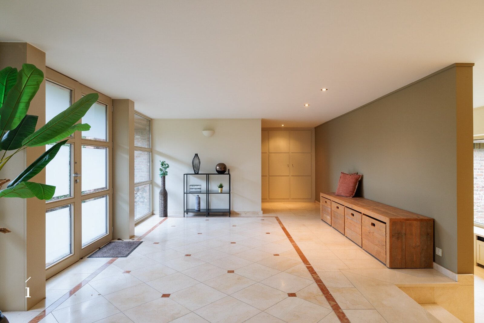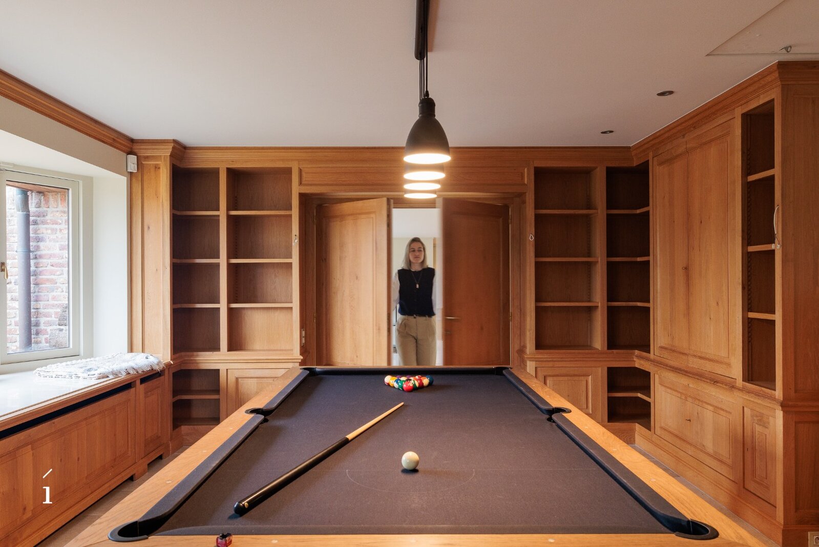 Aansluitend op de eetkamer bevindt zich de ruime leefkeuken, met zicht op de tuin en het overdekte terras. Warme materialen, maatwerk en natuurlijk licht maken dit tot een plek waar koken en leven samenkomen. Vanuit de keuken is er toegang tot de berging, wasruimte, droge kelder en de ruime dubbele inpandige garage. Verder op het gelijkvloers vindt u een polyvalente kamer met massief houten maatkasten, ideaal als bureau, leesruimte of een extra slaapkamer.