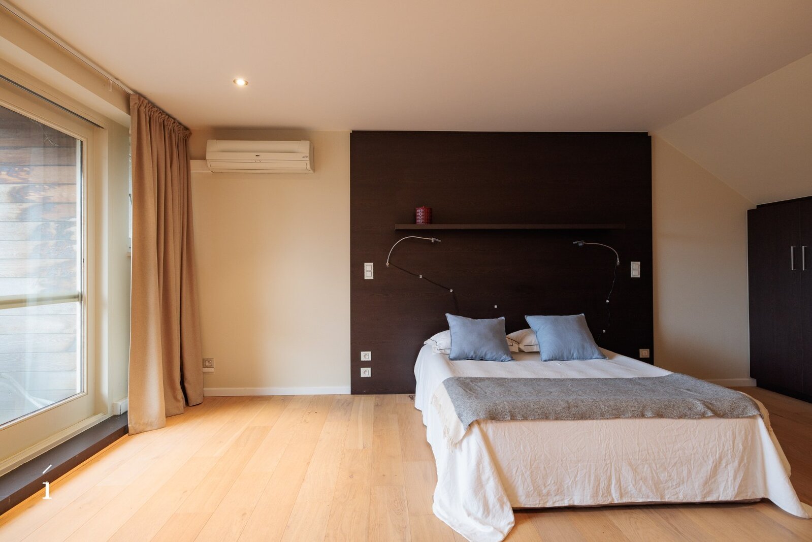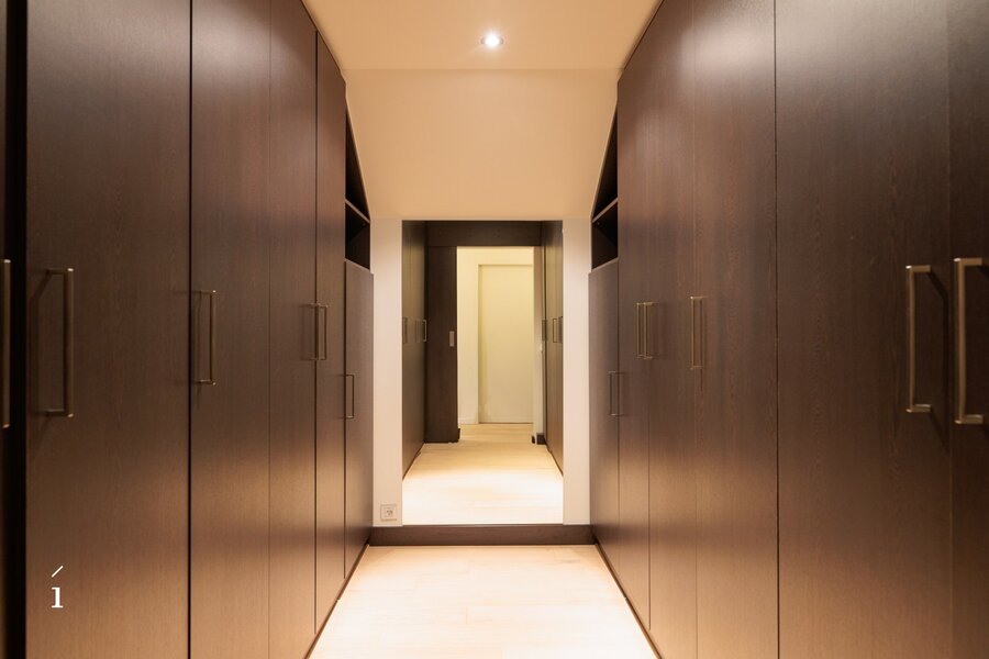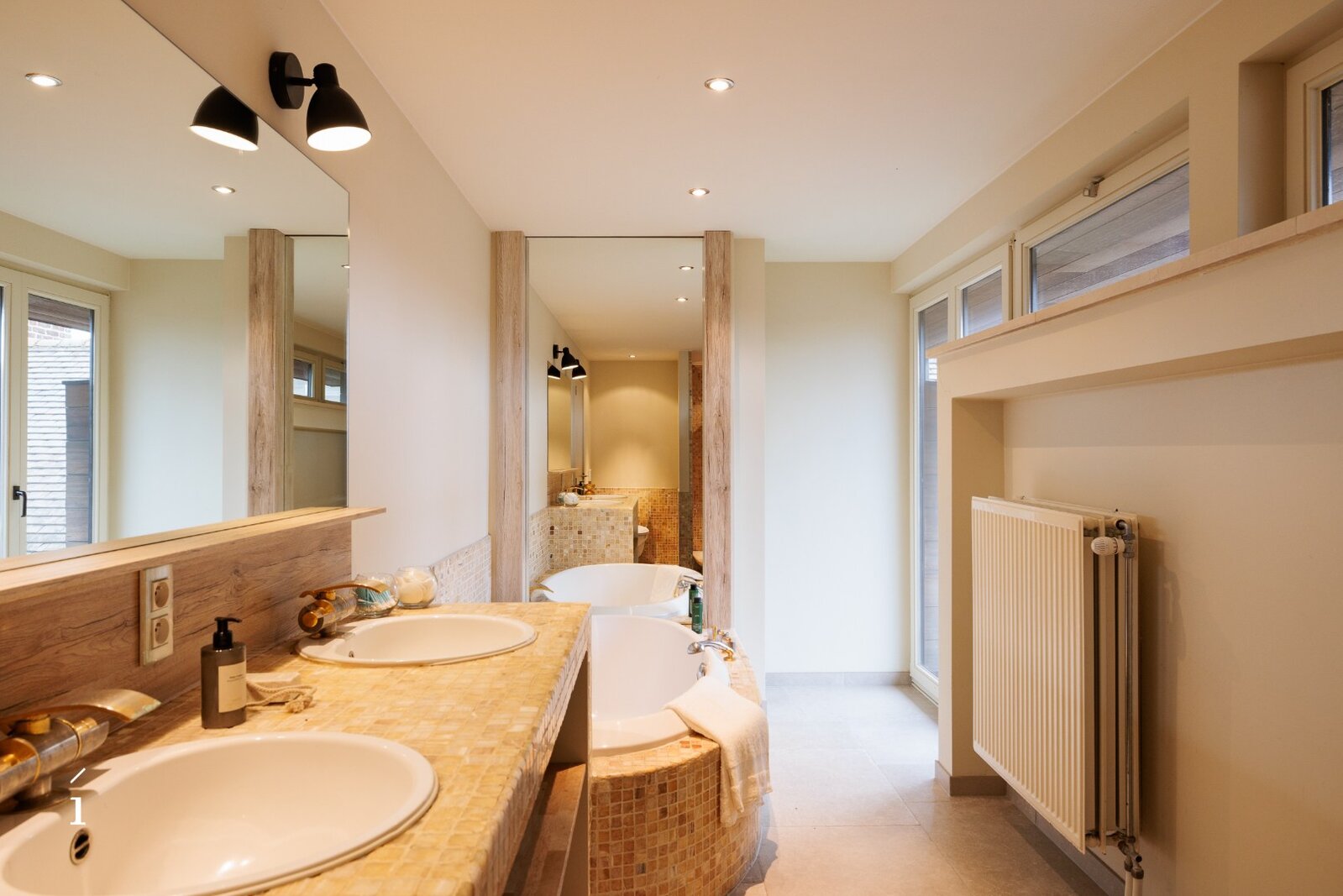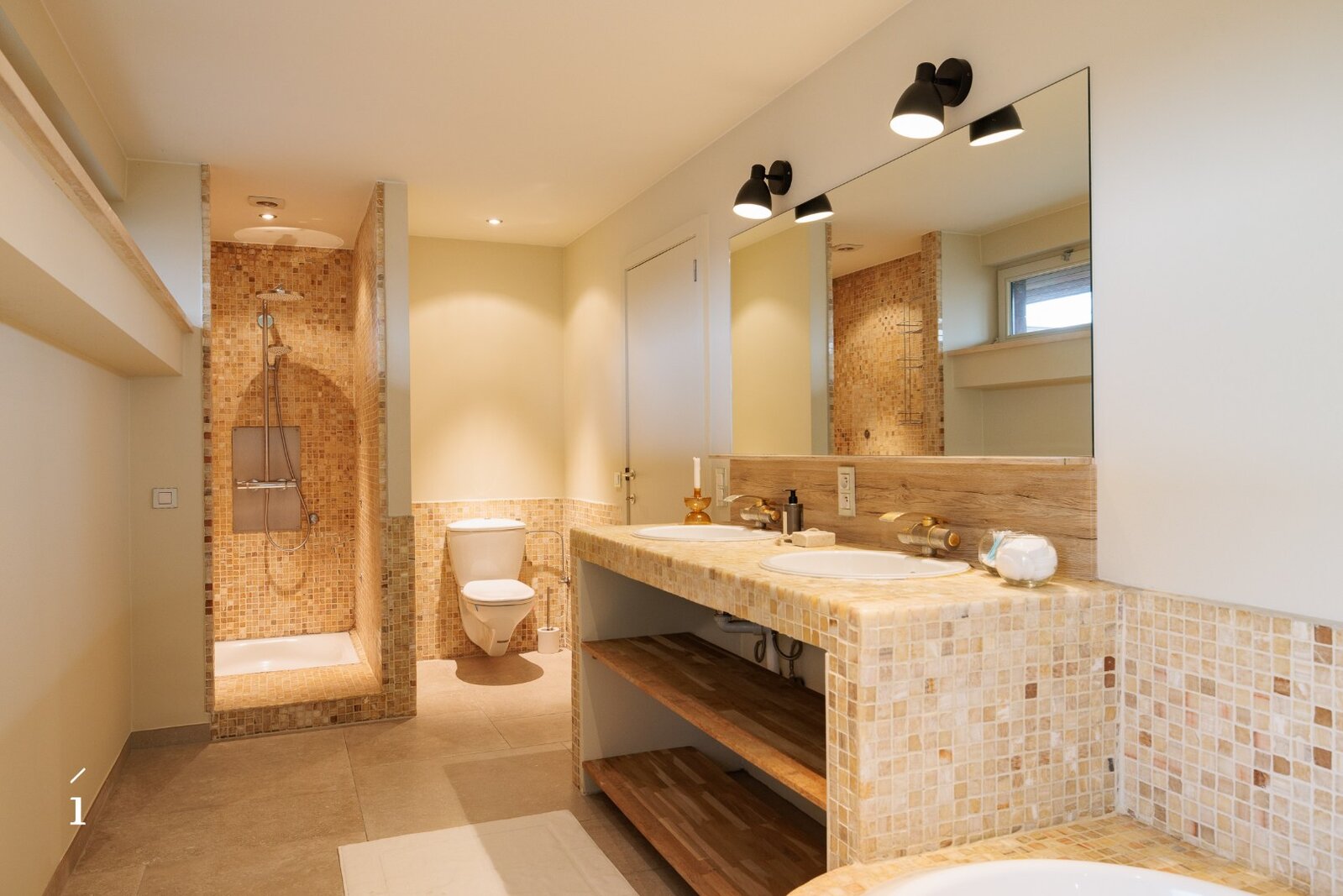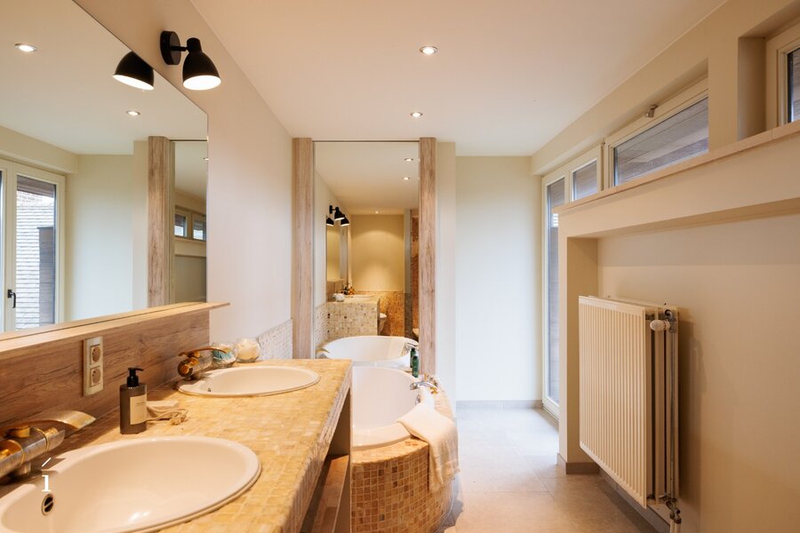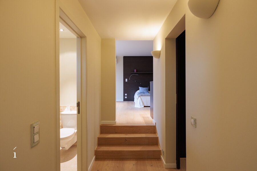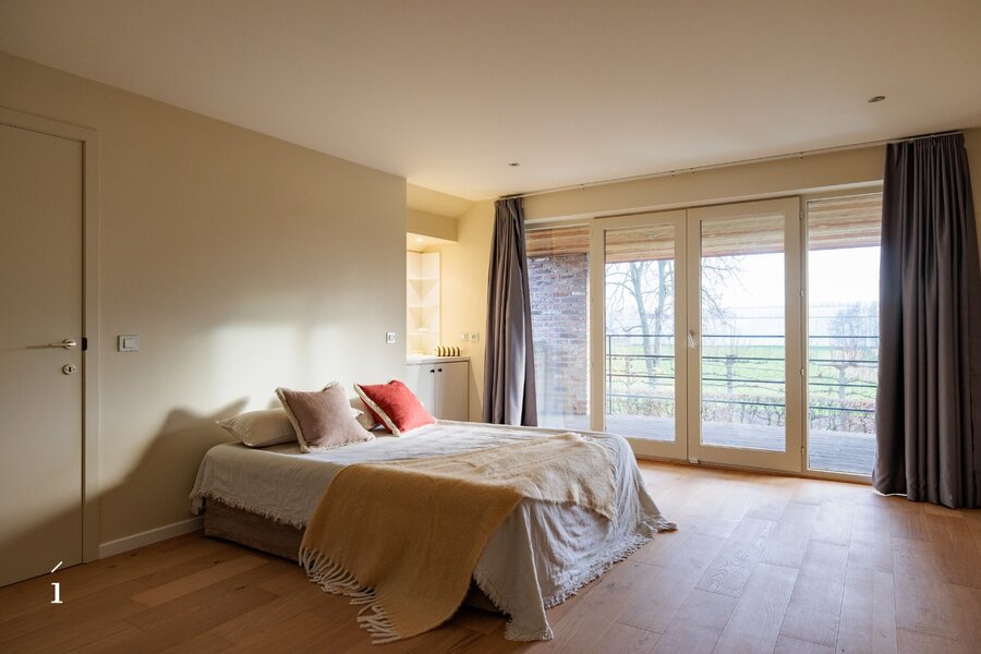 De bovenverdieping telt drie slaapkamers en twee badkamers, afgewerkt in warme houttinten en natuurlijke materialen. De masterbedroom beschikt over een eigen terras, een dressing en een ensuite badkamer. Verzorgde mozaïektegels, dubbele lavabo’s en inloopdouches zorgen voor een rustgevende, verfijnde sfeer die perfect aansluit bij de rest van het interieur.
