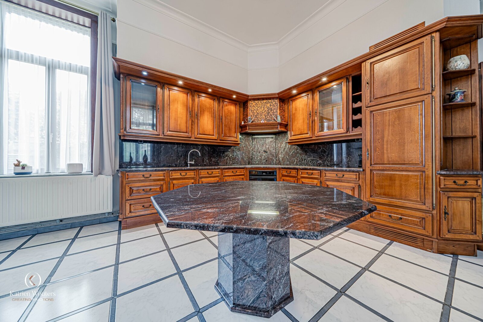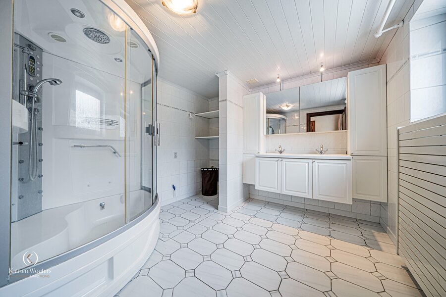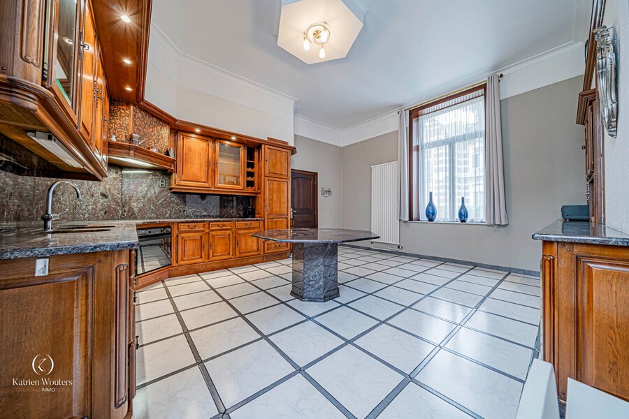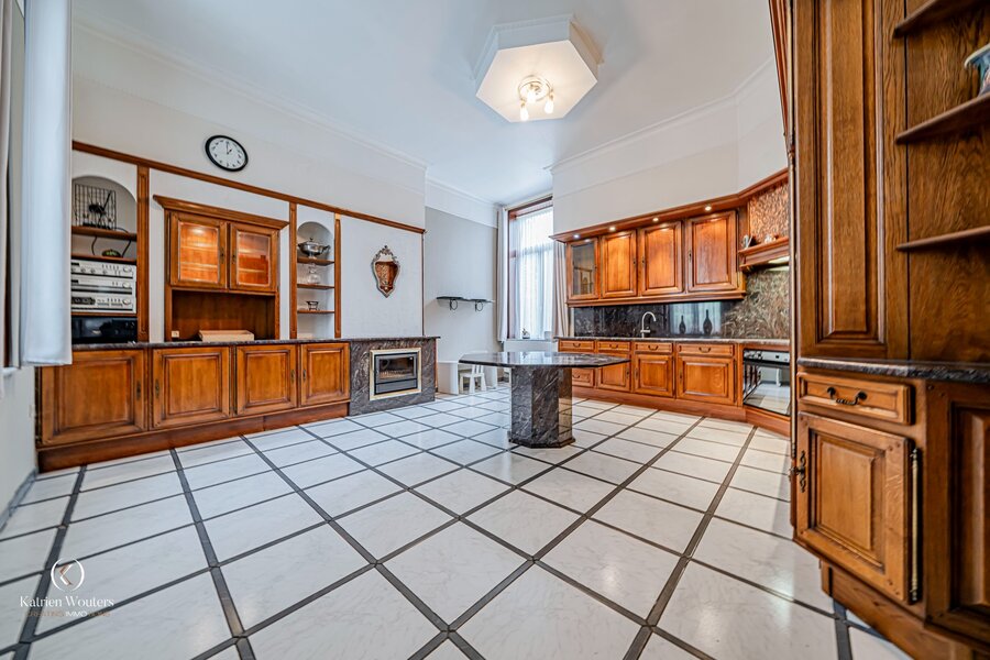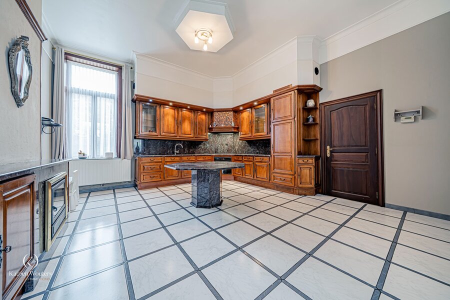 Als je binnenkomt via de adembenemende inkomhal begeef je je naar de imposante keuken met koperen accenten en een prachtig aanrecht, de living met kostbare details in de haardmantel en sierlijsten, en aansluitend de lichtrijke veranda. De badkamer is uitgerust met een luxueuze douche en dubbele lavabo.