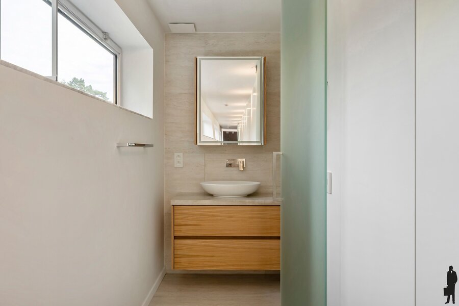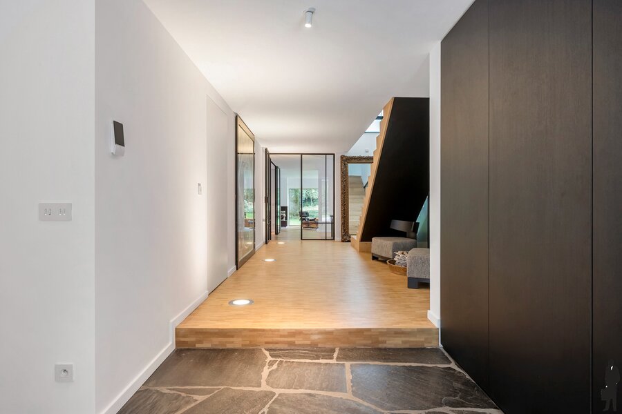 - Inkomhal op natuursteen met maatwerk ingemaakte kasten en gastentoilet met natuurstenen handenwasser