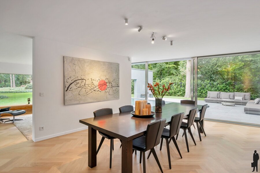- Eetkamer, afsluitbaar met stalen deur, aansluitend op de leefkeuken, eveneens met directe toegang tot terras en zwembad