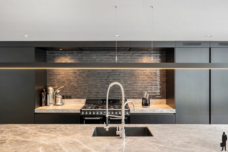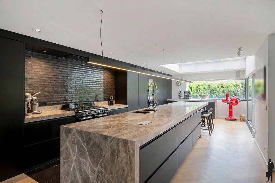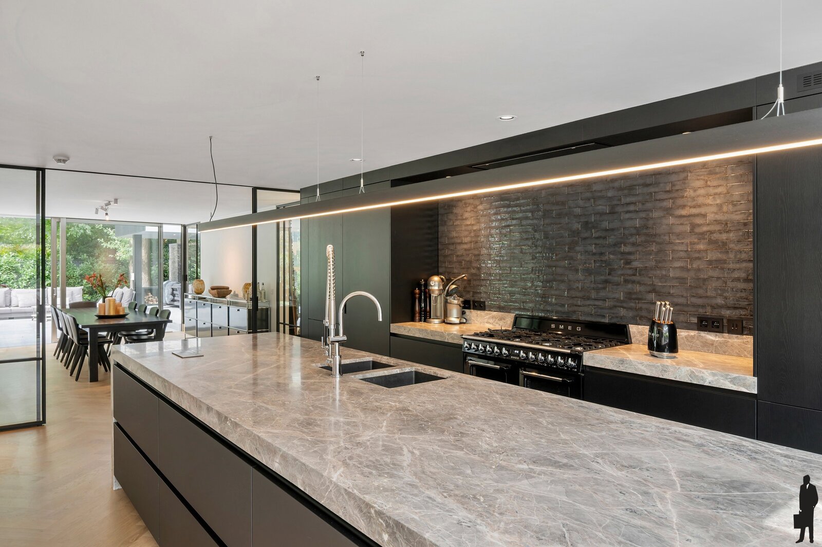 - Designkeuken met centraal Fior Di Bosco marmeren eiland en ingebouwde apparatuur: SMEG 7-pits gasfornuis, Venduro dampkap, 4 elektrische ovens, dubbele gootsteen, dubbele Whirlpool (ijskast & diepvriezer), 2 Miele vaatwassers en een wijnklimaatkast van AVintage