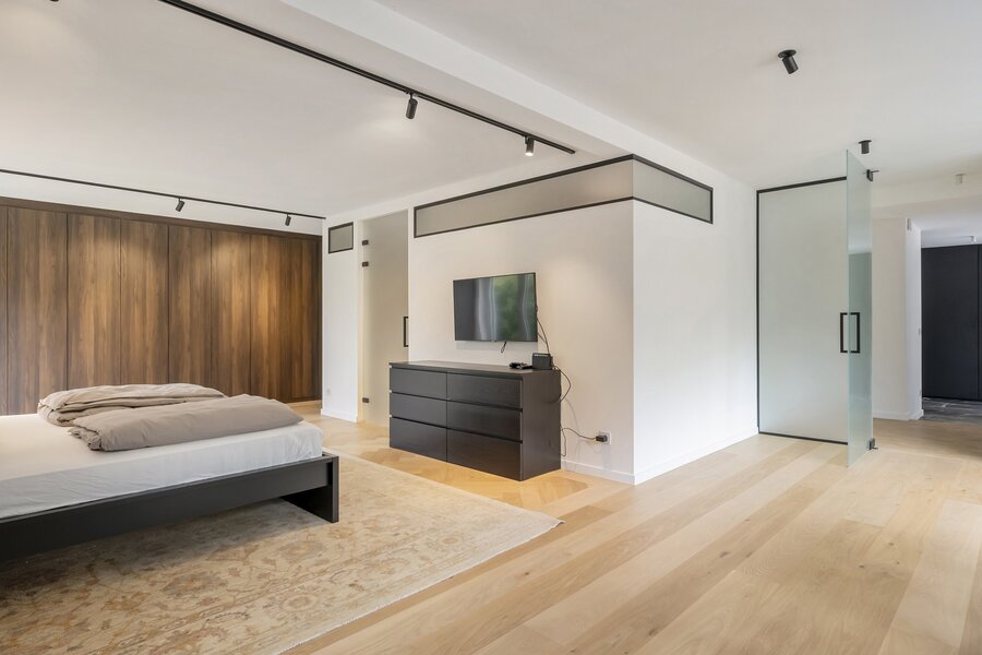 - Hoofdslaapkamer op parket, maatwerkkasten, dressing en ensuite badkamer met inloopdouche, dubbele lavabo, ligbad, toilet en toegang tot het dakterras