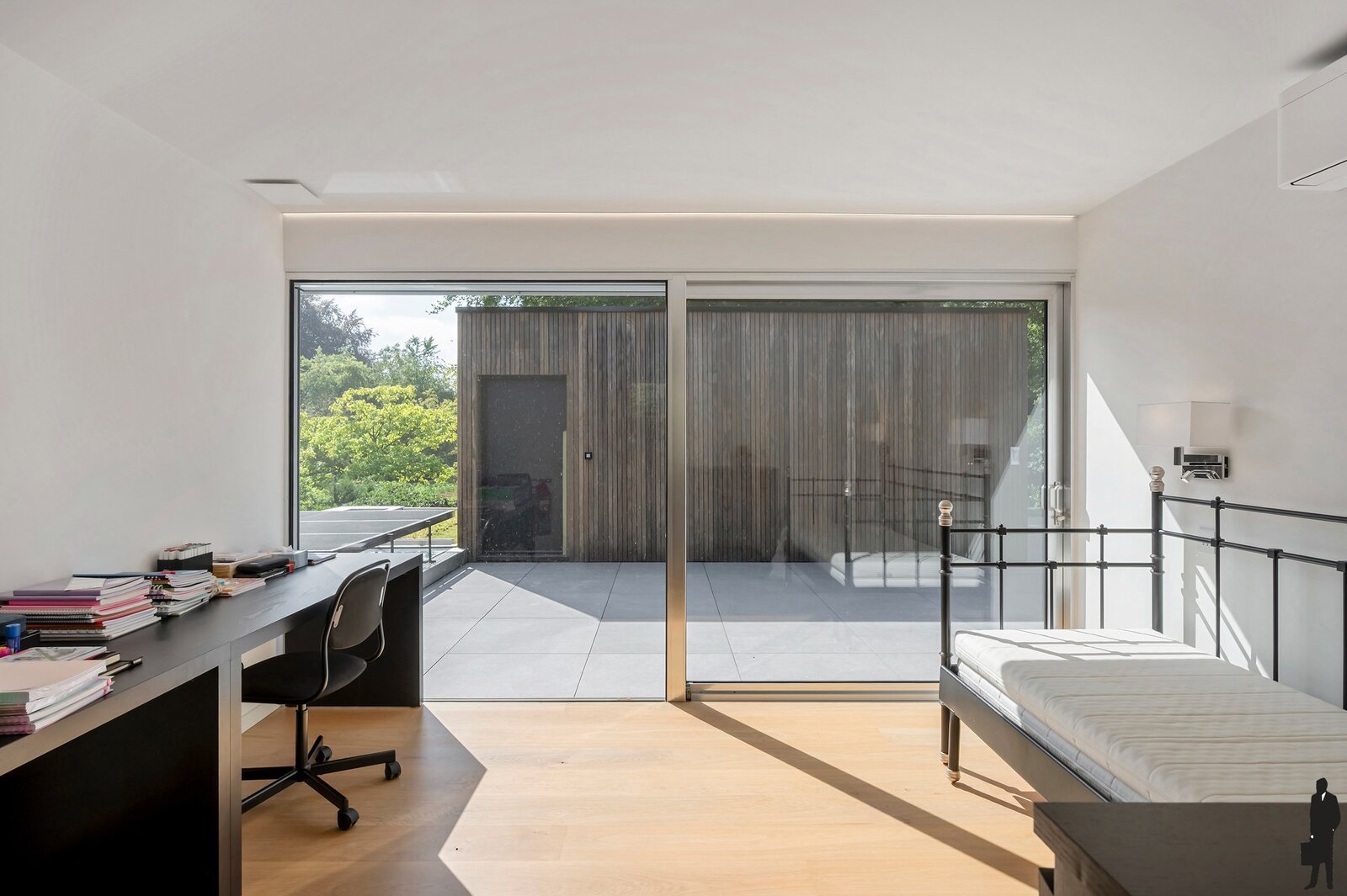 - Hobbykamer op parket, met ingemaakte kasten, schuifraam naar terras en stalen deur naar bureau