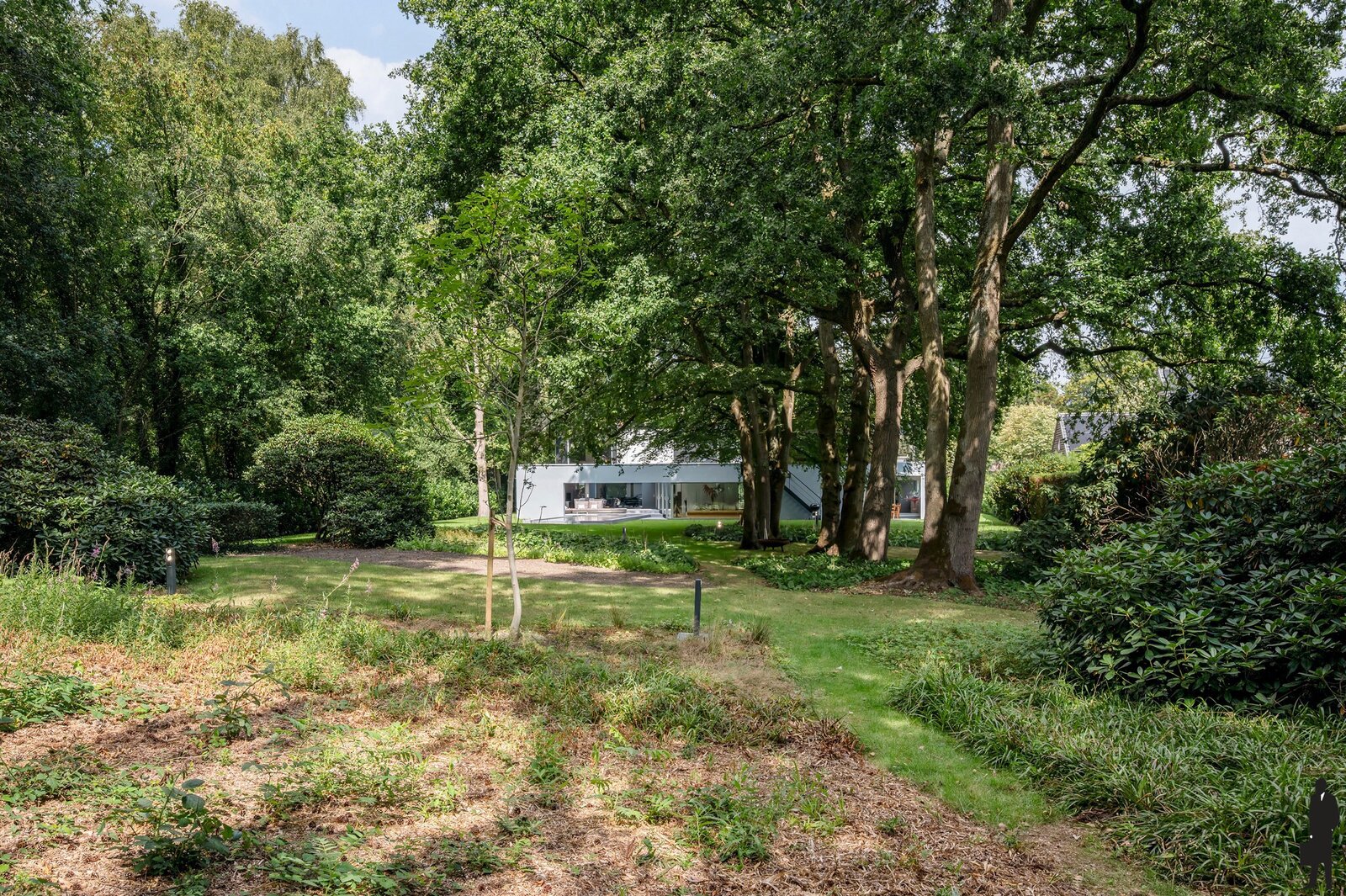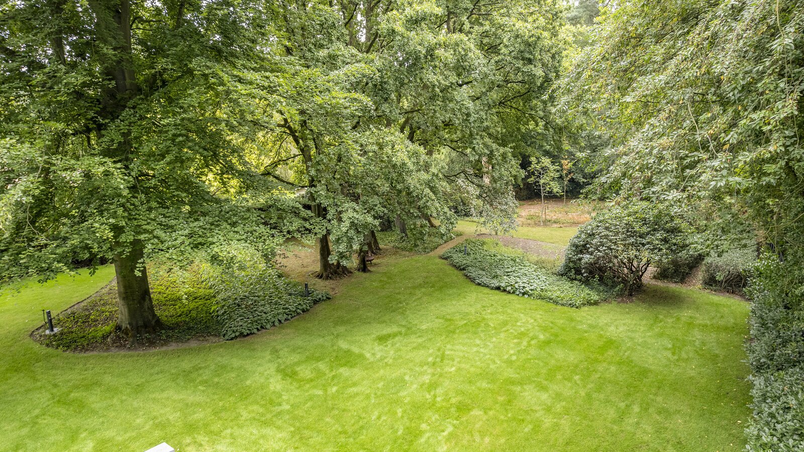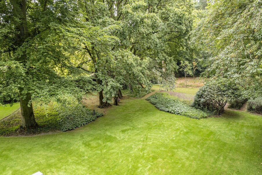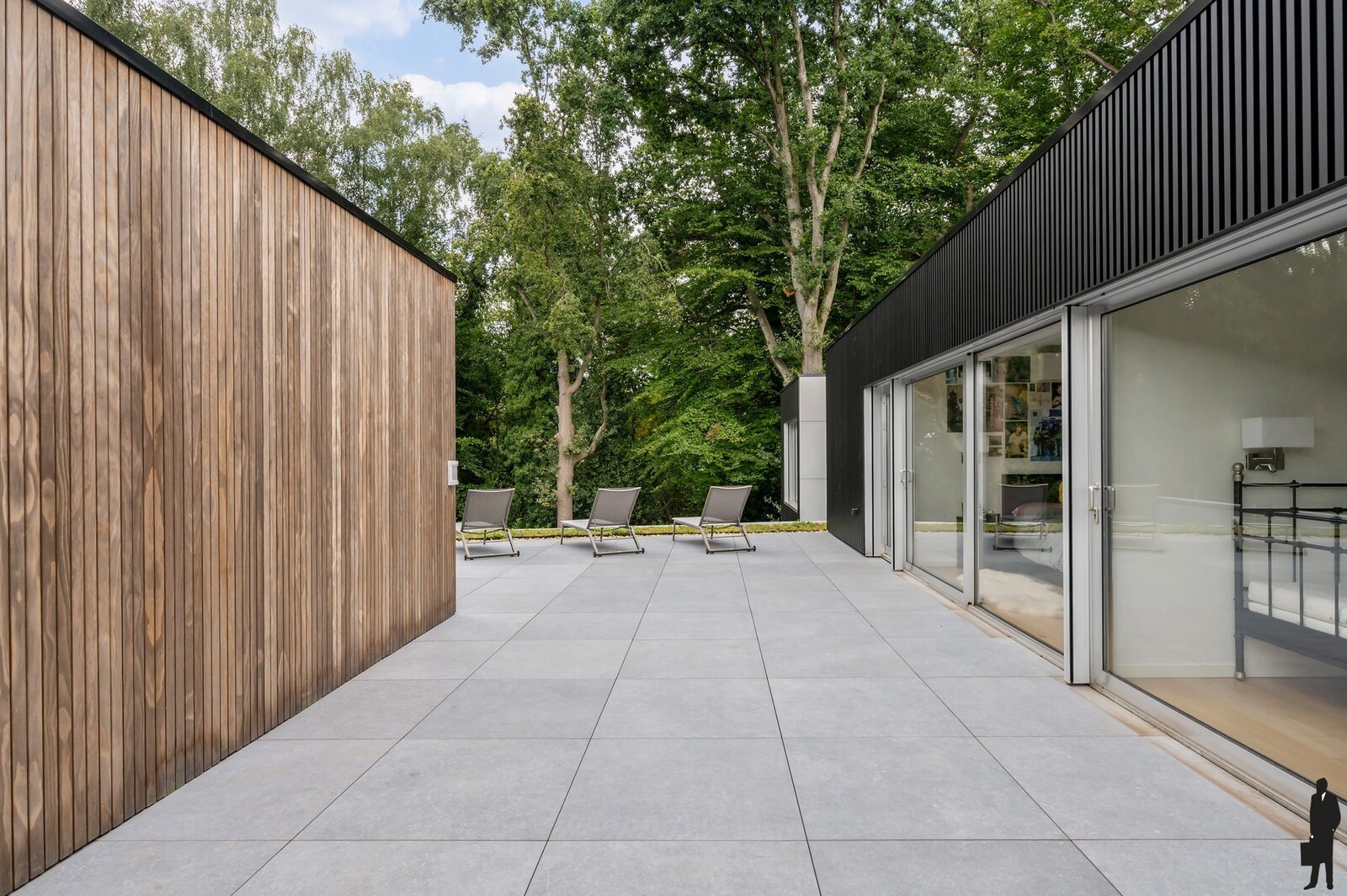 - Overdekt terras met haard en geïntegreerde muziekboxen, omgeven door weelderig groen en volwassen oude bomen